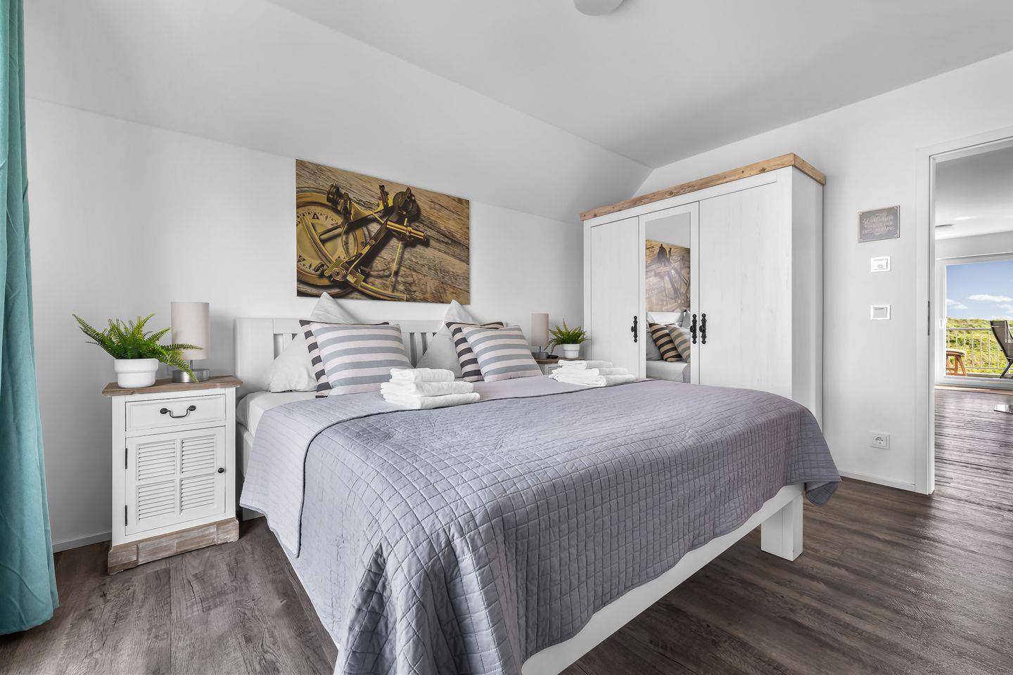 Das Hauptschlafzimmer hat ein King-Size-Doppelbett und das zweite Schlafzimmer bietet zwei Einzelbetten. Der Wohnbereich mit Kamin und Flachbildfernseher sorgt für Gemütlichkeit, die offene Küche ist voll ausgestattet. Das Bad bietet Whirlpool-Badewanne und Infrarot-Sauna. Für Kinder gibt es Reisebett, Hochstuhl, Tritthocker und Spielsachen. Der Balkon hat Gartenmöbel, Strandkorb, Sonnenschirm und Grill. PKW-Stellplatz und Fahrradschuppen sind vorhanden. Perfekt für Familien und Paare!