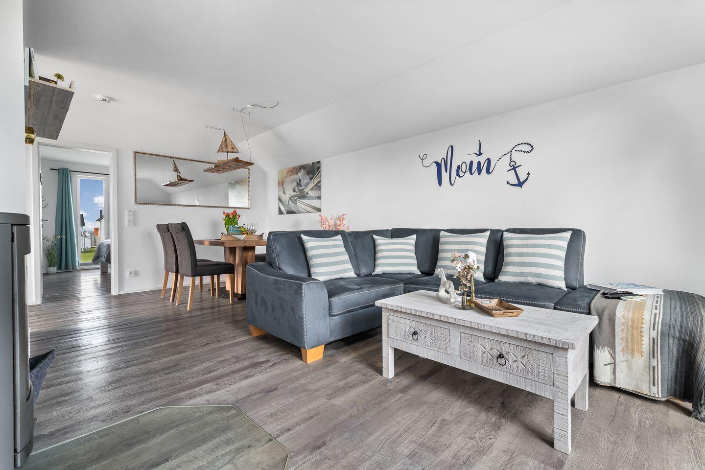 Bis zu vier Personen und drei Hunde finden hier ausreichend Platz in zwei Schlafzimmern sowie in einem offenen Wohn-, Ess- und Küchenbereich. Von hier aus führen zwei bodentiefe Terrassenfenster auf die Ostterrasse mit Meerblick. Der große Strandkorb mit Bullaugen ermöglicht es Dir auch bei Wind und niedrigeren Temperaturen gemütlich draußen zu sitzen und den Zugvögeln zuzusehen.