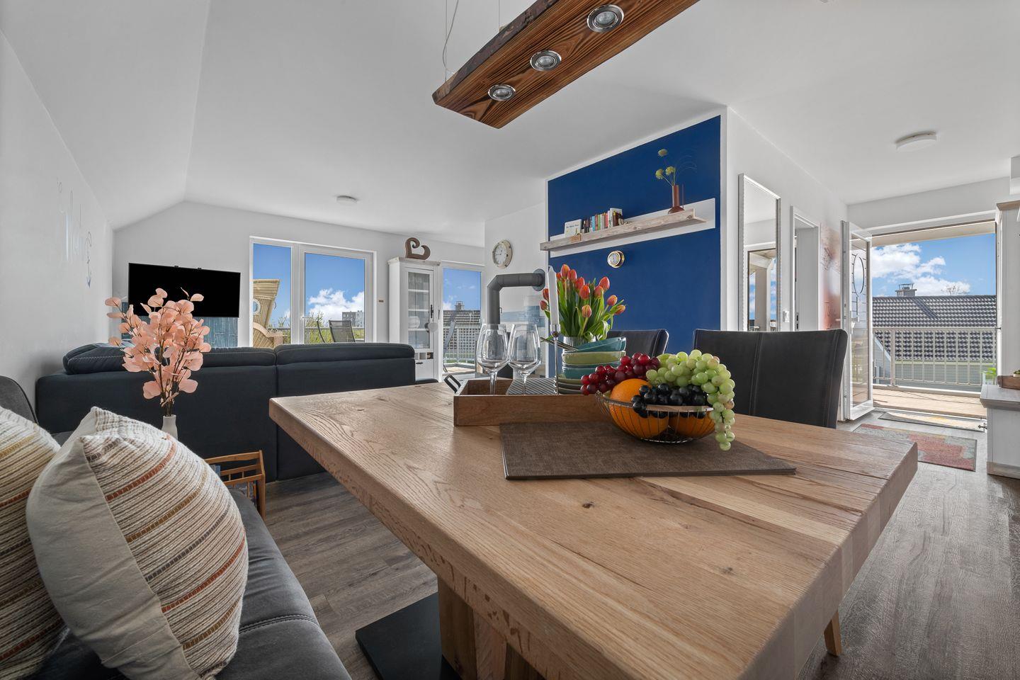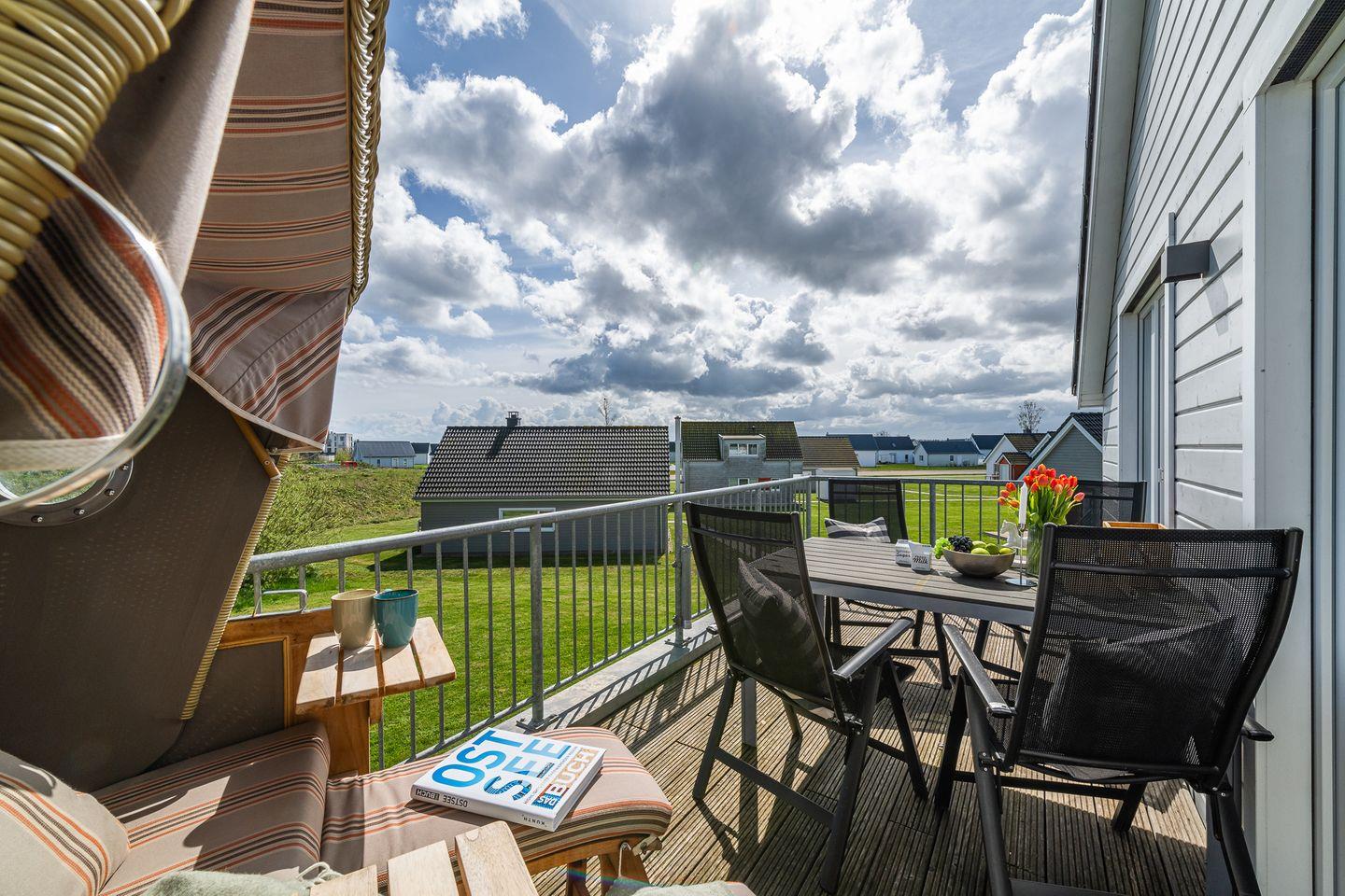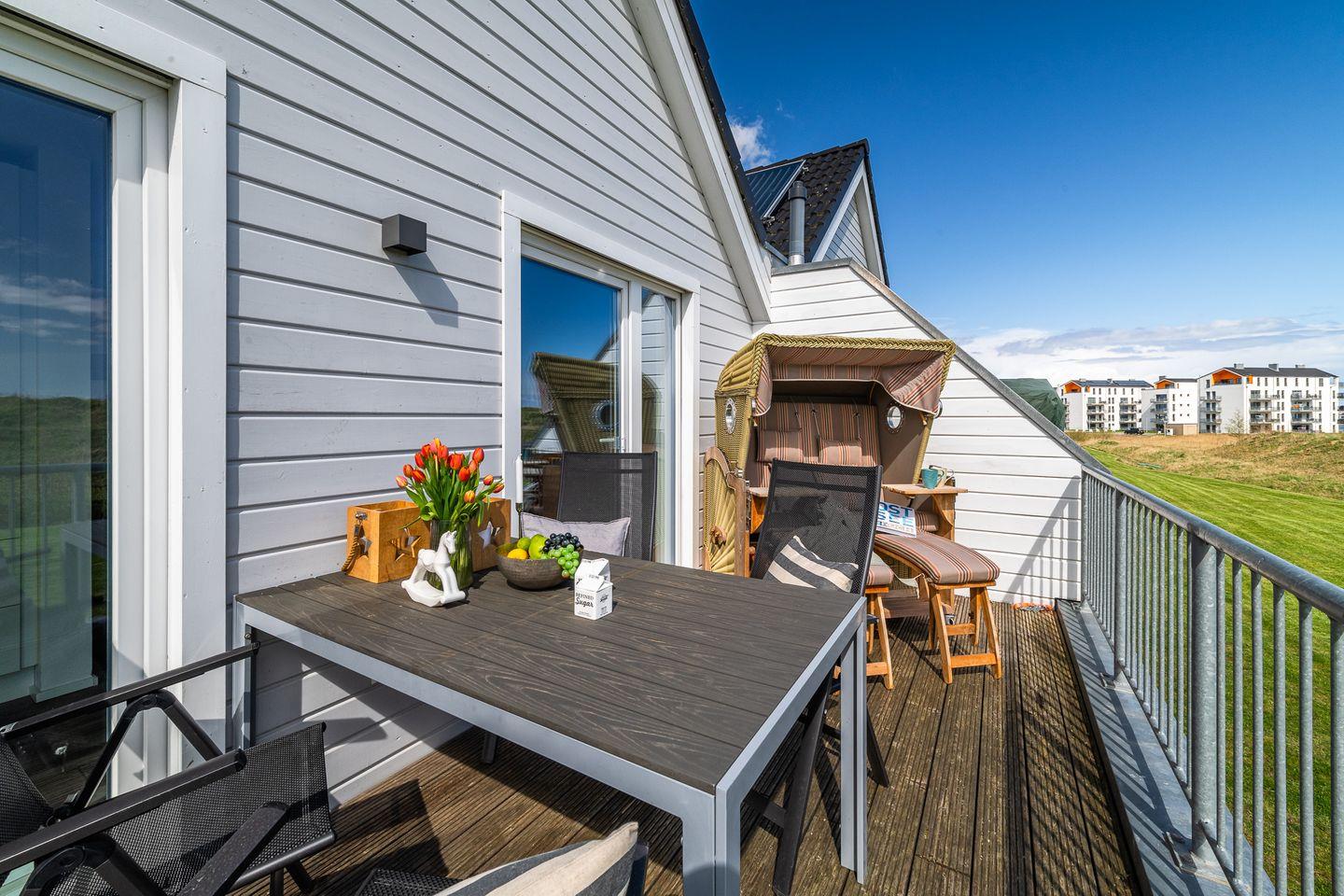 In südlicher Richtung findest Du den Zugang zur zweiten Terrasse, die überdacht ist und mit gemütlichen Holzmöbeln ausgestattet wurde. Von hier aus kannst Du den Sonnenuntergang in Richtung Hafen erleben. Das große L-Sofa ist mit Blick Richtung Ostsee ausgerichtet. Ein Smart-TV mit Netflix-Zugang sowie vielen weiteren Funktionen steht Dir zur Verfügung. Für die Kleinen gibt es Kinderbücher und diverses Spielzeug. Ein Fernglas hängt für Dich griffbereit an der Wand.