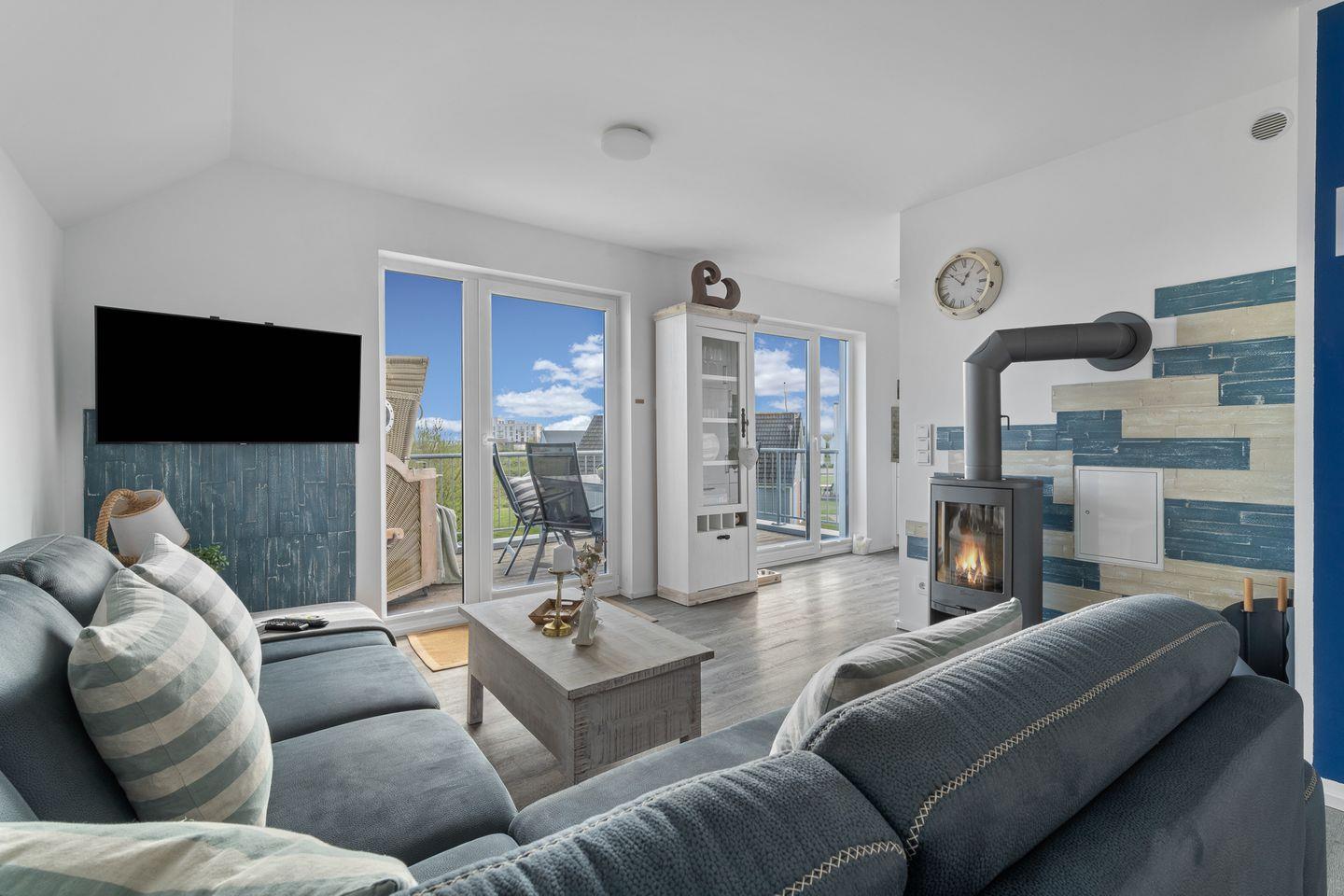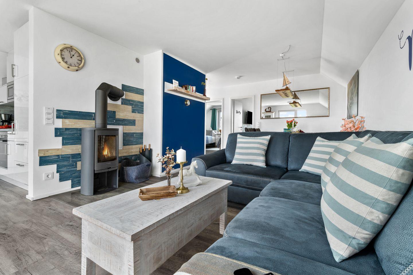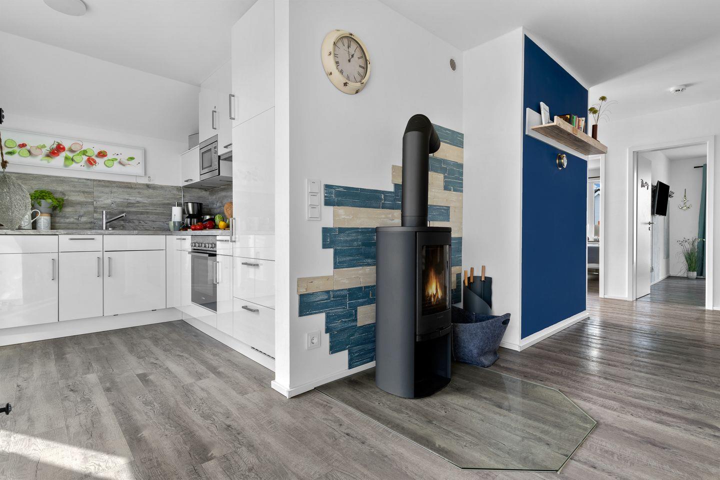 Die Ostsee und insbesondere dieses Apartment sind auch für die Wintermonate hervorragend geeignet. Ein Kaminofen und eine Infrarot-Sauna nach einem ausgiebigen Spaziergang – was will man mehr. Für diese Jahreszeit haben wir zudem ein stimmungsvolles, indirektes Lichtkonzept gestaltet, das sich im Wohn- und Essbereich entlang des Fußbodens sowie auf dem Bücherregal befindet und in allen Farben und Helligkeitsstufen geschaltet werden kann.