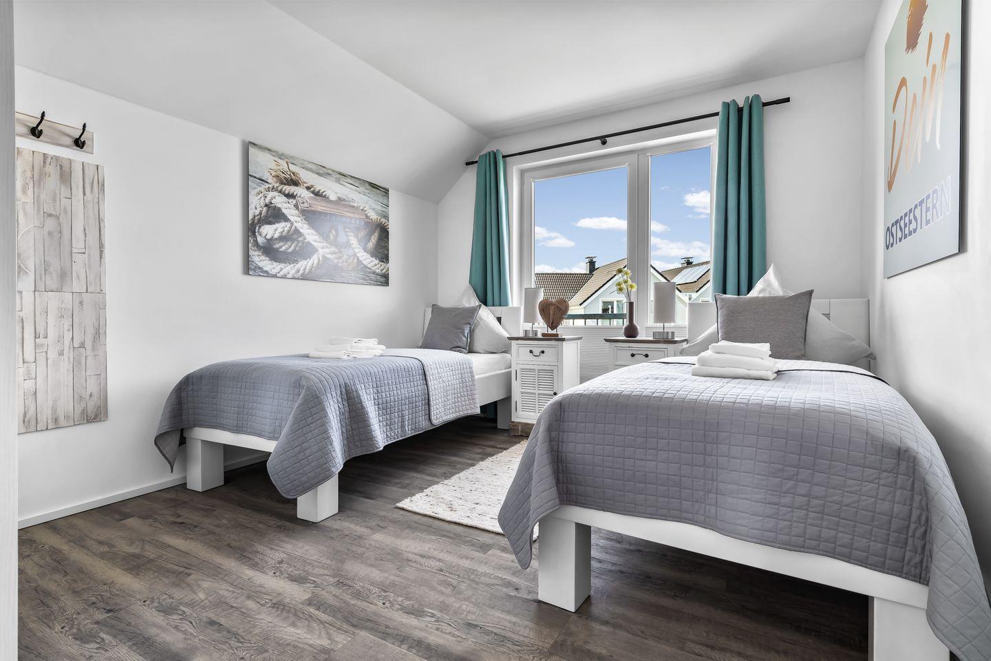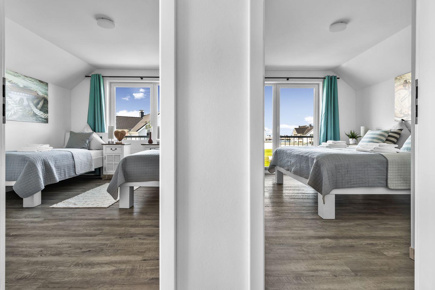 Es gibt ein Schlafzimmer mit Doppelbett (200x200 cm) und TV sowie ein zweites Schlafzimmer mit zwei Einzelbetten (90x200 cm), die bei Bedarf zu einem Doppelbett zusammengeschoben werden können. Gemütliche skandinavische Betten mit hohem Einstieg und hochwertigen Matratzen waren hier die erste Wahl.