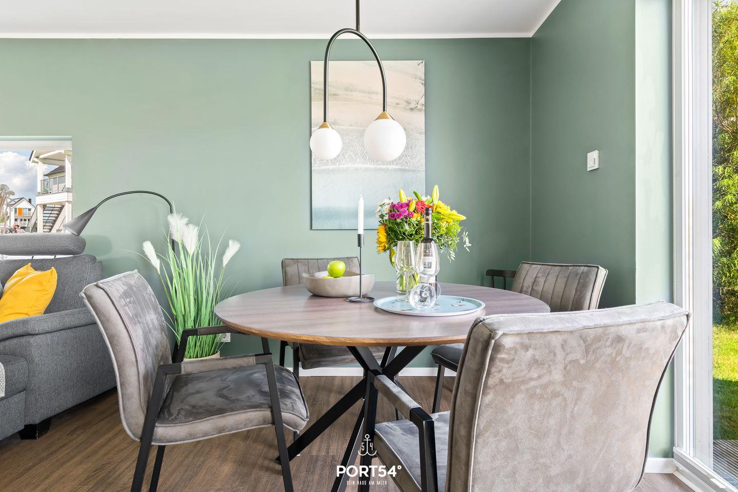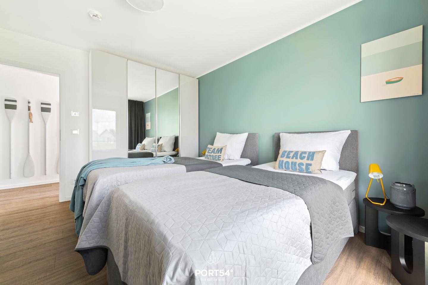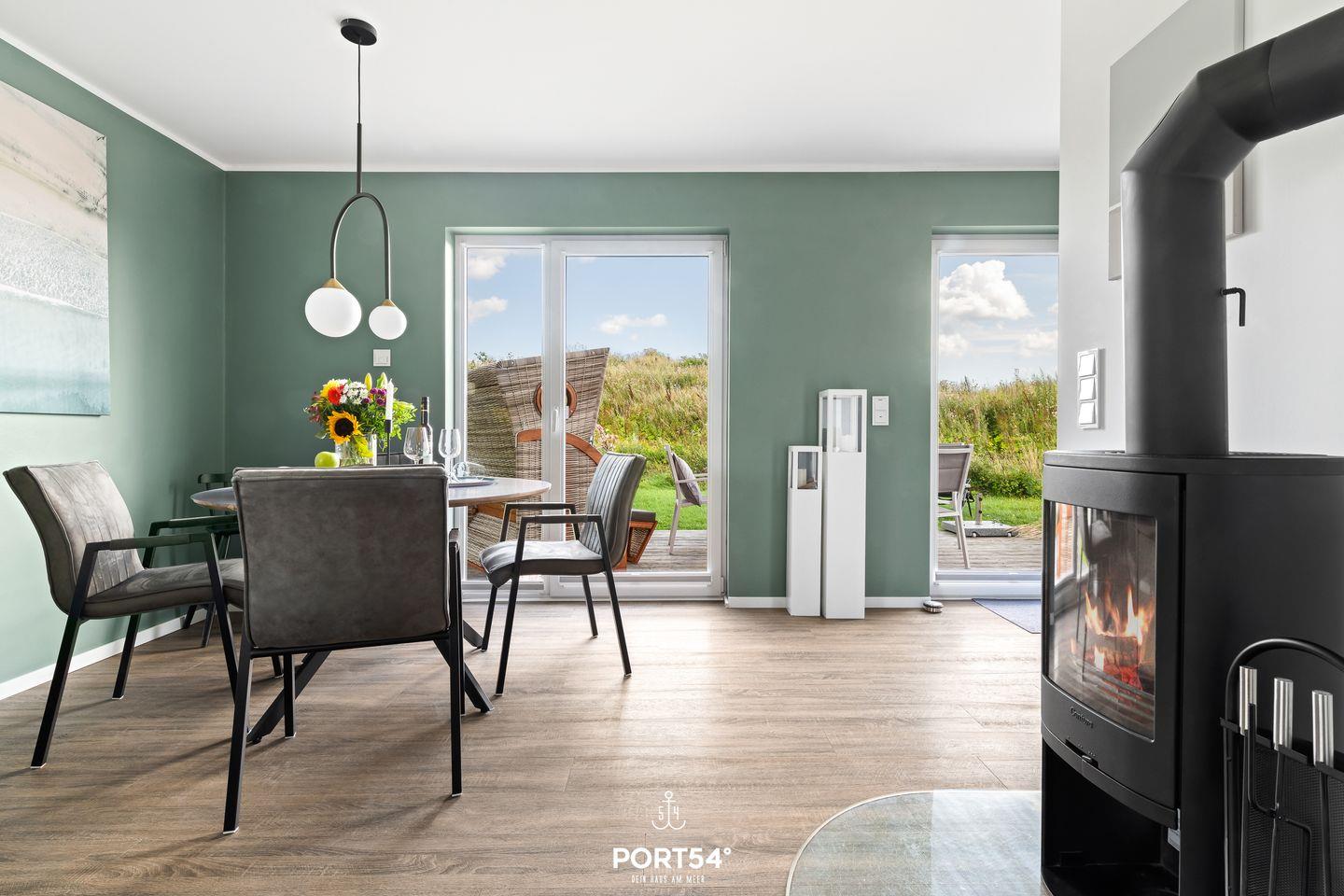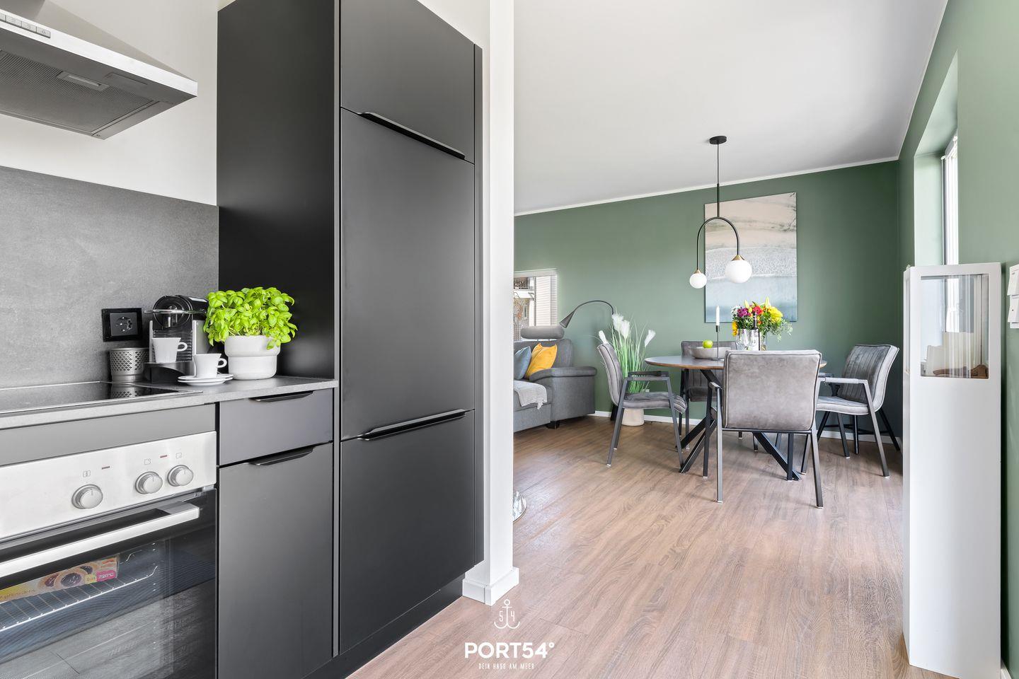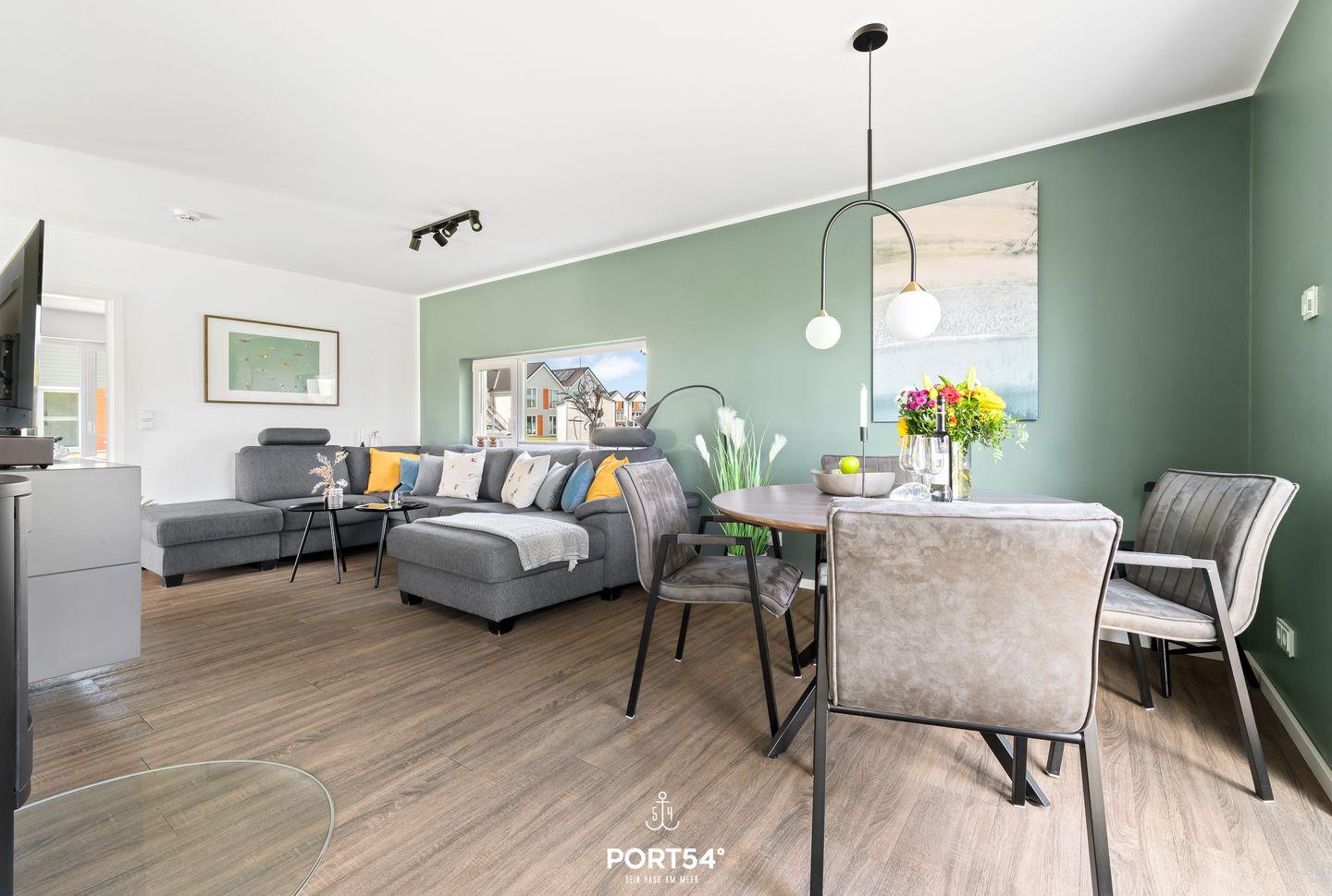 Mit rund 76 m² bietet Dir die Wohnung neben zwei Schlafzimmern einen Wohn- und Essbereich mit angrenzender, offener Küche sowie ein Badezimmer. Die lichtdurchflutete Wohnung ermöglicht Dir einen Urlaub mit bis zu fünf Personen. Neben einem Doppelbett (180x200 cm) und zwei Einzelbetten (je 90x200 cm) steht Dir im Wohnbereich eine gemütliche Schlafcouch zur Verfügung. Hier kannst Du ebenso gesellige Abende vor dem Kamin verbringen.