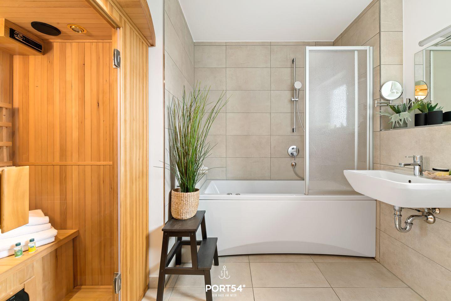 Das moderne Badezimmer verfügt über eine Infrarot-Sauna sowie eine Whirlwanne, in der Du es Dir zu jeder Jahreszeit gemütlich machen kannst. Die möblierte Terrasse ist perfekt für einen entspannten Grillabend im Sommer. Lehne Dich zurück und lasse Deinen Alltag hinter Dir. Die Terrasse bietet Dir mit drei Loungesesseln sowie zwei vorhandenen Relaxliegen die ideale Gelegenheit zum Entspannen.