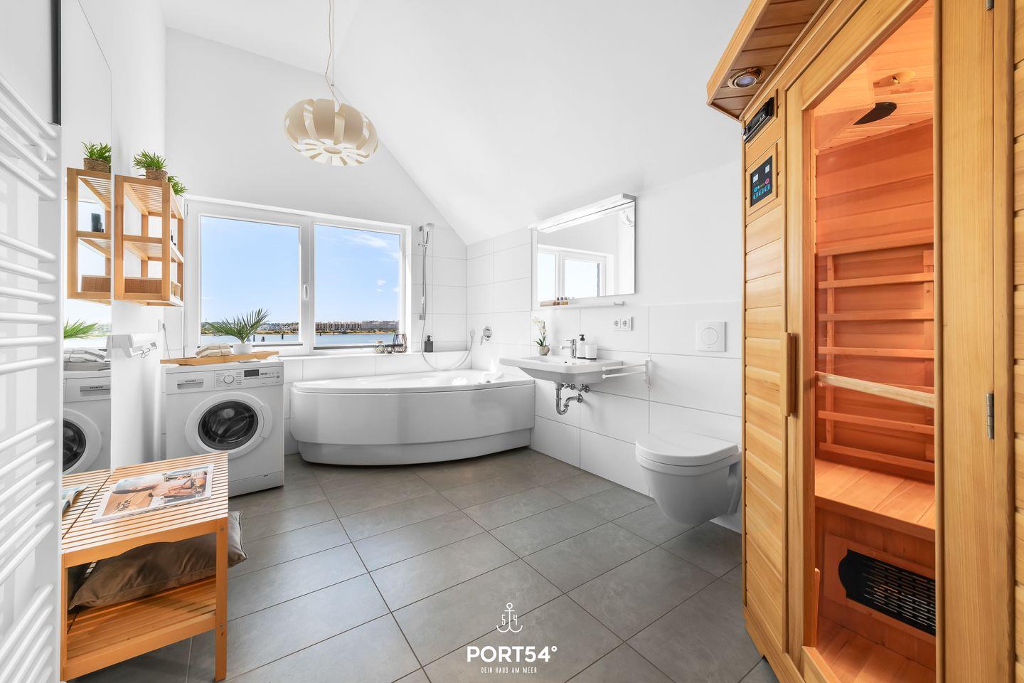 Ebenfalls auf dieser Etage befindet sich ein großzügiges Badezimmer. Genieße den traumhaften Ausblick aus der Whirlwanne oder erhole Dich in der privaten Infrarot-Wärmekabine.