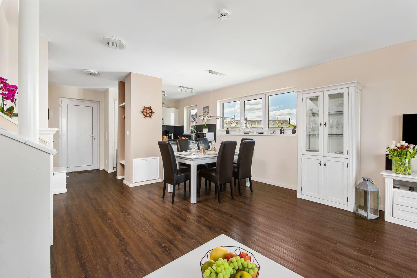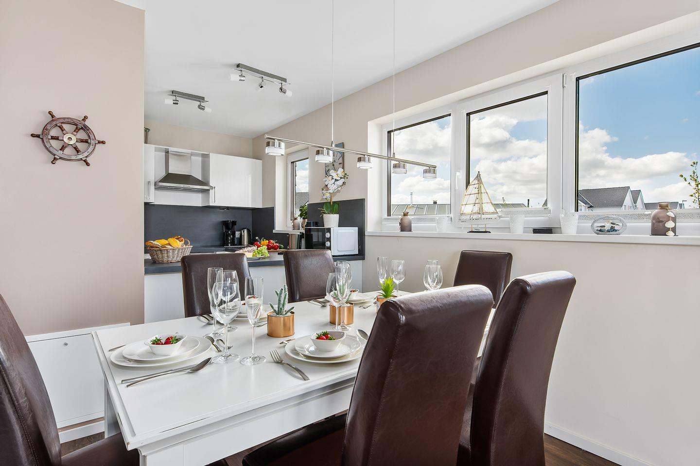 Direkt am Hafenbecken gelegen, eröffnet sich Dir vom großzügigen Wohn- und Essbereich mit offener Küche ein atemberaubender Blick auf die Marina, der sofort Urlaubsstimmung aufkommen lässt.
