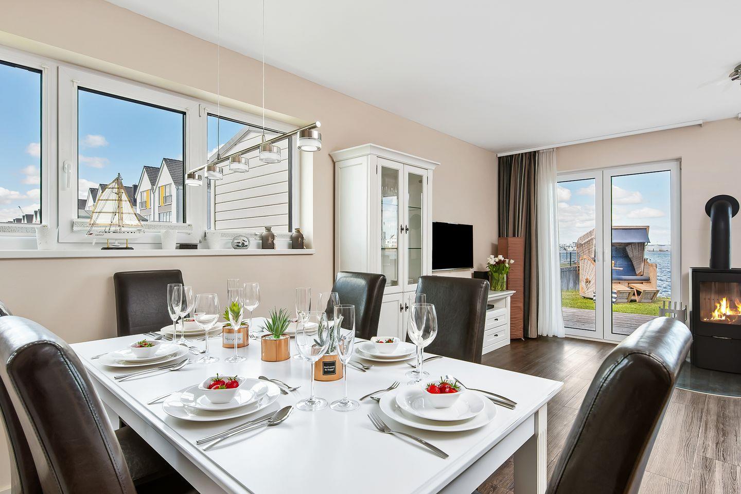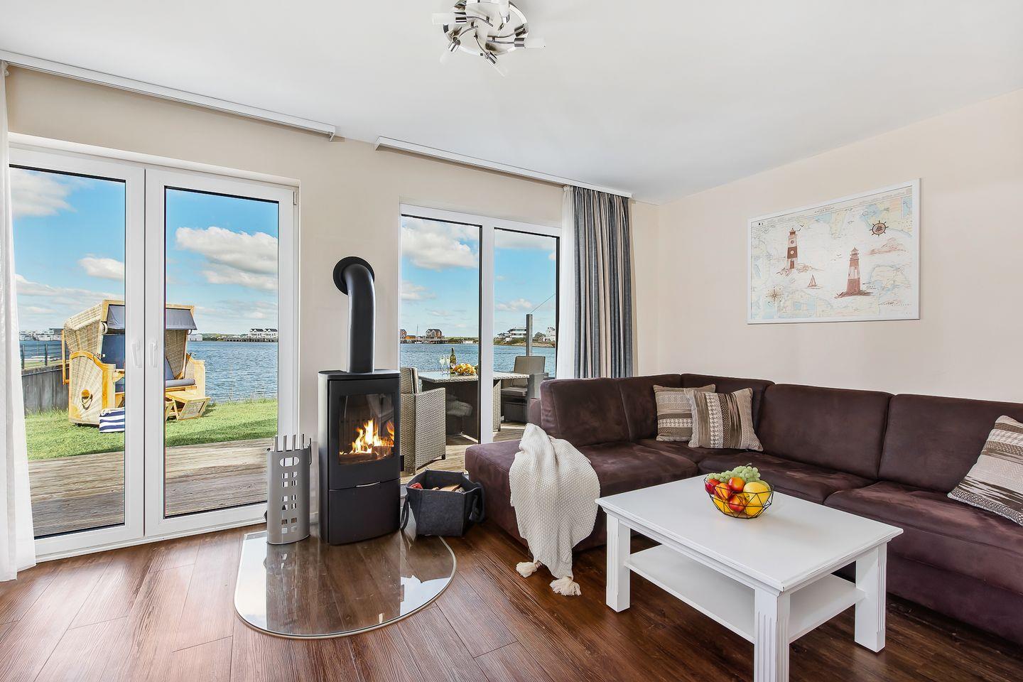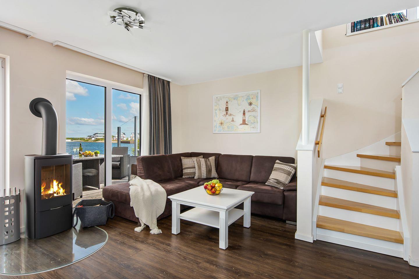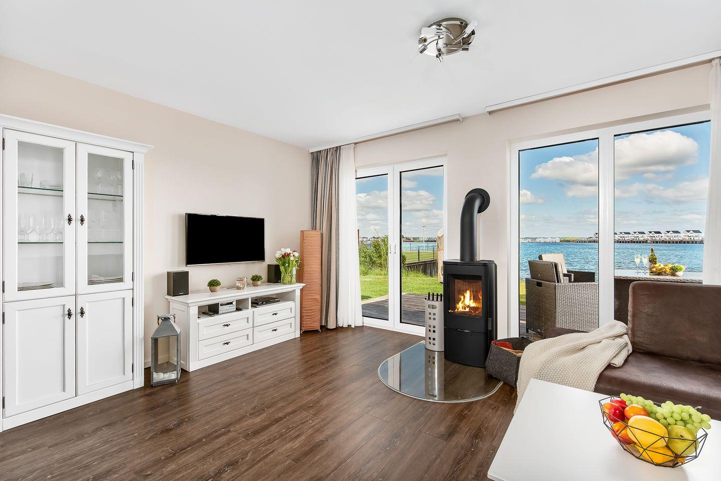 Der gemütliche Wohnbereich lädt Dich mit einem knisternden Kamin, einem Flachbildfernseher und einem Blu-ray-Player zu entspannten Filmabenden ein. Dank der bodentiefen Fenster ist der Raum lichtdurchflutet und bietet Dir einen direkten Zugang zur Terrasse.