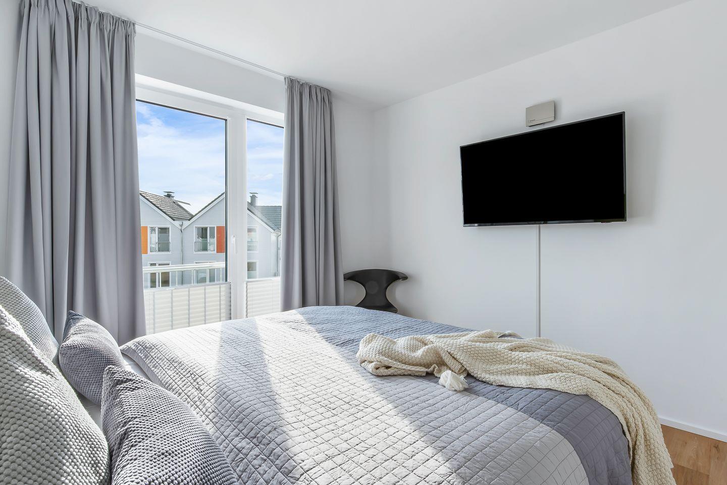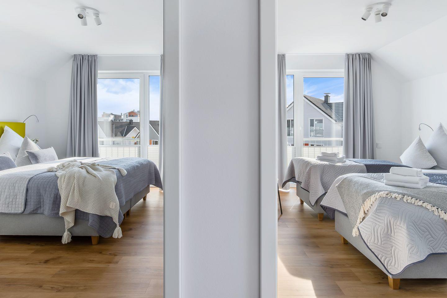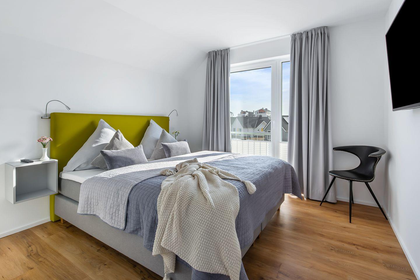 Diese moderne und stilvoll eingerichtete Ferienwohnung bietet Dir alles, was Du für einen unvergesslichen Aufenthalt an der Ostsee benötigst. Insgesamt bietet Dir die Ferienwohnung „Ocean Breeze“ Platz für bis zu vier Personen. Es stehen Dir zwei stilvoll eingerichtete Schlafzimmer zur Verfügung. Eines der Schlafzimmer ist mit einem Boxspring-Doppelbett in King-Size-Größe (200x200 cm) sowie einem Fernseher ausgestattet, sodass Du Dich hier in die neuesten Filme oder Serien vertiefen kannst. Das zweite Schlafzimmer bietet Dir zwei Boxspring-Einzelbetten (100x200 cm). Beide Schlafzimmer verfügen jeweils über einen Kleiderschrank sowie Verdunkelungsmöglichkeiten.