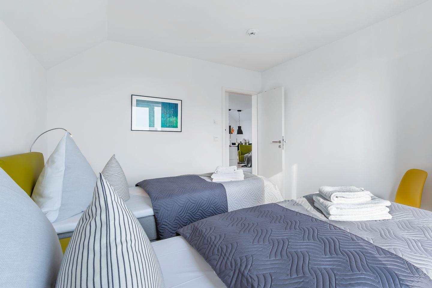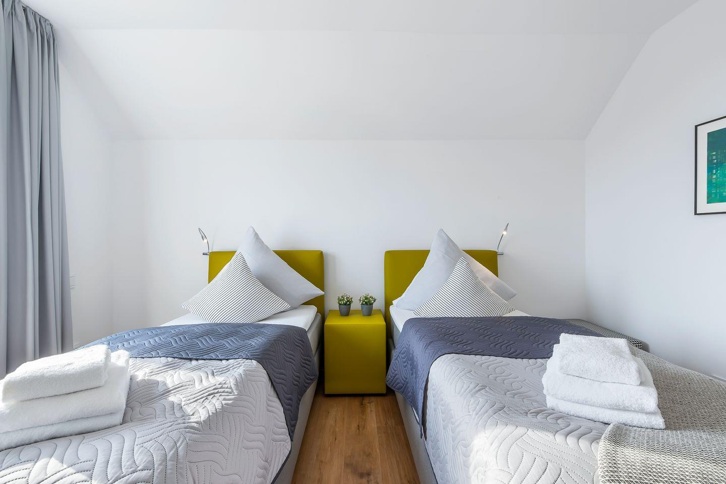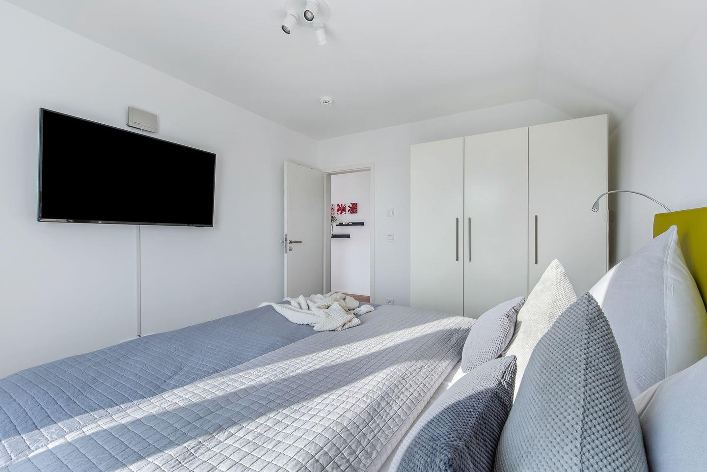 Diese moderne und stilvoll eingerichtete Ferienwohnung bietet Dir alles, was Du für einen unvergesslichen Aufenthalt an der Ostsee benötigst. Insgesamt bietet Dir die Ferienwohnung „Ocean Breeze“ Platz für bis zu vier Personen. Es stehen Dir zwei stilvoll eingerichtete Schlafzimmer zur Verfügung. Eines der Schlafzimmer ist mit einem Boxspring-Doppelbett in King-Size-Größe (200x200 cm) sowie einem Fernseher ausgestattet, sodass Du Dich hier in die neuesten Filme oder Serien vertiefen kannst. Das zweite Schlafzimmer bietet Dir zwei Boxspring-Einzelbetten (100x200 cm). Beide Schlafzimmer verfügen jeweils über einen Kleiderschrank sowie Verdunkelungsmöglichkeiten.