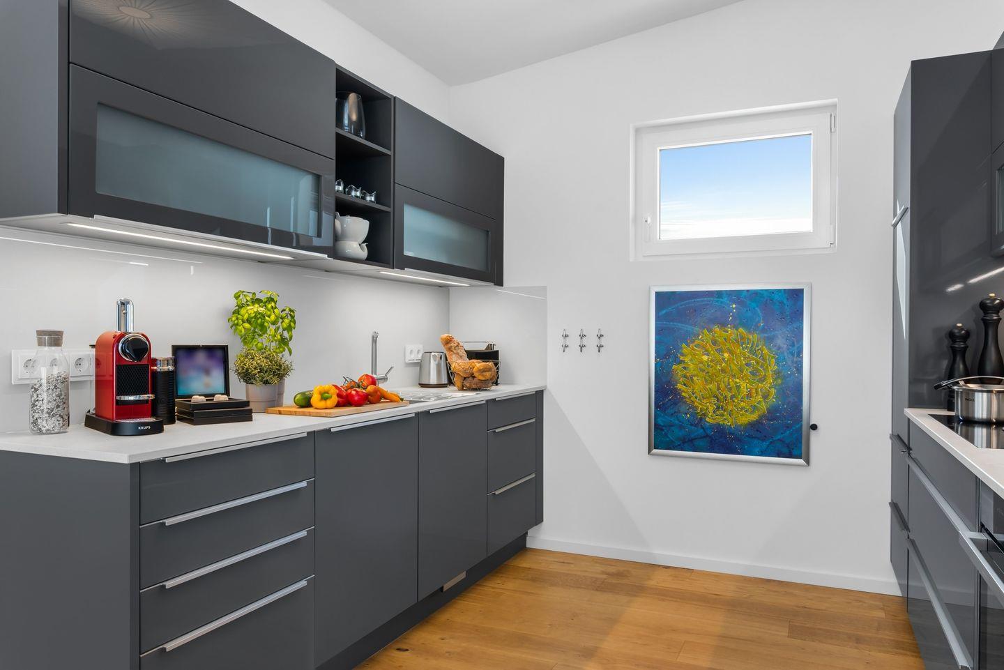 Die top ausgestattete Einbauküche ergänzt den Wohnbereich perfekt und verschönert Dein Urlaubsleben mit einem großen Induktionskochfeld, einer Mikrowelle, ausgewähltem Geschirr und einer Nespresso-Maschine.