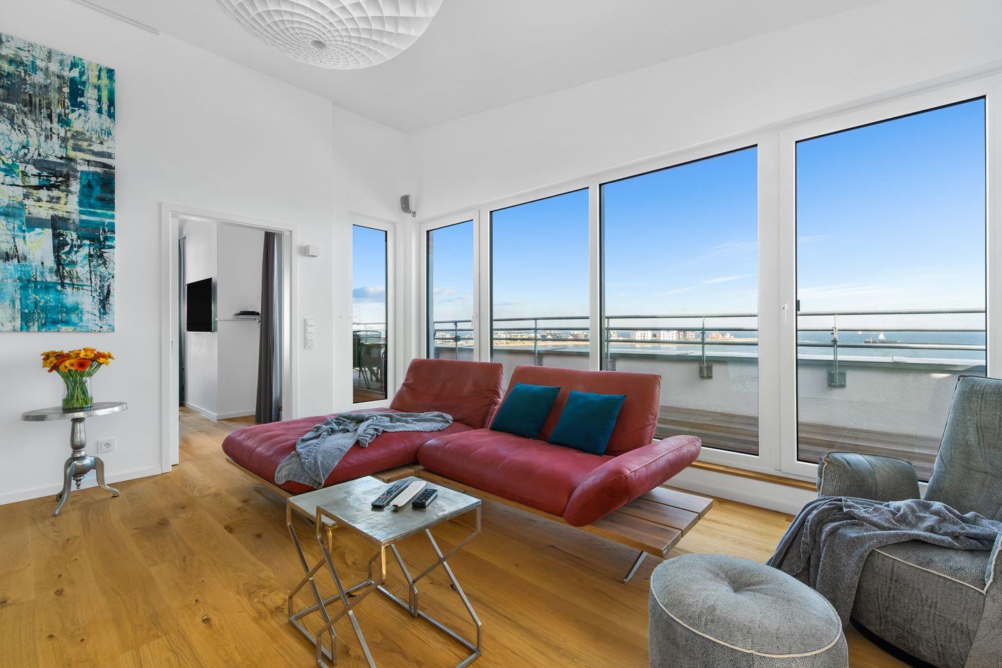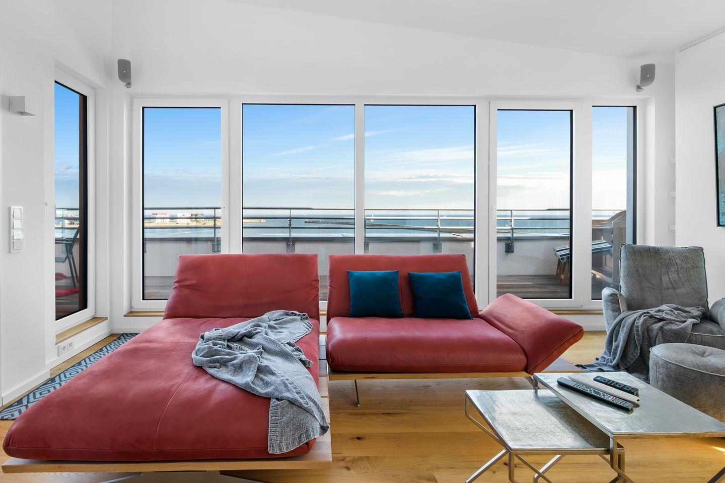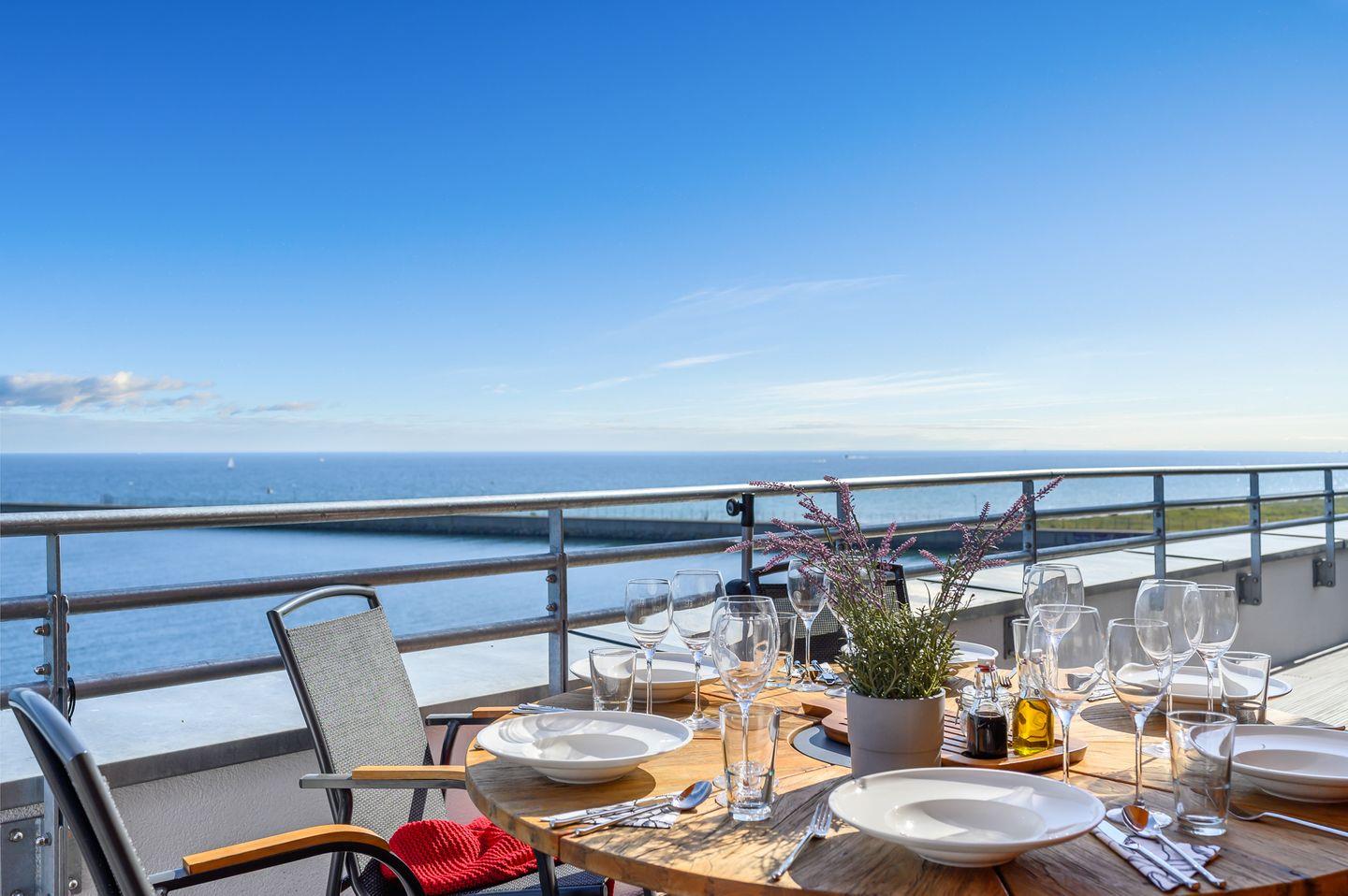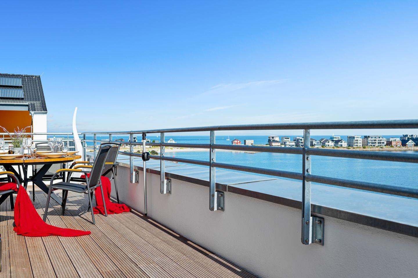 Eine private Aussichtsplattform bietet Dir einen unschlagbaren Blick auf die Hafeneinfahrt und die Ostsee.