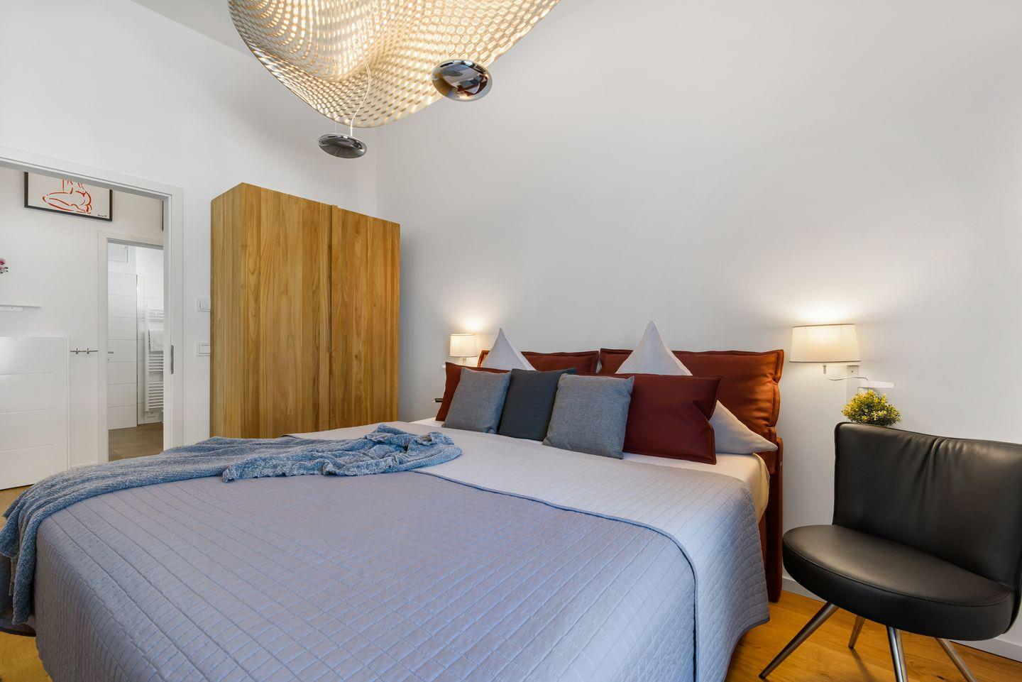 Auch in den zwei Schlafzimmern kannst Du es Dir gutgehen lassen. Diese sind jeweils mit einem gemütlichen Leder-Doppelboxspringbett und einem Fernseher ausgestattet.