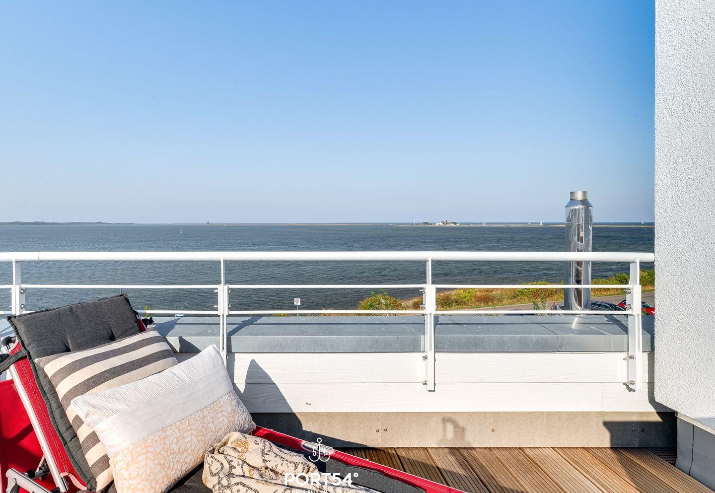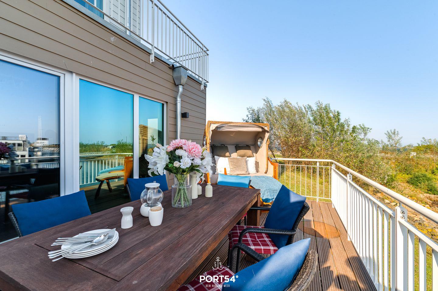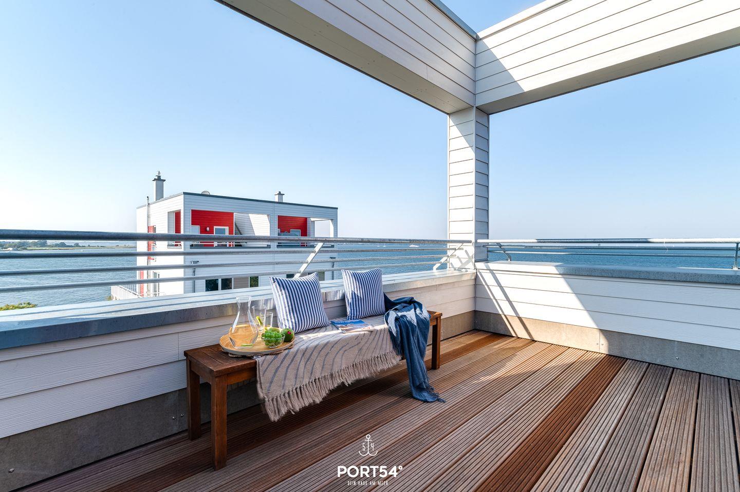Ein weiteres Highlight der Ferienwohnung ist die großzügige Dachterrasse, von der aus Du einen atemberaubenden Panoramablick über die Ostsee genießen kannst. Hier entspannst Du auf den bereitstehenden Gartenmöbeln, genießt die frische Meeresluft und lässt Deinen Blick über die traumhafte Küstenlandschaft schweifen. Insgesamt verfügt die Ferienwohnung inklusive der Dachterrasse über vier Terrassen, die Dir aus allen Richtungen einen wunderschönen Ausblick ermöglichen.