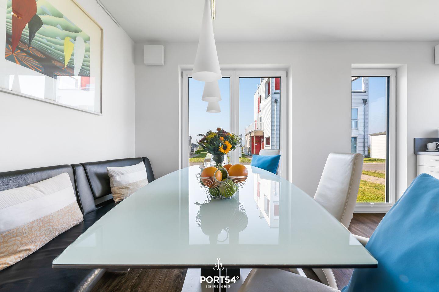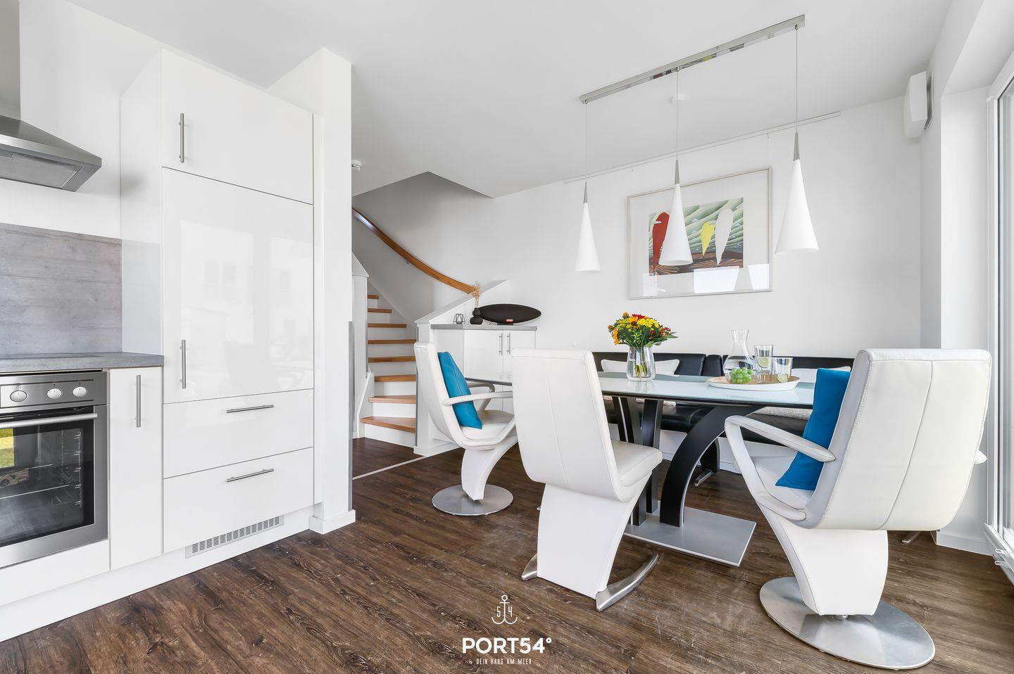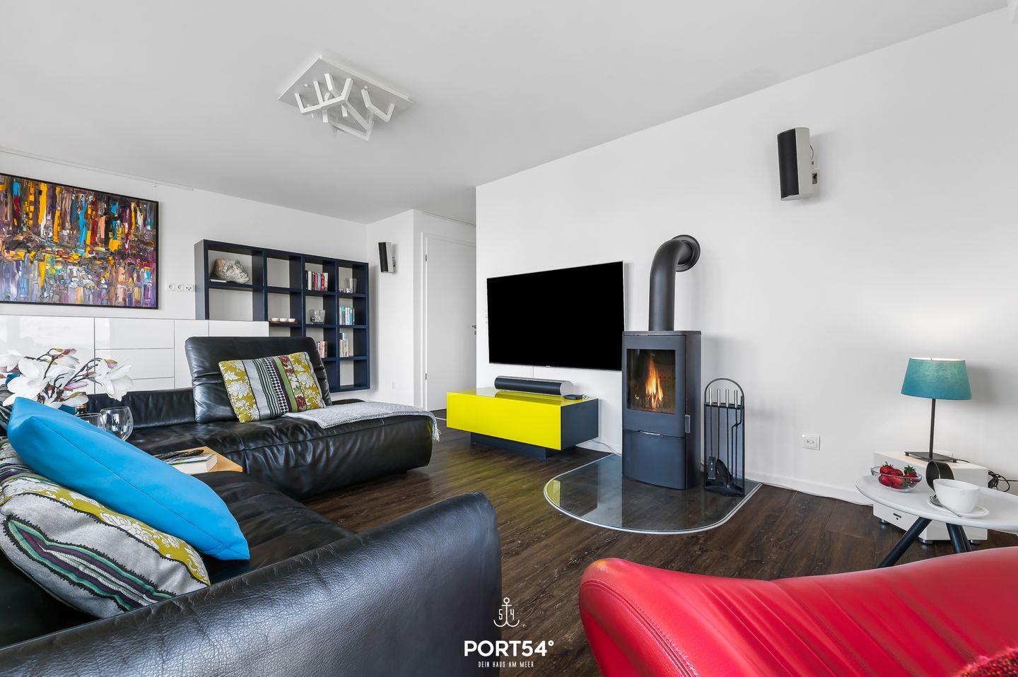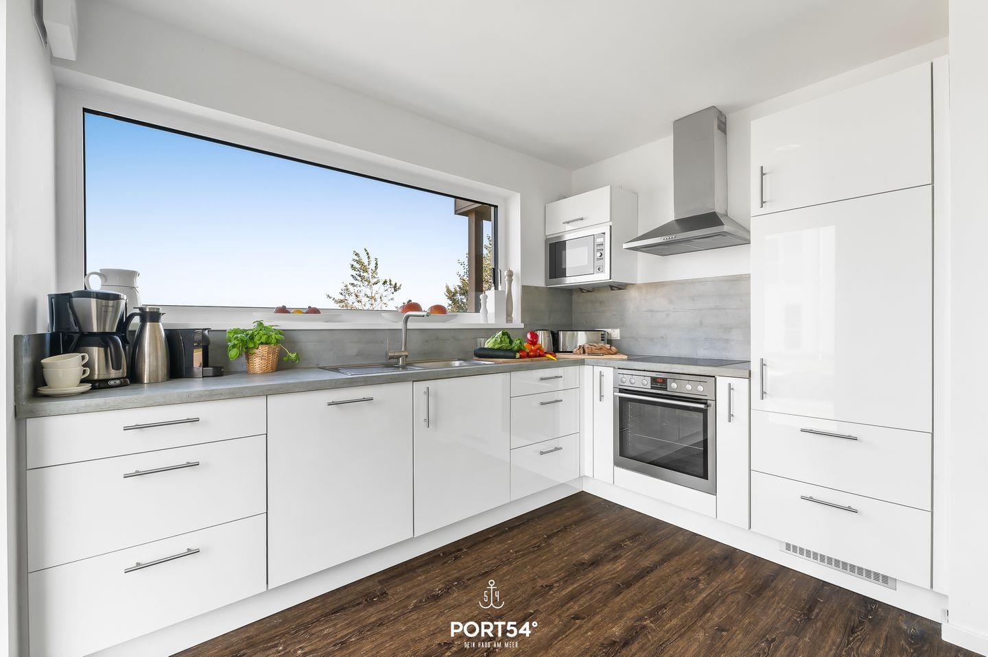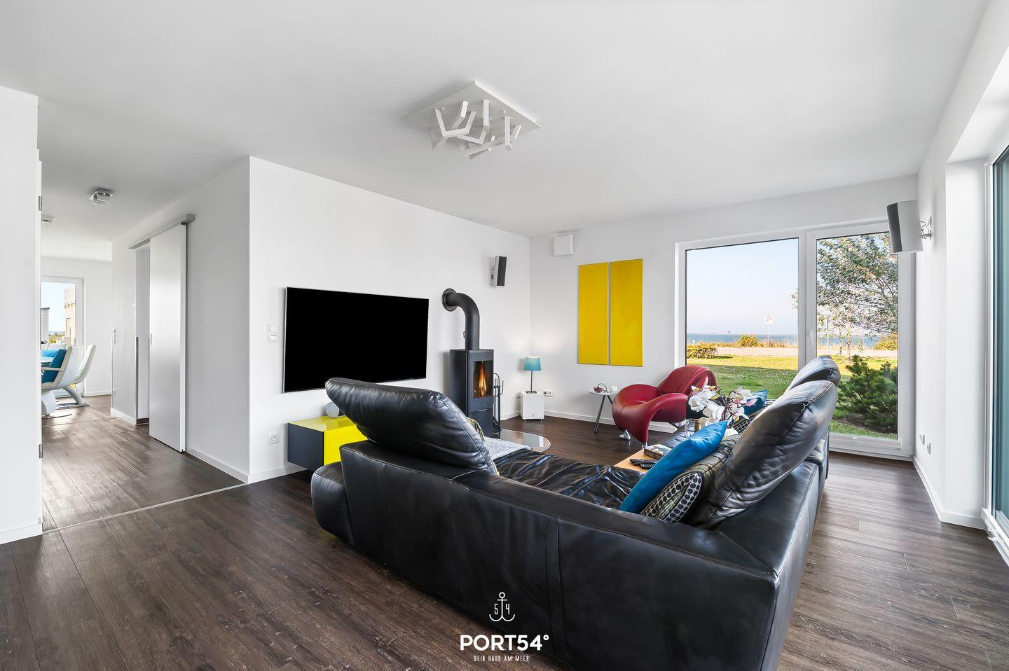 Der offene Wohn- und Essbereich der Ferienwohnung ist das Herzstück des Hauses. Er verbindet eine moderne Küche mit hochwertigen Geräten, einen gemütlichen Essplatz sowie einen stilvoll eingerichteten Wohnbereich mit großem Sofa und Kaminofen. Große Fenster lassen viel Tageslicht herein und bieten Dir einen traumhaften Panoramablick auf die umliegende Landschaft und das Wasser. Die geschmackvolle Einrichtung, geprägt von klaren Linien und modernen Akzenten, schafft eine angenehme und einladende Atmosphäre.