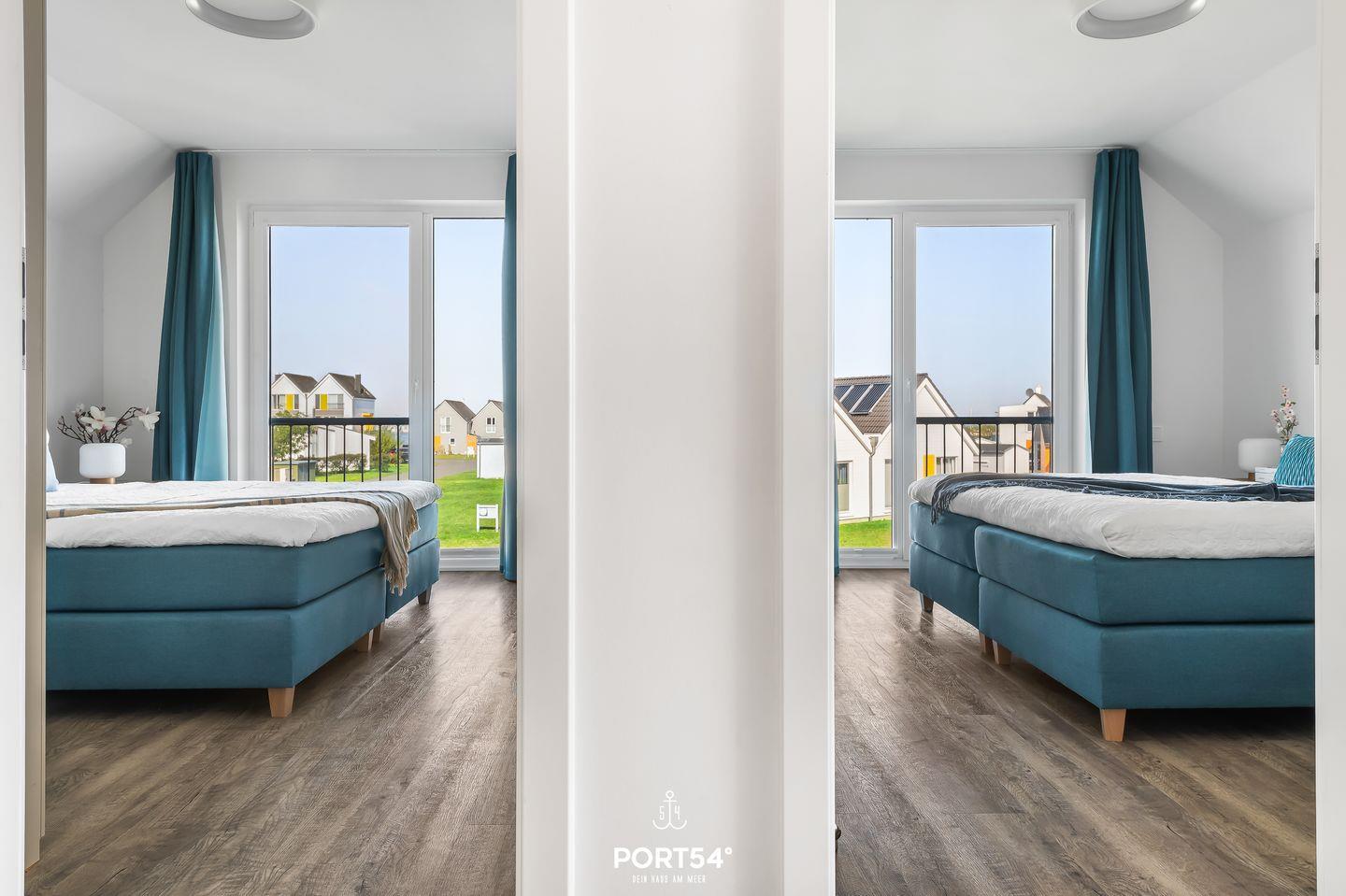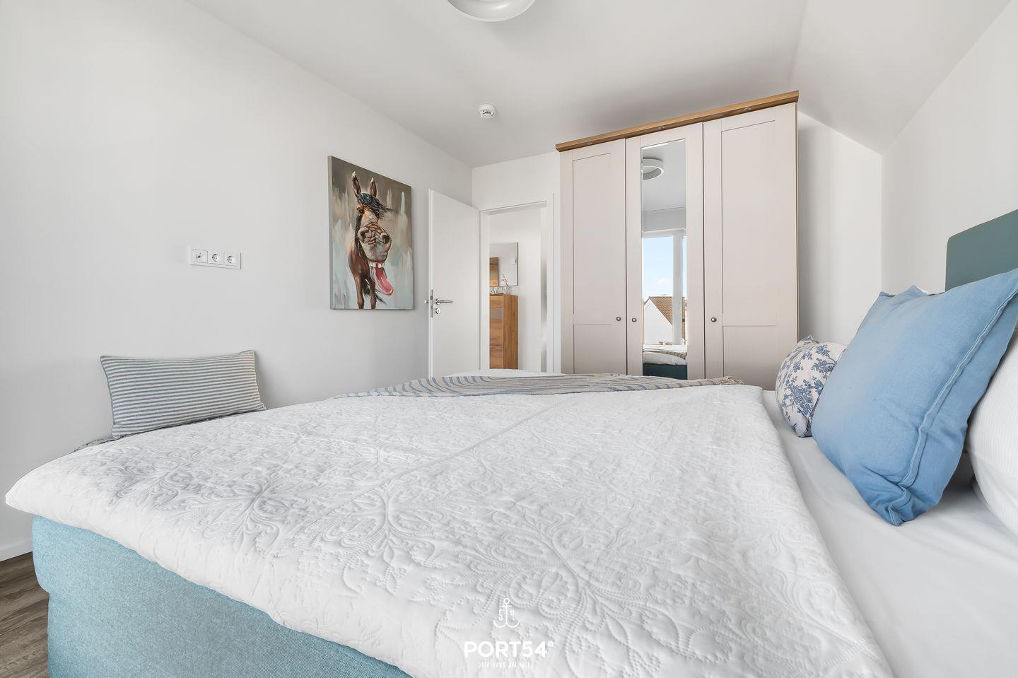 Die Wohnung verfügt über zwei geräumige Schlafzimmer. Das Hauptschlafzimmer ist mit einem bequemen Boxspring-Doppelbett (180x200 cm) ausgestattet, während das zweite Schlafzimmer zwei Boxspring-Einzelbetten (je 90x200 cm) bietet. Beide Schlafzimmer verfügen jeweils über einen Kleiderschrank sowie Insektenschutzgitter. Für Deine Privatsphäre sind beide Schlafzimmer zusätzlich mit Sichtschutz und Plissees ausgestattet.