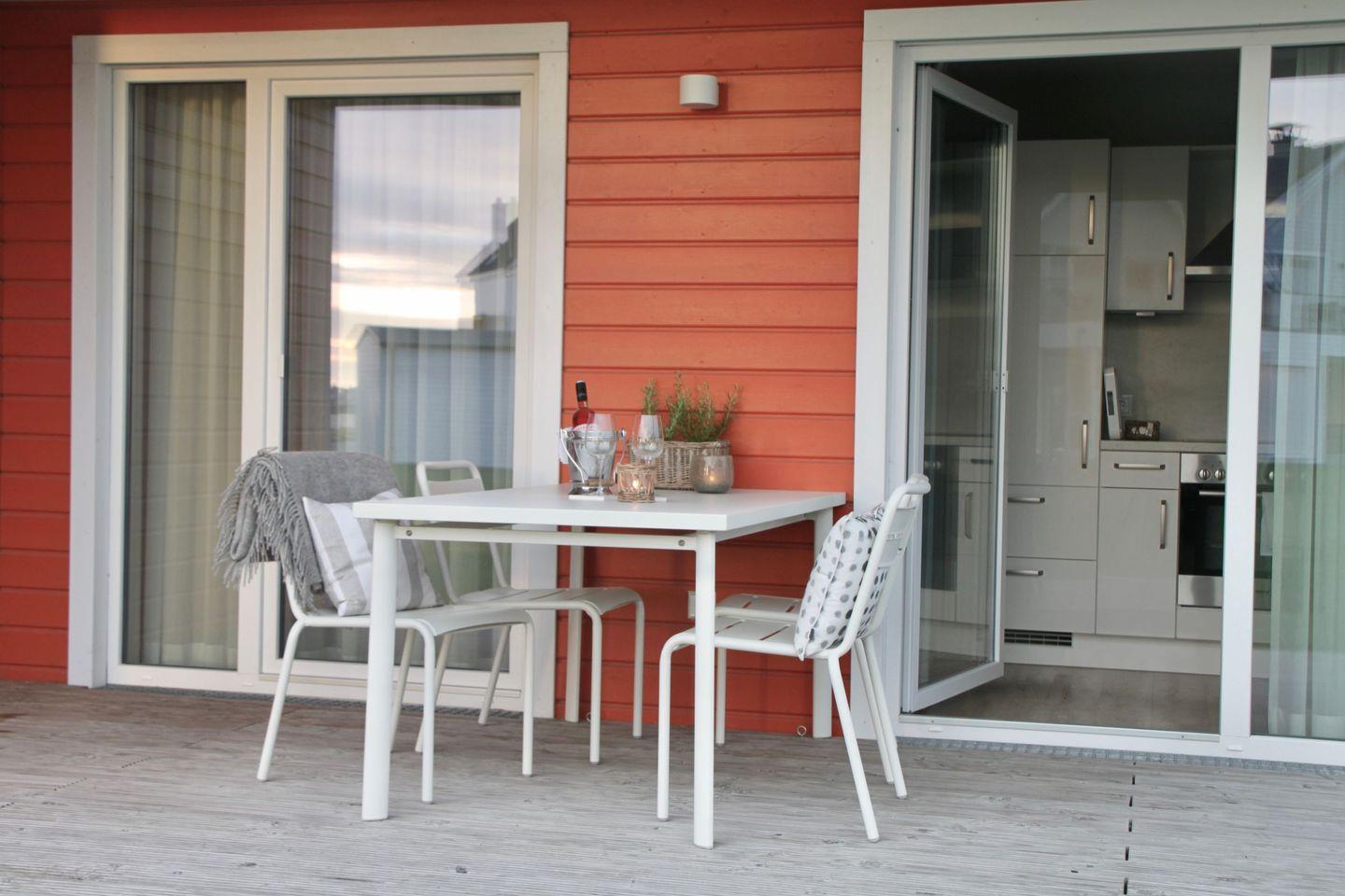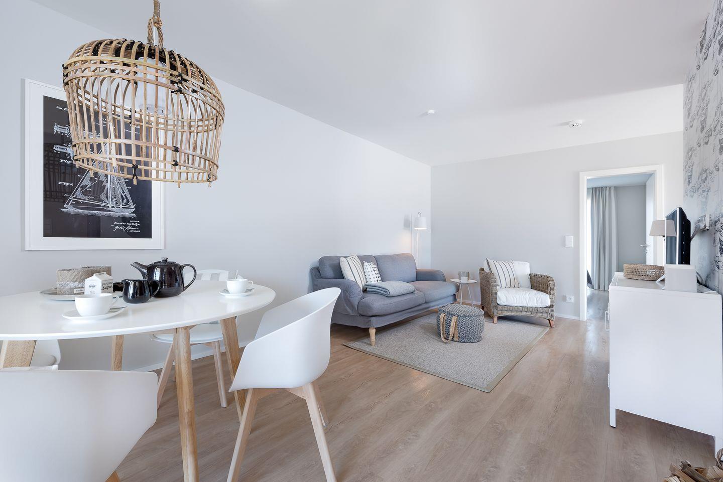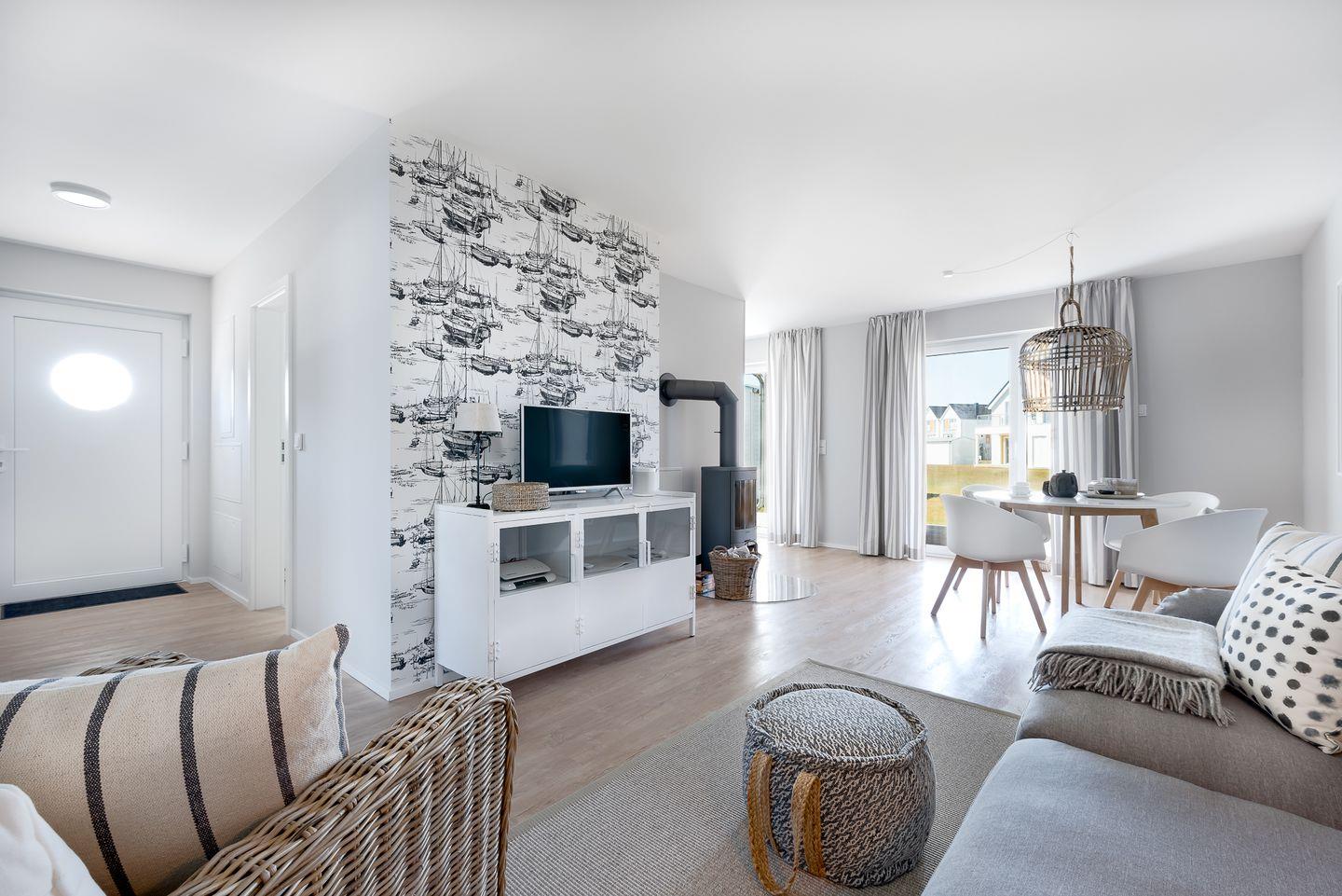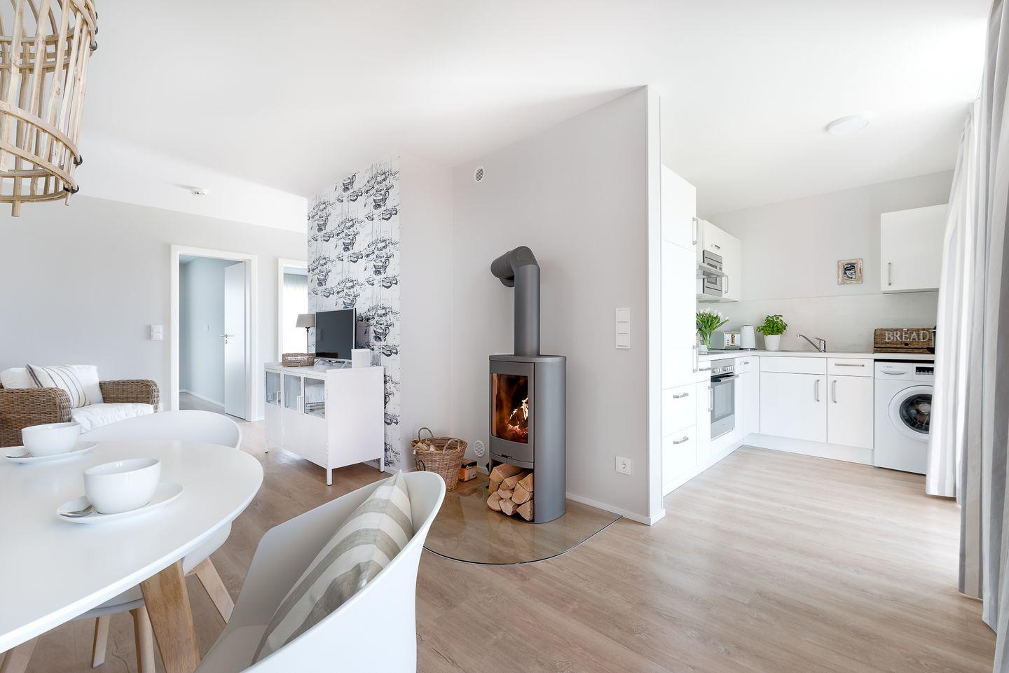 Der lichtdurchflutete Wohn- und Essbereich schafft durch die großen Fensterfronten eine helle und freundliche Atmosphäre. Die moderne, vollständig ausgestattete Küche lässt keine Wünsche offen und bietet Dir neben Mikrowelle und Gefrierfach alles, was Du für ausgedehnte Kochabende benötigst. Auch bei schlechtem Wetter ist für Abwechslung gesorgt: Ein Glasfaseranschluss sowie ein Smart-TV mit Magenta sorgen für Unterhaltung an Regentagen.