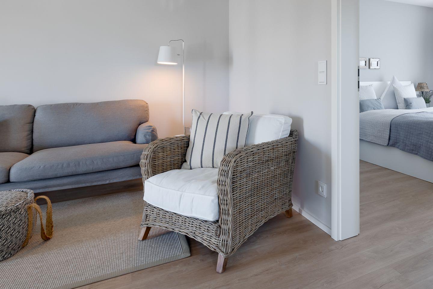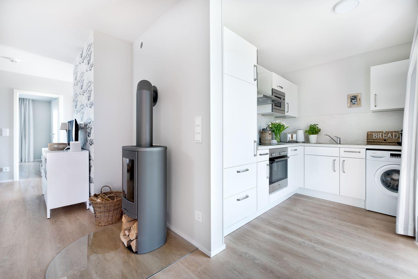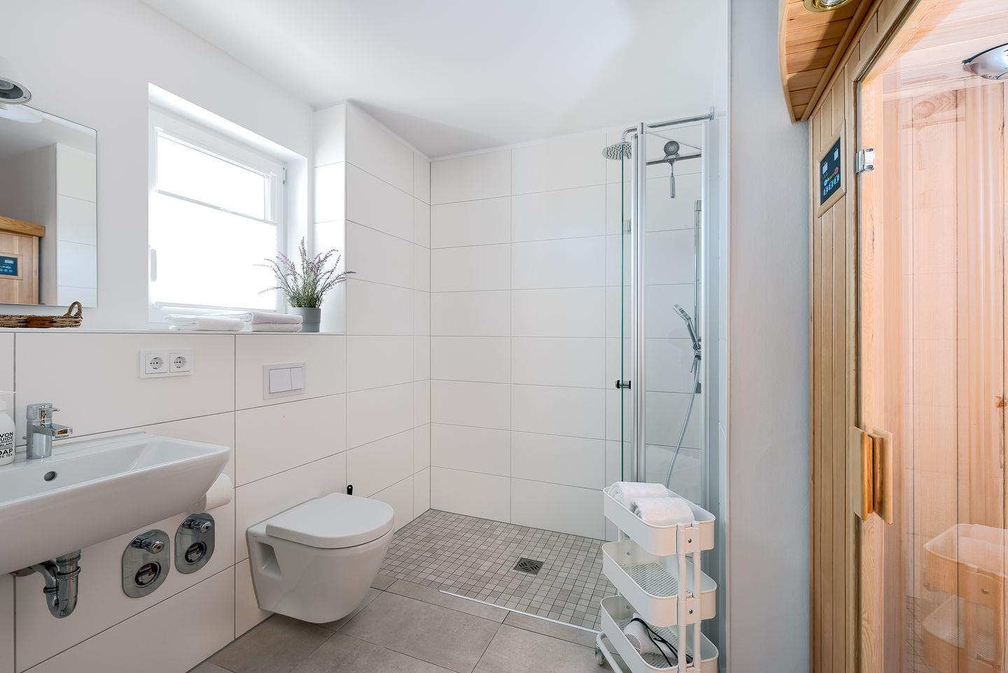 Für Entspannung nach einem Spaziergang am Meer sorgt die Infrarot-Wärmekabine mit integriertem HiFi-Soundsystem. Eine bodentiefe Regendusche rundet das Wellness-Erlebnis ab. Zudem findest Du im Badezimmer einen Handtuchheizkörper, einen kleinen Kosmetikspiegel sowie einen Föhn. Die Fußbodenheizung sorgt das ganze Jahr über für ein angenehmes Wohnklima.