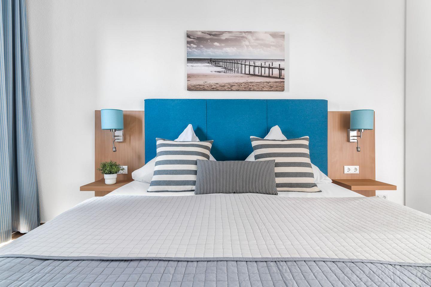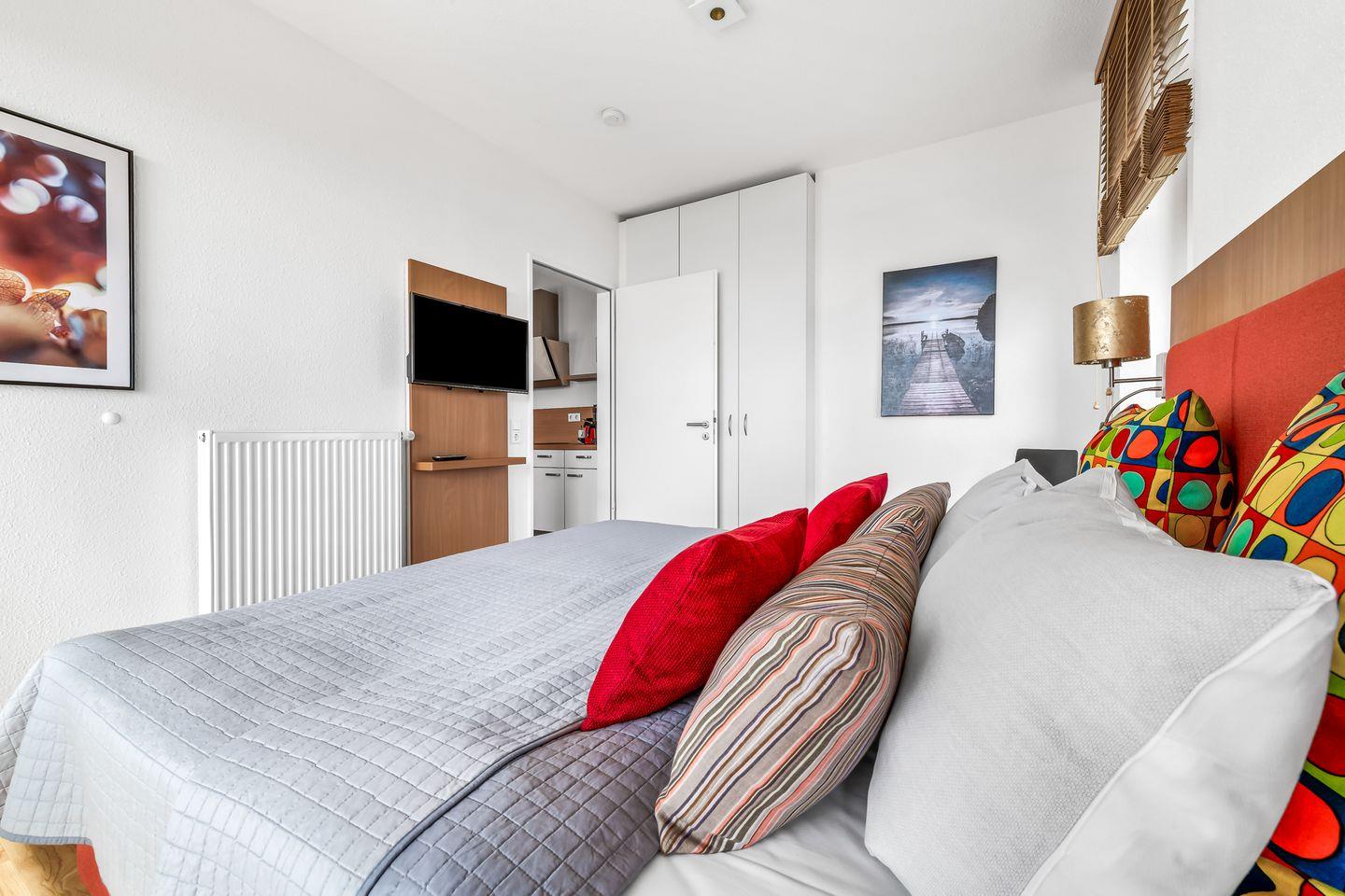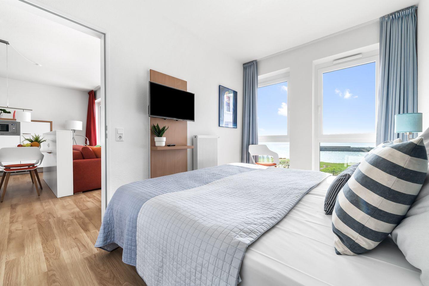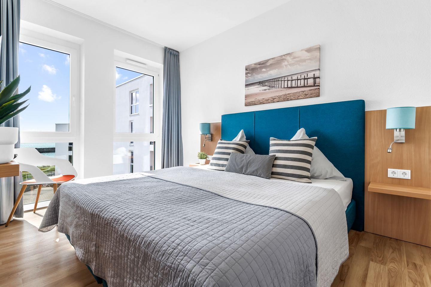 Die beiden Schlafzimmer bieten luxuriöse Boxspring-Doppelbetten (180 × 200 cm), in denen Du erholsam schläfst und den Tag mit Blick auf die Ostsee beginnen kannst. Jedes Zimmer ist zusätzlich mit einem Flachbild-Fernseher, Kleiderschrank und Verdunkelungsmöglichkeiten ausgestattet.