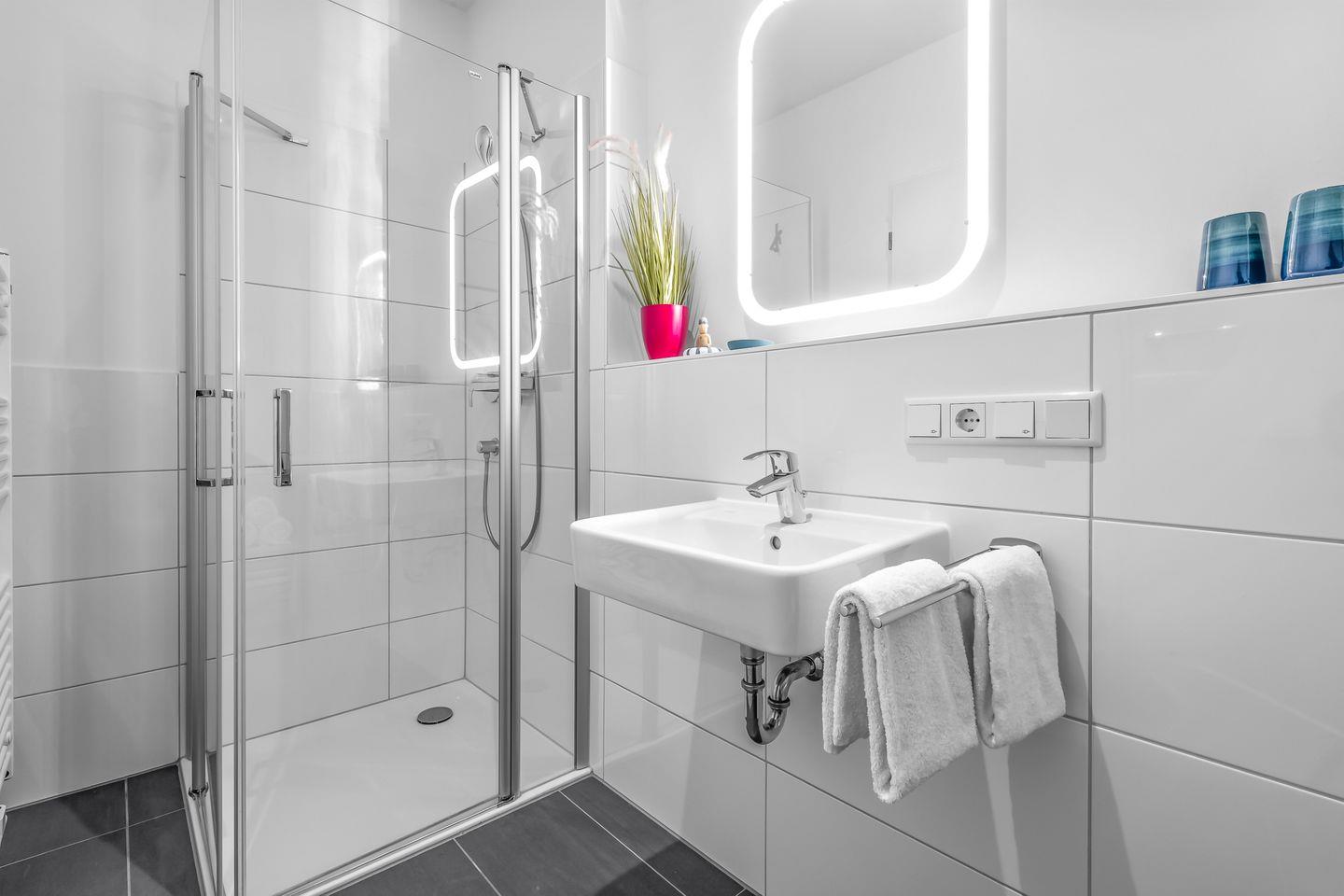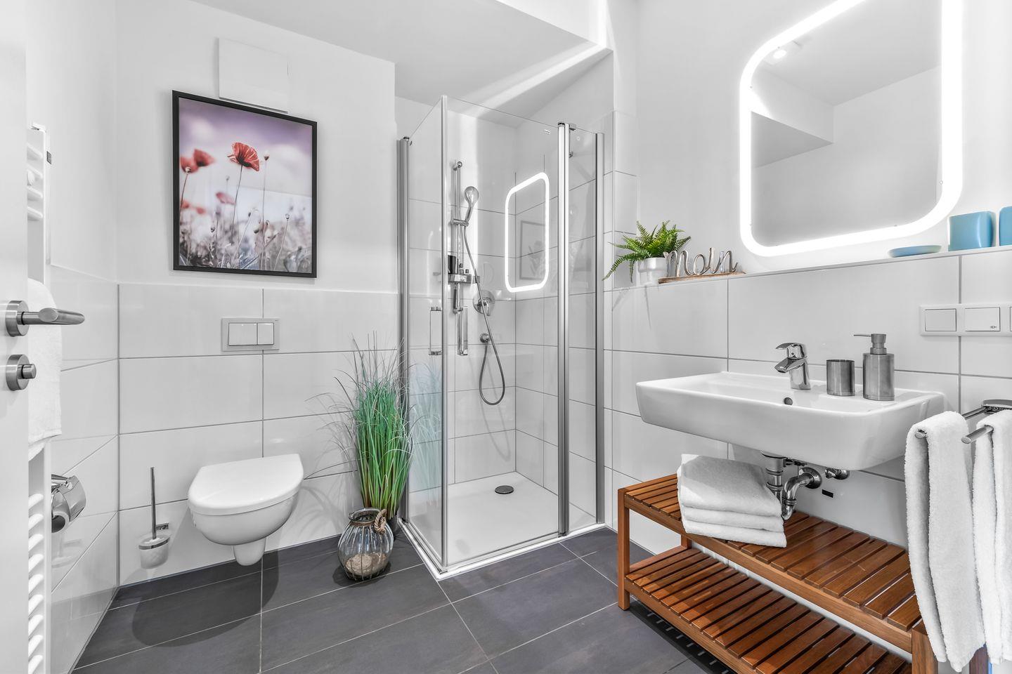 Die zwei modernen Badezimmer bieten jeweils eine ebenerdige Dusche, einen Kosmetikspiegel und einen Föhn. Eines der Bäder verwöhnt Dich zudem mit einem Handtuchheizkörper für extra Komfort.