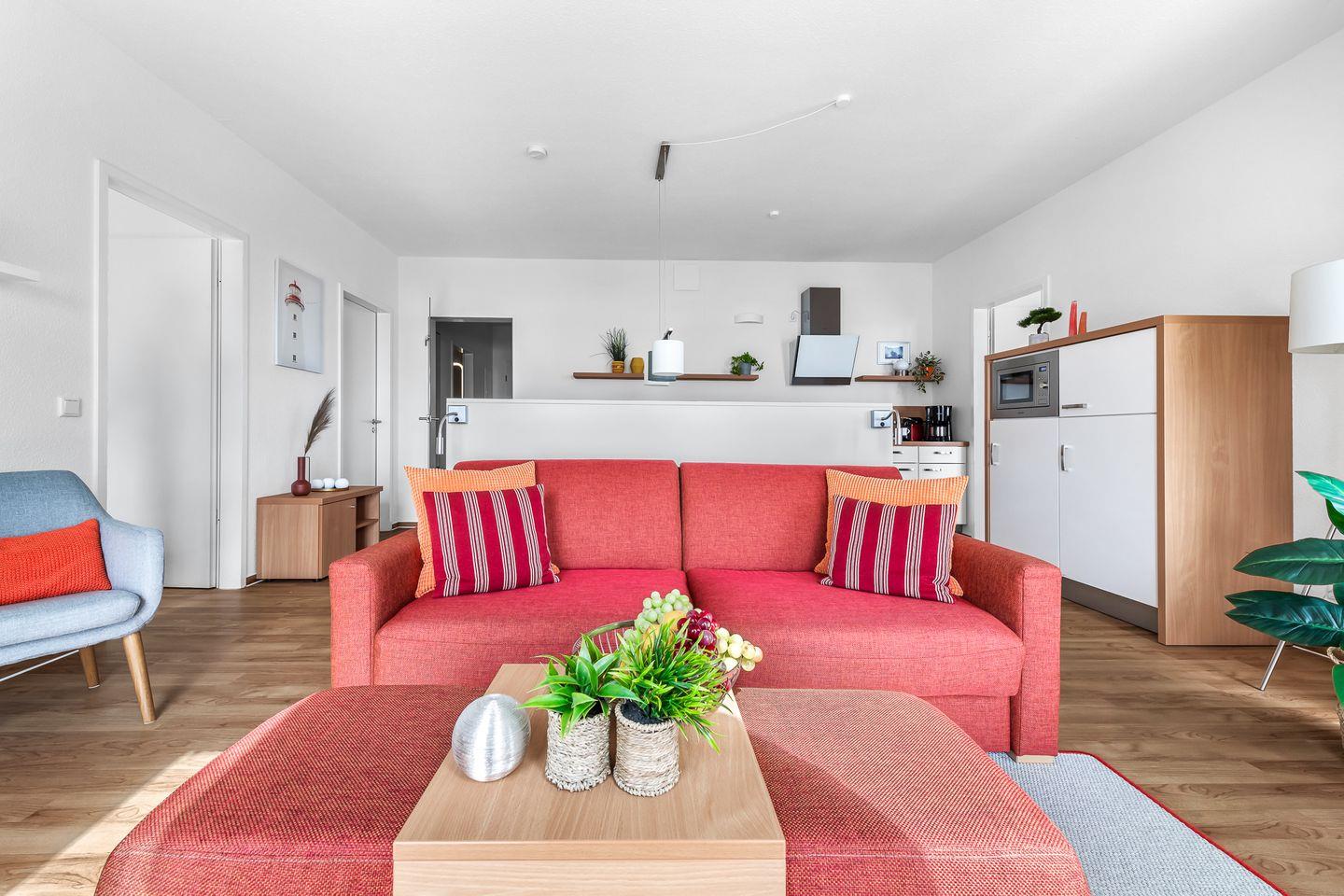 Der Wohnbereich lädt mit einem gemütlichen Sofa, einem großen Hocker und praktischen Ablageflächen für Getränke, Bücher & Co. zum Verweilen ein. Für Unterhaltung sorgen ein Flachbild-Fernseher und ein Radio – ideal für entspannte Abende.