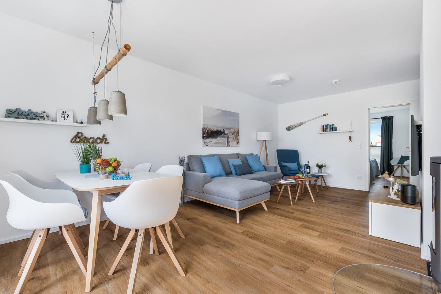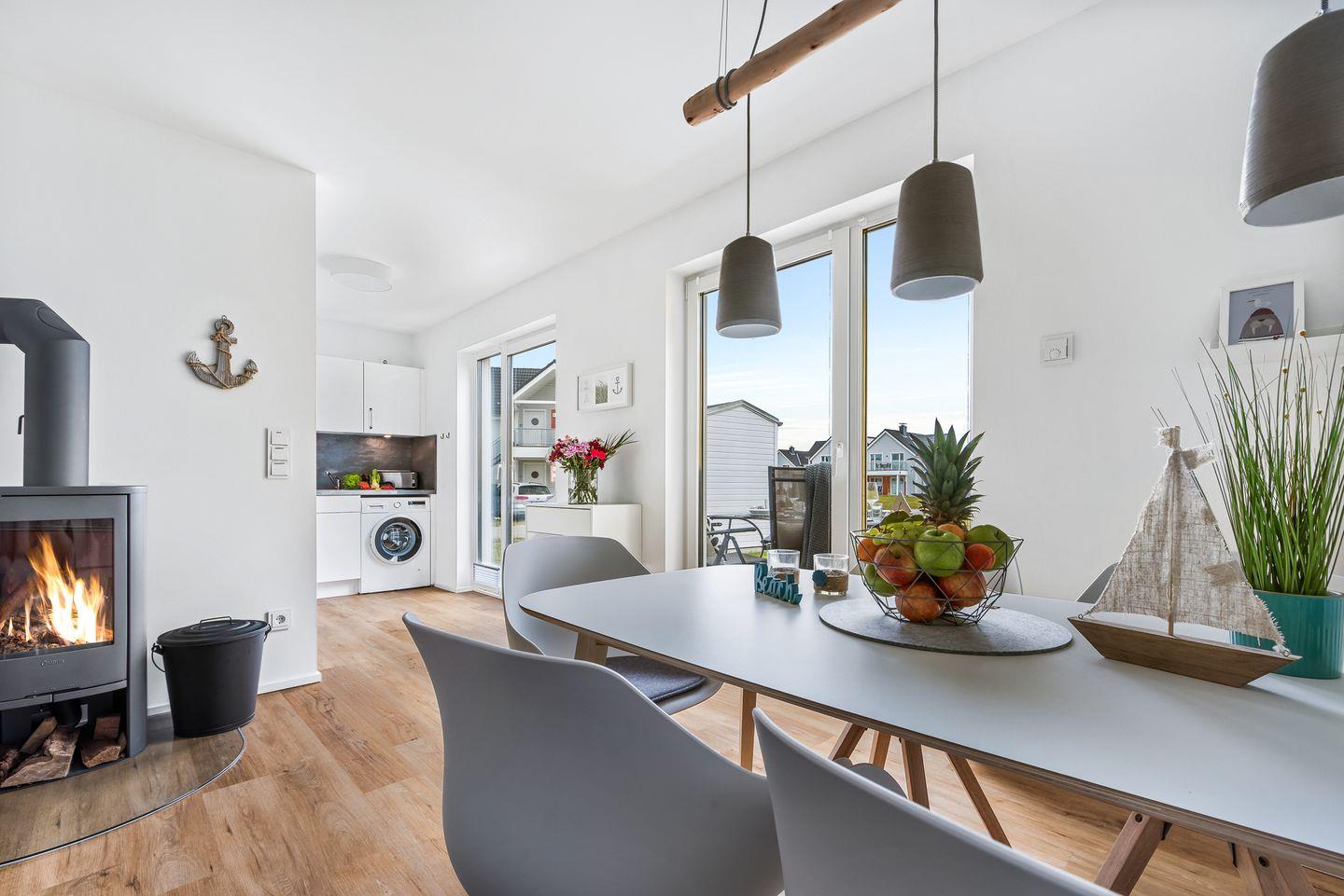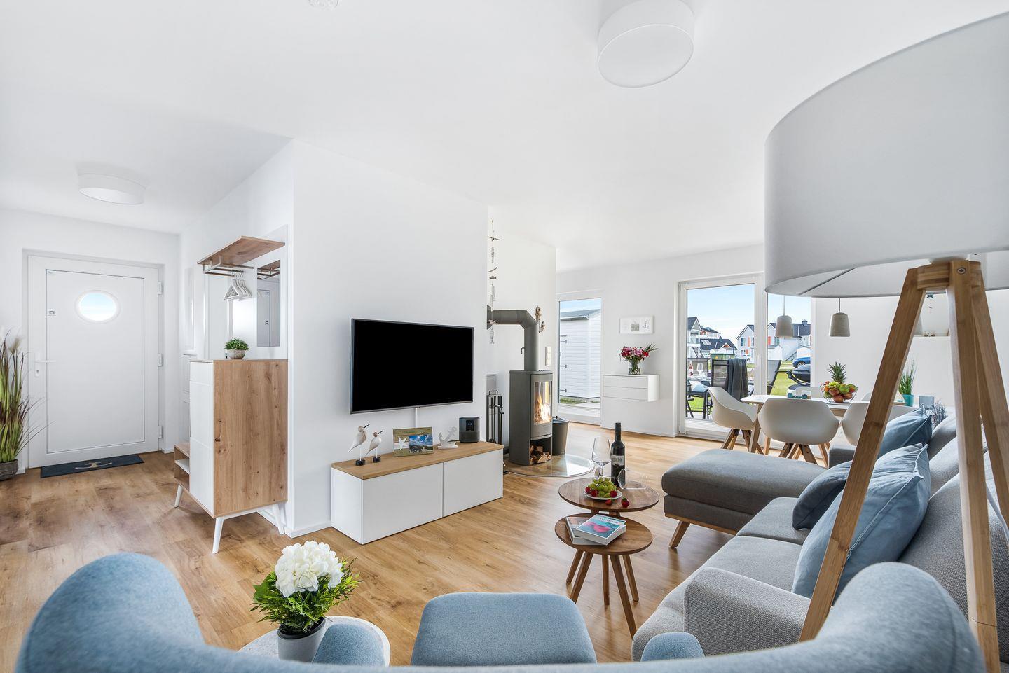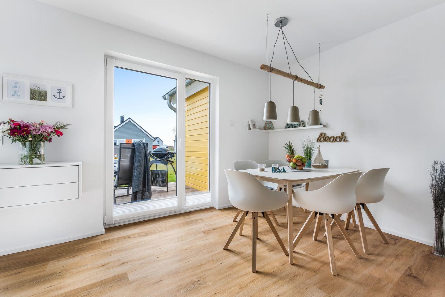 Der offene Wohn- und Essbereich ist dank der bodentiefen Fenster hell und freundlich, während die geschmackvolle Einrichtung zu einer Wohlfühlatmosphäre beiträgt.