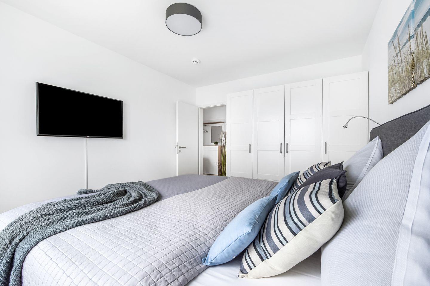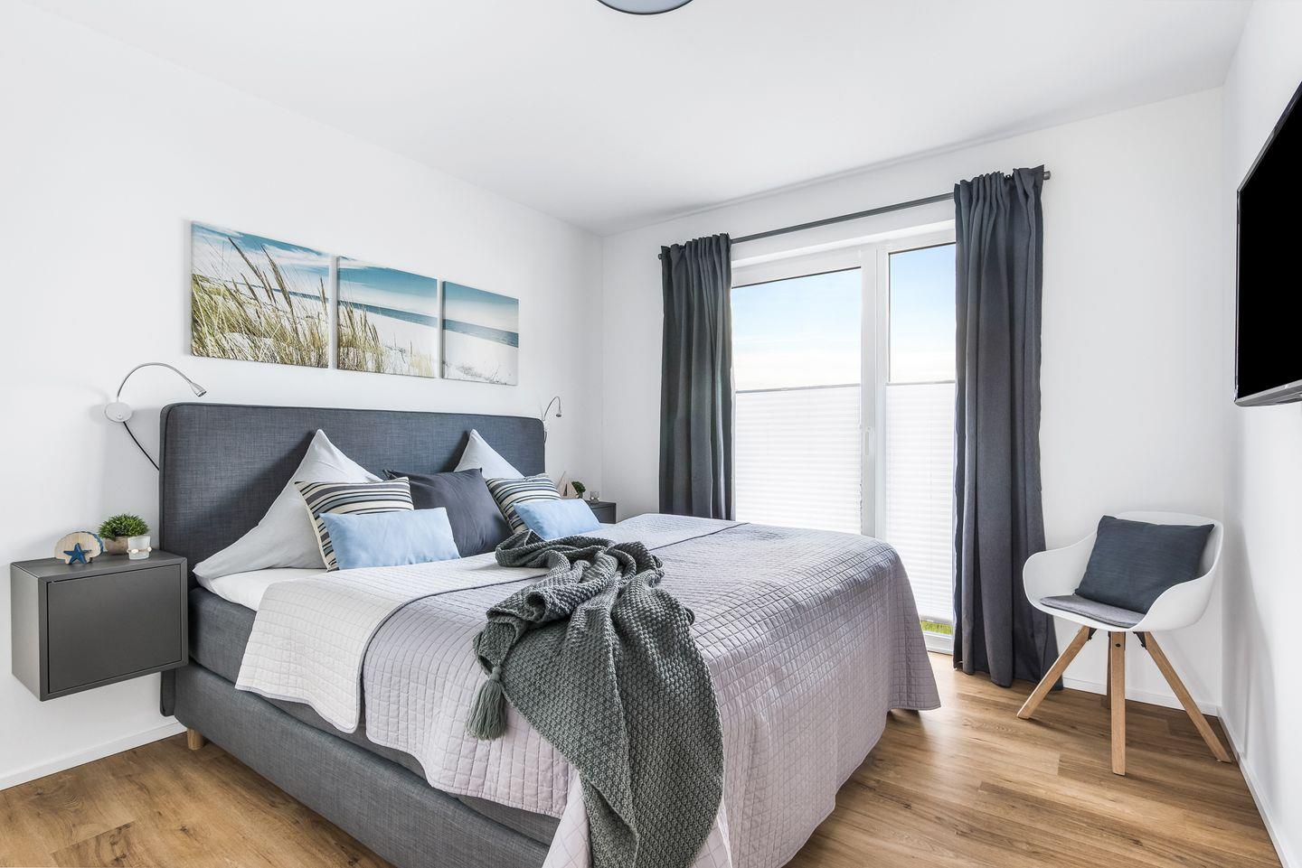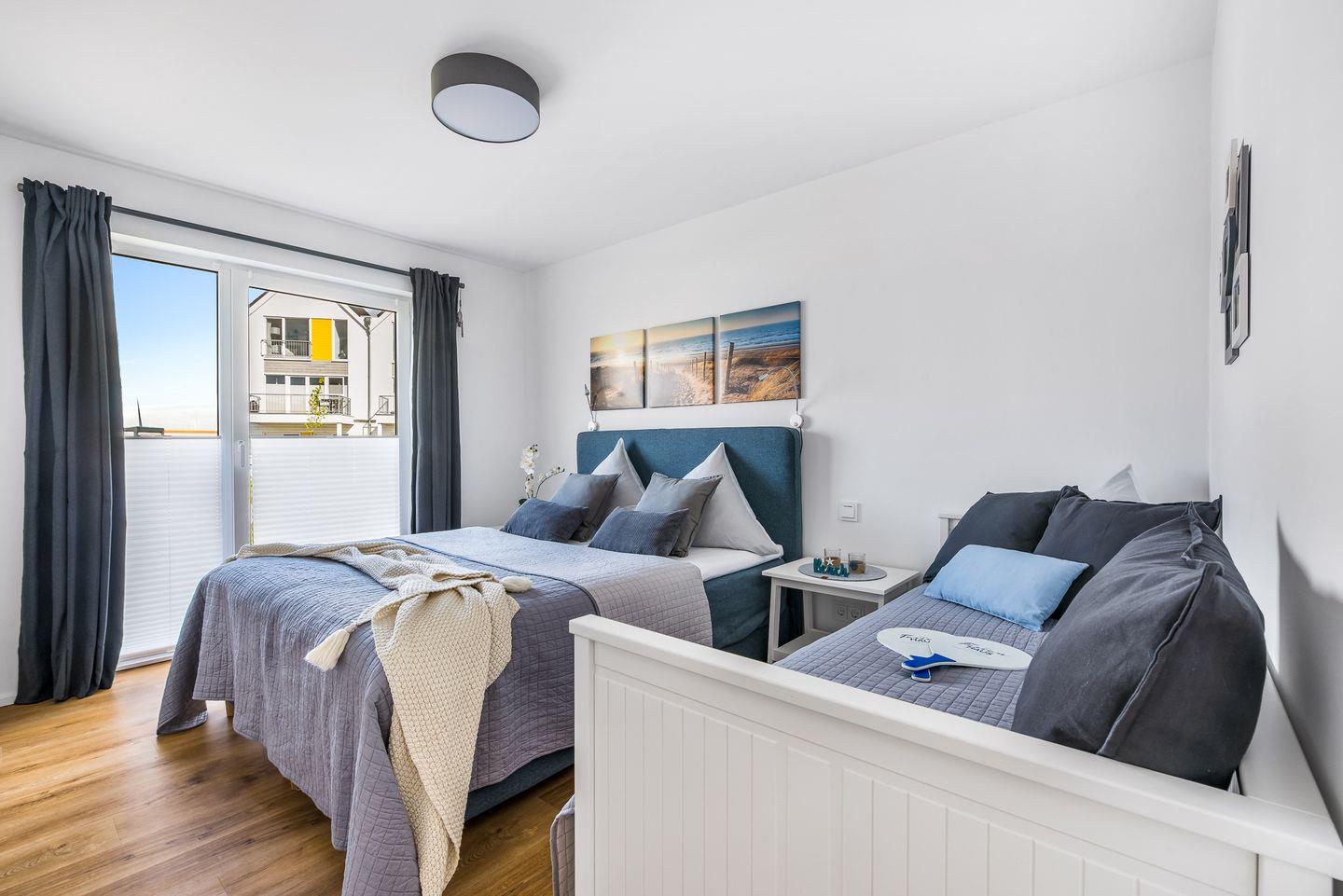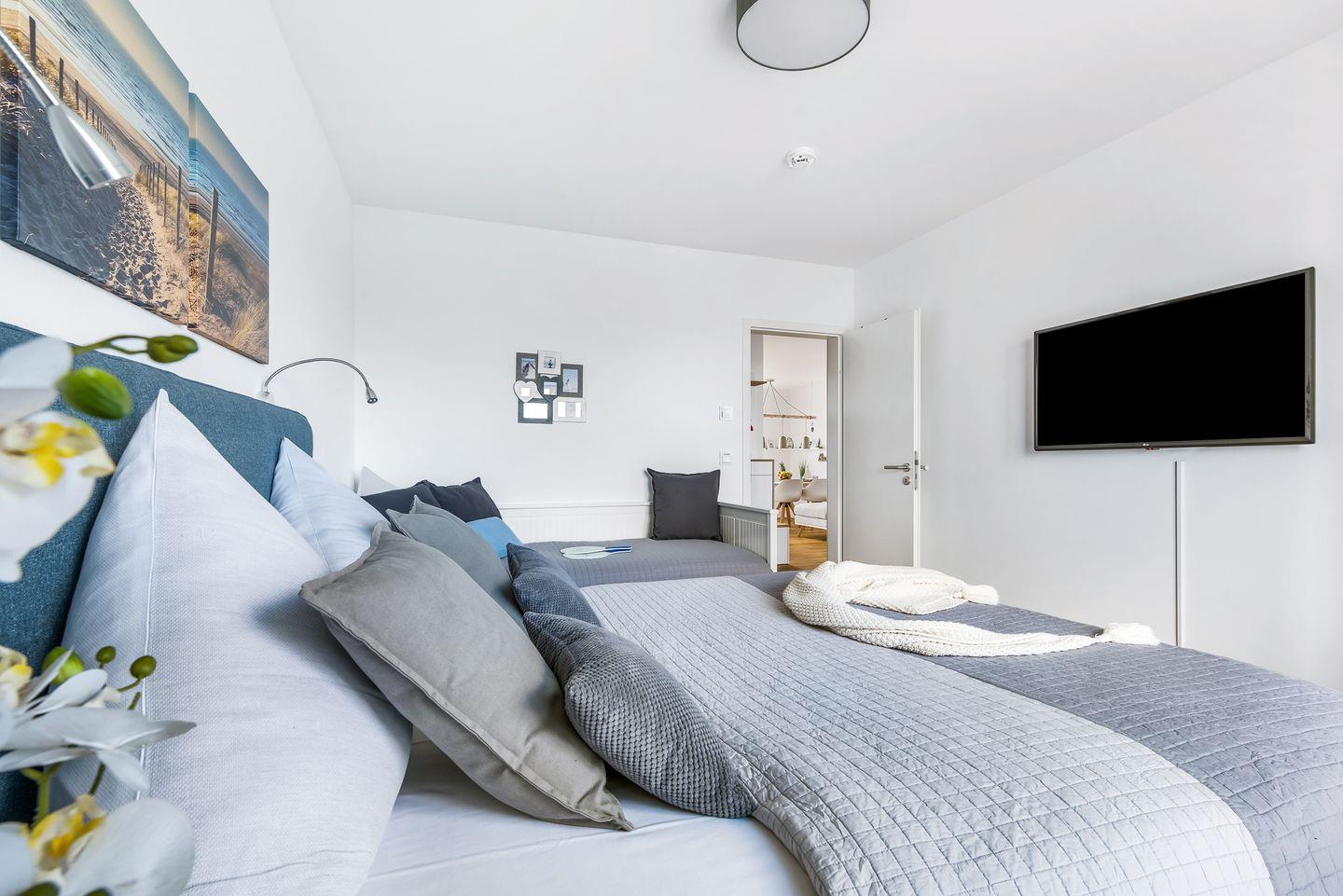 Die beiden Schlafzimmer ermöglichen Dir erholsame Nächte. Während das eine Schlafzimmer mit einem Boxspring-Doppelbett (180 × 200 cm) ausgestattet ist, bietet das zweite Schlafzimmer ein Boxspring-Doppelbett (160 × 200 cm) und ein Einzelbett (80 × 200 cm). Beide Schlafzimmer verfügen über Verdunkelungsmöglichkeiten, einen Kleiderschrank und einen Flachbild-Fernseher.