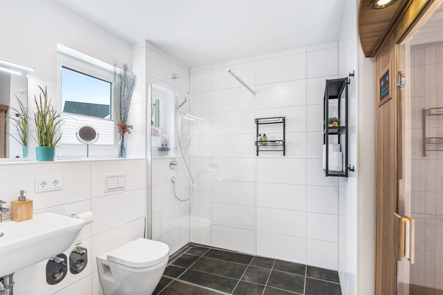 Das Tageslichtbad ist Dein privater Wellness-Bereich. In der Infrarot-Wärmekabine kannst Du hervorragend den Alltagsstress hinter Dir lassen und wunderbar entspannen. Anschließend lässt Du Dich von der bodentiefen Dusche verwöhnen. Auch ein Handtuchheizkörper, ein Kosmetikspiegel und ein Föhn stehen Dir zur Verfügung.