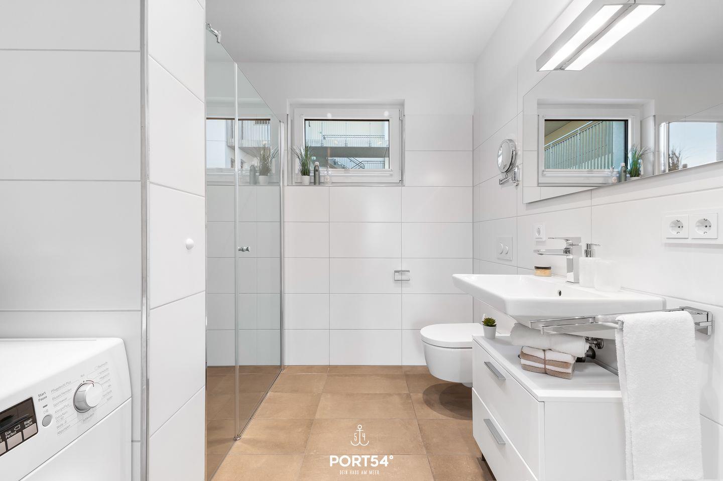 Gegenüber der Schlafzimmer befindet sich das Tageslichtbad, das mit einer bodengleichen Dusche ausgestattet ist. Zudem stehen Dir hier ein Handtuchheizkörper, ein Kosmetikspiegel, ein Föhn sowie eine Waschmaschine zur Verfügung.