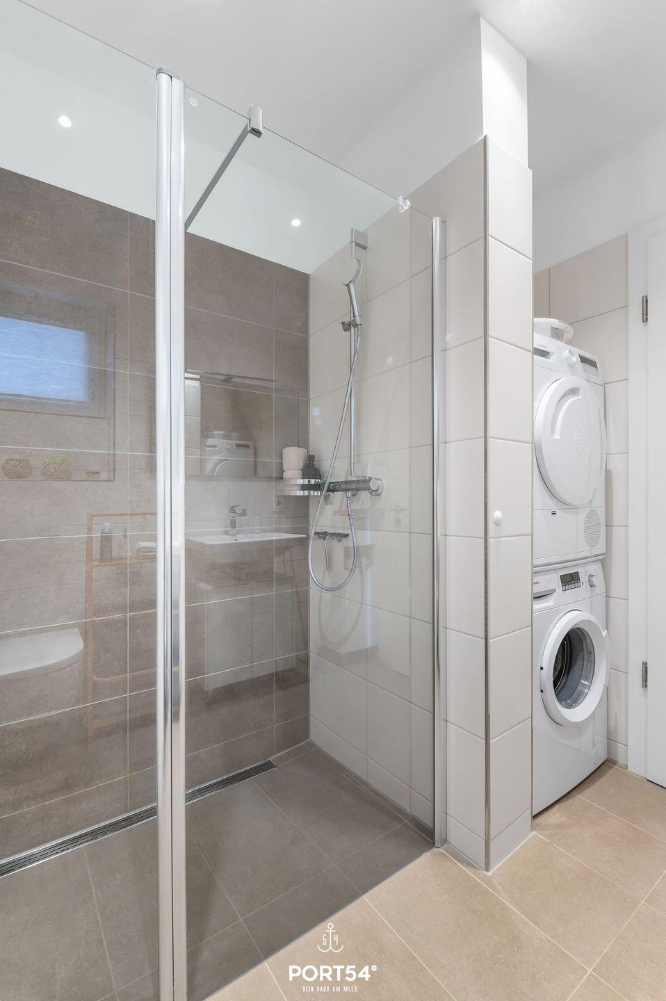 Das Badezimmer besticht durch ein Fenster, das für natürliche Belüftung und Tageslicht sorgt. Die bodengleiche Dusche bietet Dir modernen Komfort, sodass Du nach einem Tag am Strand erfrischt und entspannt zurückkehren kannst. Ein Handtuchheizkörper, ein Kosmetikspiegel und ein Föhn runden das Angebot ab.