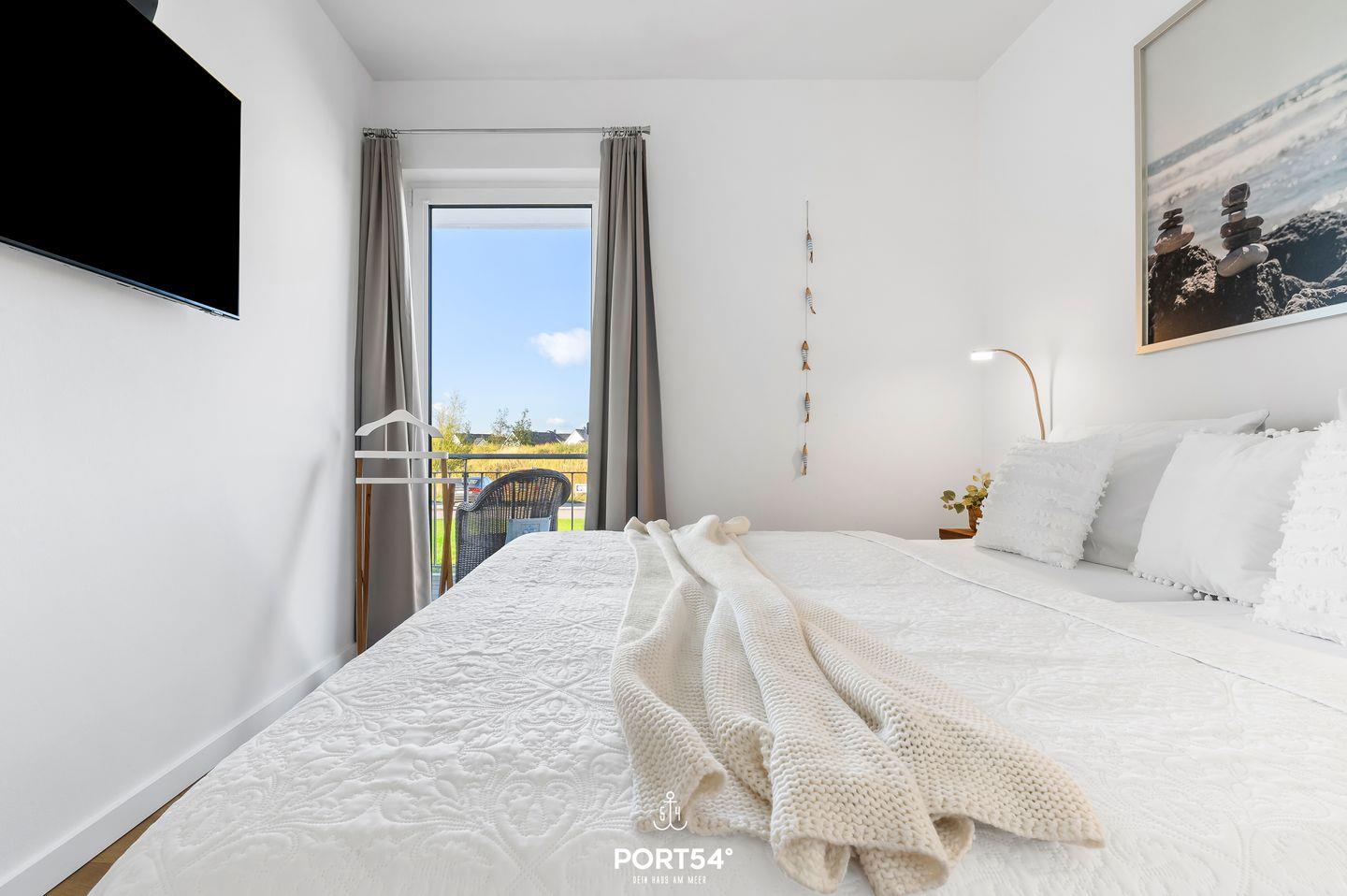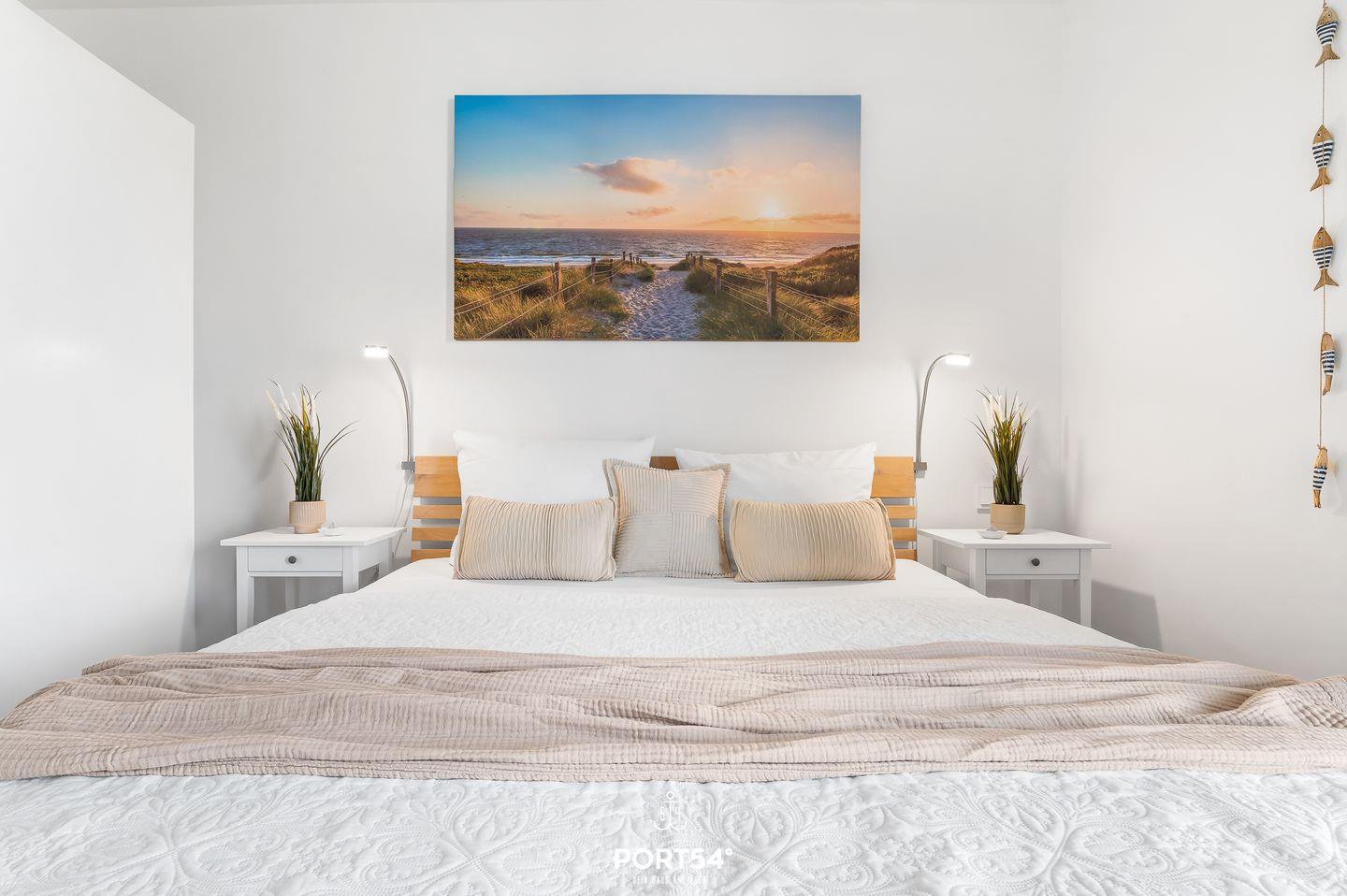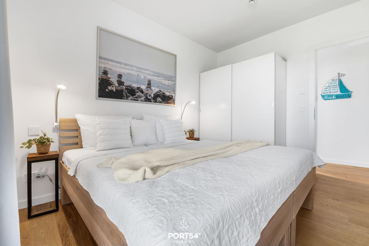 Die Wohnung verfügt über zwei komfortable Schlafzimmer, die beide mit einem eigenen Flachbild-TV sowie einem Kleiderschrank ausgestattet sind. Die geschmackvolle Einrichtung, die bequemen Betten und die Verdunkelungsmöglichkeiten sorgen für erholsame Nächte und eine angenehme Atmosphäre. Ein Schlafzimmer verfügt über ein 180x200 cm großes Doppelbett mit offenem Fußende, das andere über zwei Einzelbetten (je 90x200 cm), die zu einem Doppelbett zusammengeschoben werden können.
