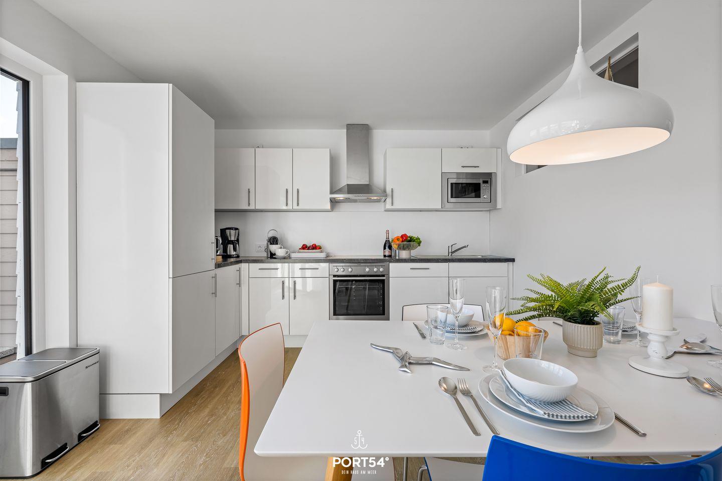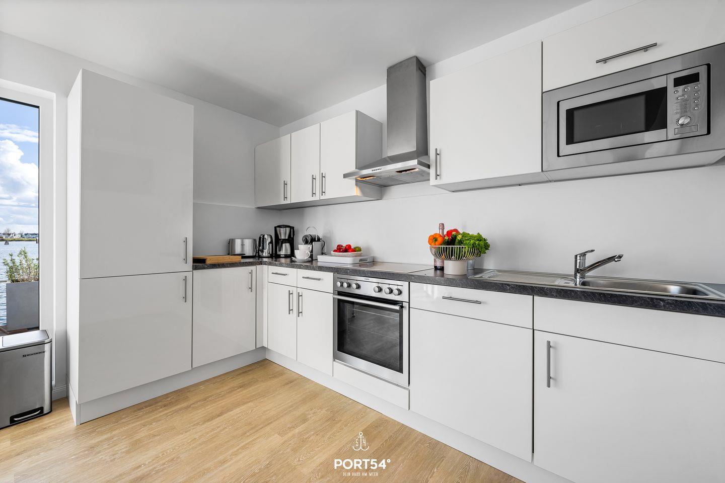 Die an den Wohnbereich angrenzende, offene Küche ist vollständig eingerichtet: Ceranherd, Backofen, Kühlschrank mit Gefrierfach, Spülmaschine, Kaffeemaschine, Nespresso-Espressomaschine, Toaster, Wasserkocher sowie sämtliche Küchenutensilien lassen keine Wünsche offen.
