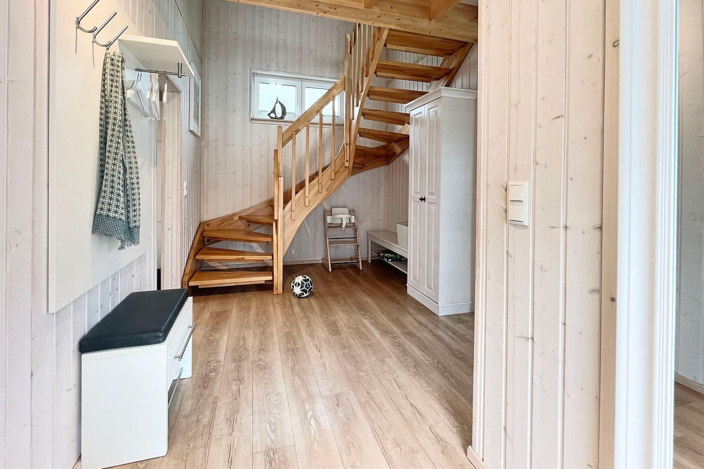 Die elegante Holztreppe führt ins Obergeschoss, wo sich zwei behagliche Schlafzimmer befinden.