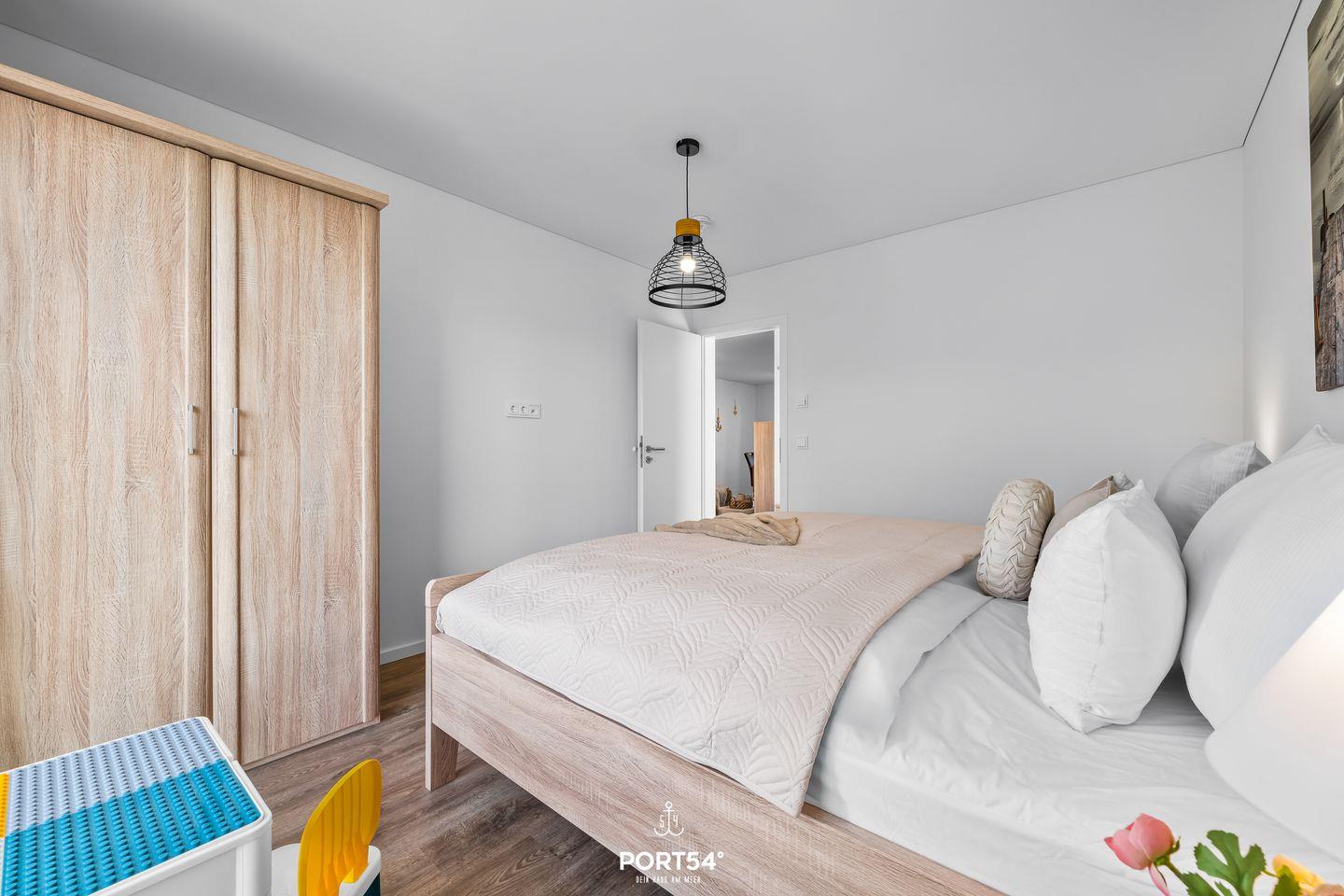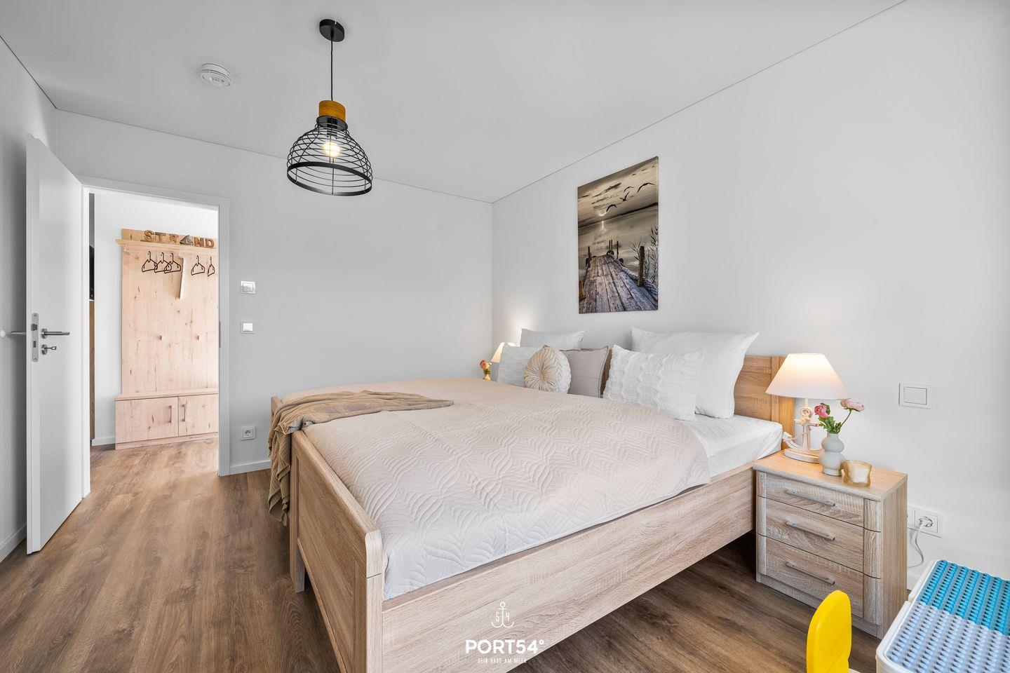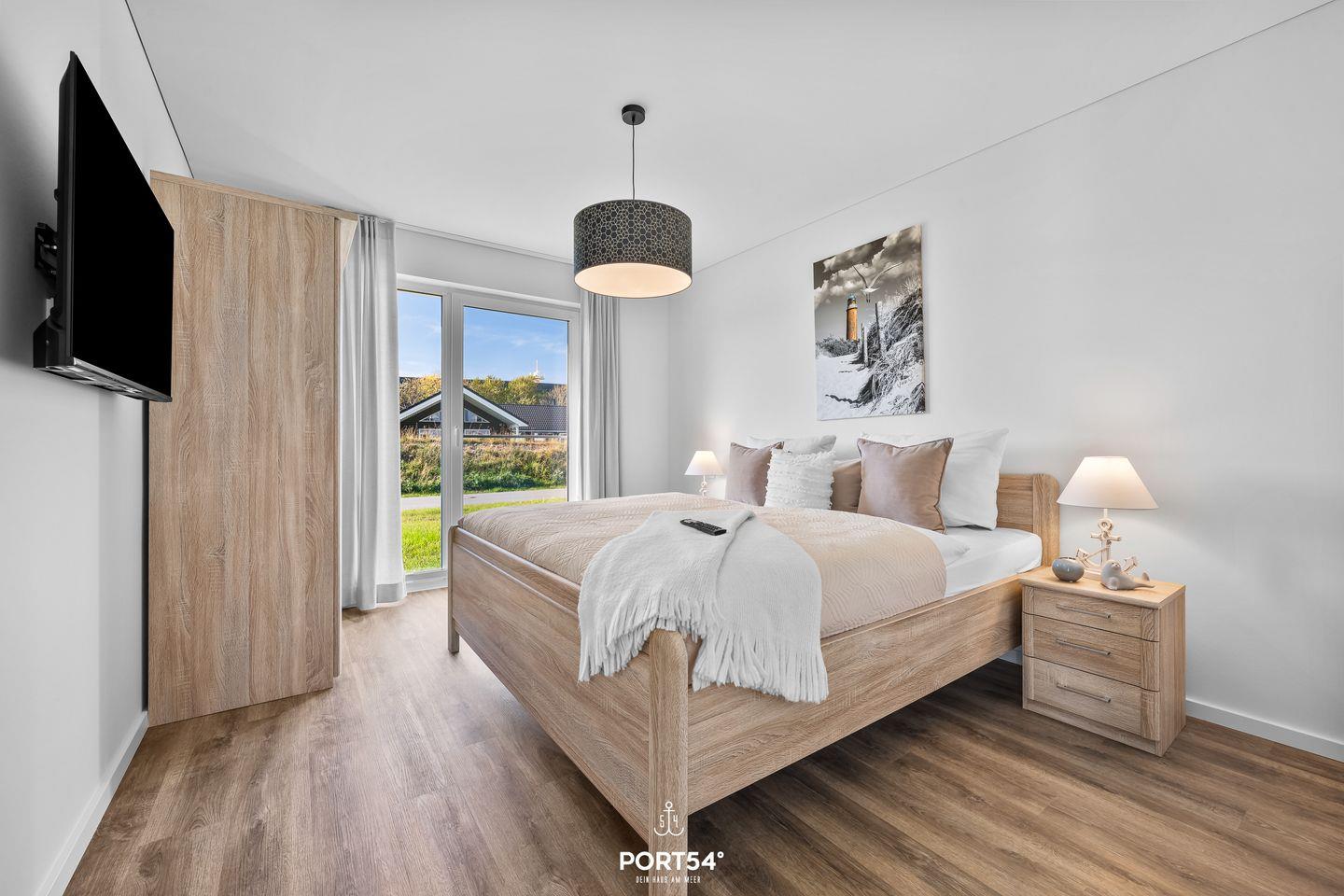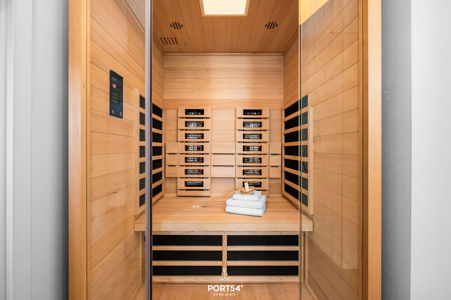 An kälteren Tagen bietet Dir das Tageslichtbad mit Infrarot-Sauna wohltuende Wärme und Entspannung. Zudem verfügt das Bad über eine ebenerdige Dusche, einen Handtuchheizkörper, einen Kosmetikspiegel und einen Föhn. Die zwei gemütlichen Schlafzimmer ermöglichen Dir einen erholsamen Schlaf. In dem einen Schlafzimmer findest Du ein komfortables Doppelbett (180×200cm) sowie einen Flachbild-Fernseher vor. Das andere Schlafzimmer bietet Dir zwei gemütliche Einzelbetten (100×200cm). Beide Schlafzimmer sind jeweils mit einem Kleiderschrank ausgestattet.