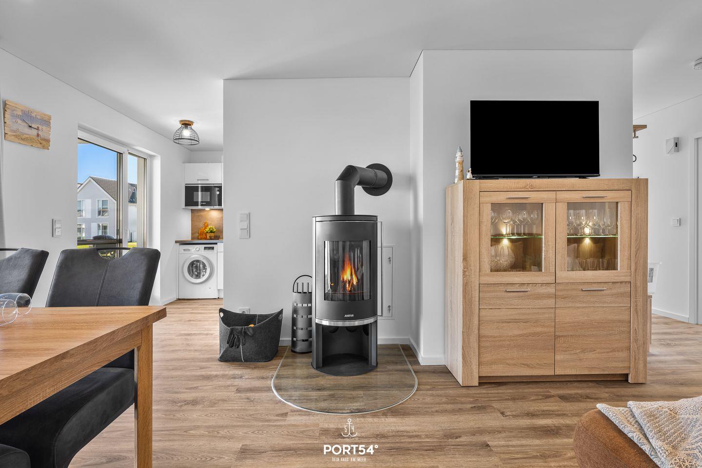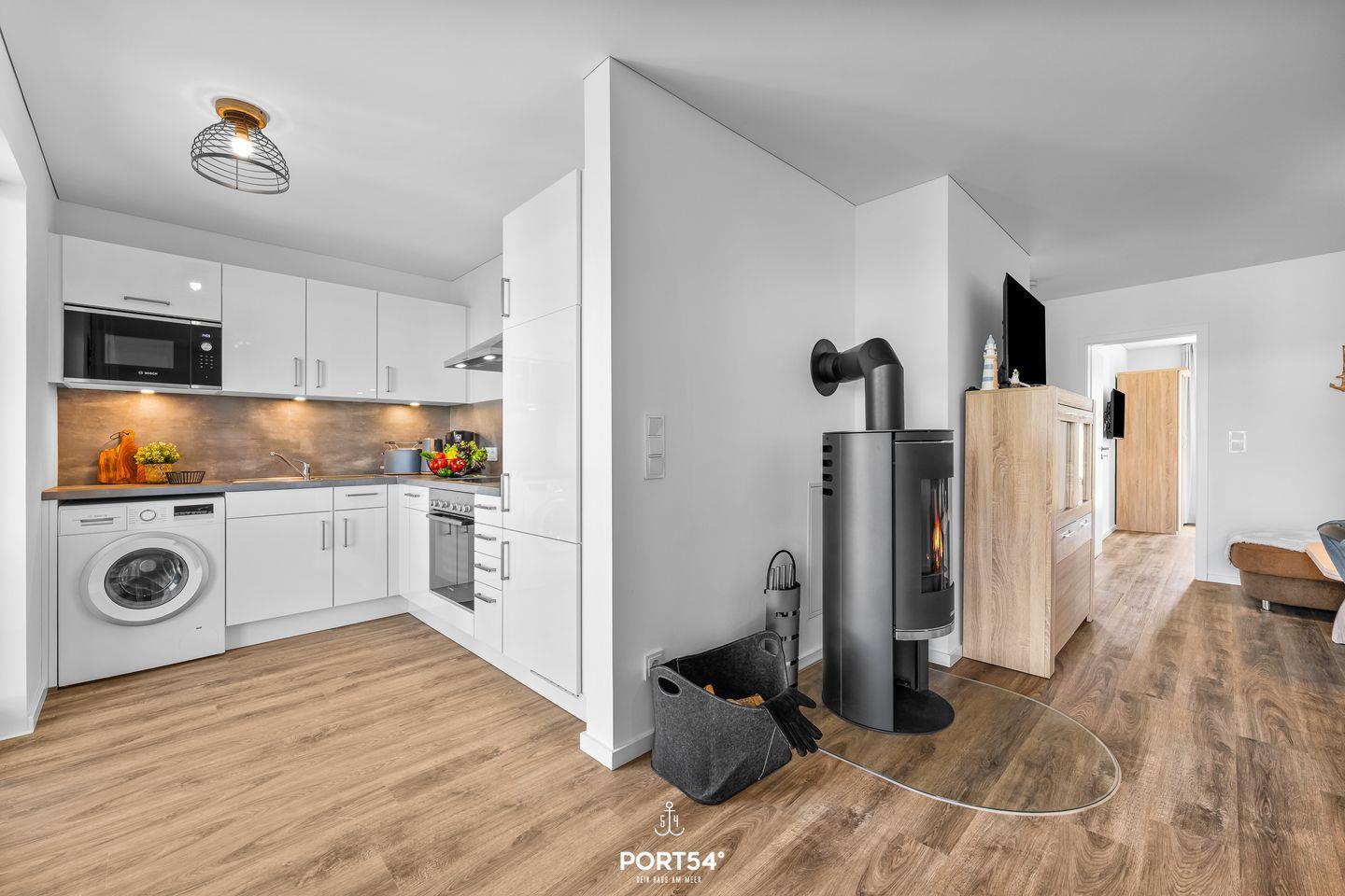 Im lichtdurchfluteten Wohnbereich kannst Du Deine Abende gemütlich auf dem Sofa vor dem Flachbild-Fernseher ausklingen lassen, während der Kamin für angenehme Wärme und Gemütlichkeit sorgt. Angrenzend befindet sich eine voll ausgestattete Küche mit Waffeleisen, Mikrowelle und Toaster, in der auch eine Waschmaschine untergebracht ist. Dein Frühstück kannst Du am großzügigen Esstisch oder auf der Terrasse genießen. Die Terrasse ist überdacht und mit bequemen Gartenmöbeln sowie einem Elektrogrill ausgestattet.