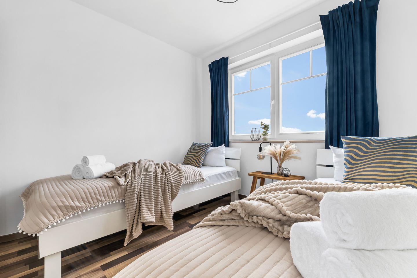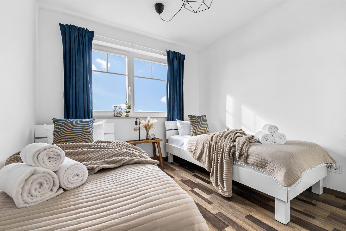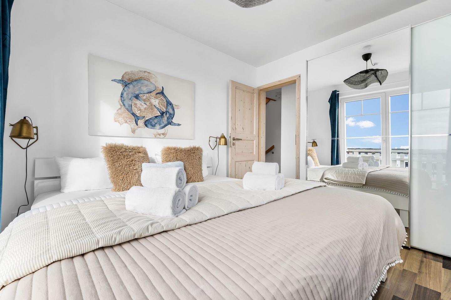 Im ersten Obergeschoss befinden sich die beiden Schlafzimmer. Sie sind bequem eingerichtet und sorgen für ruhige Nächte, bei offenem Fenster sogar mit Meeresrauschen. Das Hauptschlafzimmer hat ein großes Doppelbett mit Nachttischen und einen geräumigen Kleiderschrank. Der angrenzende Balkon bietet einen wunderschönen Blick aufs Wasser, den Yachthafen und vorbeiziehende Segelboote. Das zweite Schlafzimmer hat zwei Einzelbetten, die auf Wunsch auch zusammengestellt werden können.
