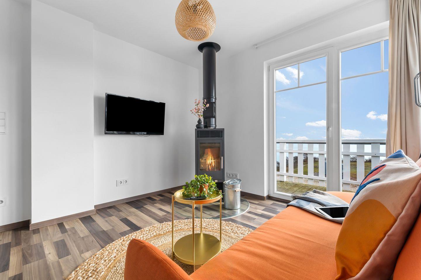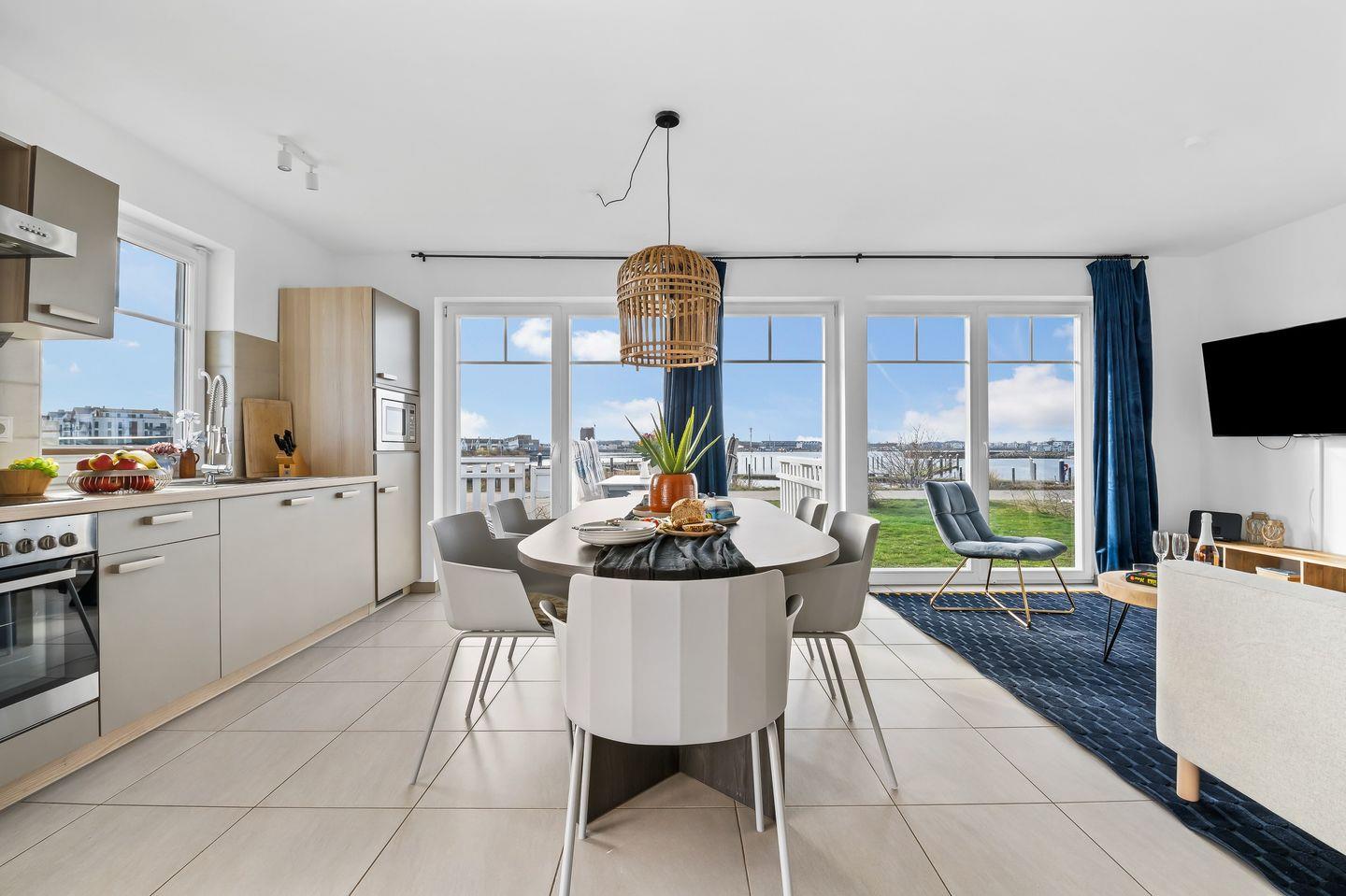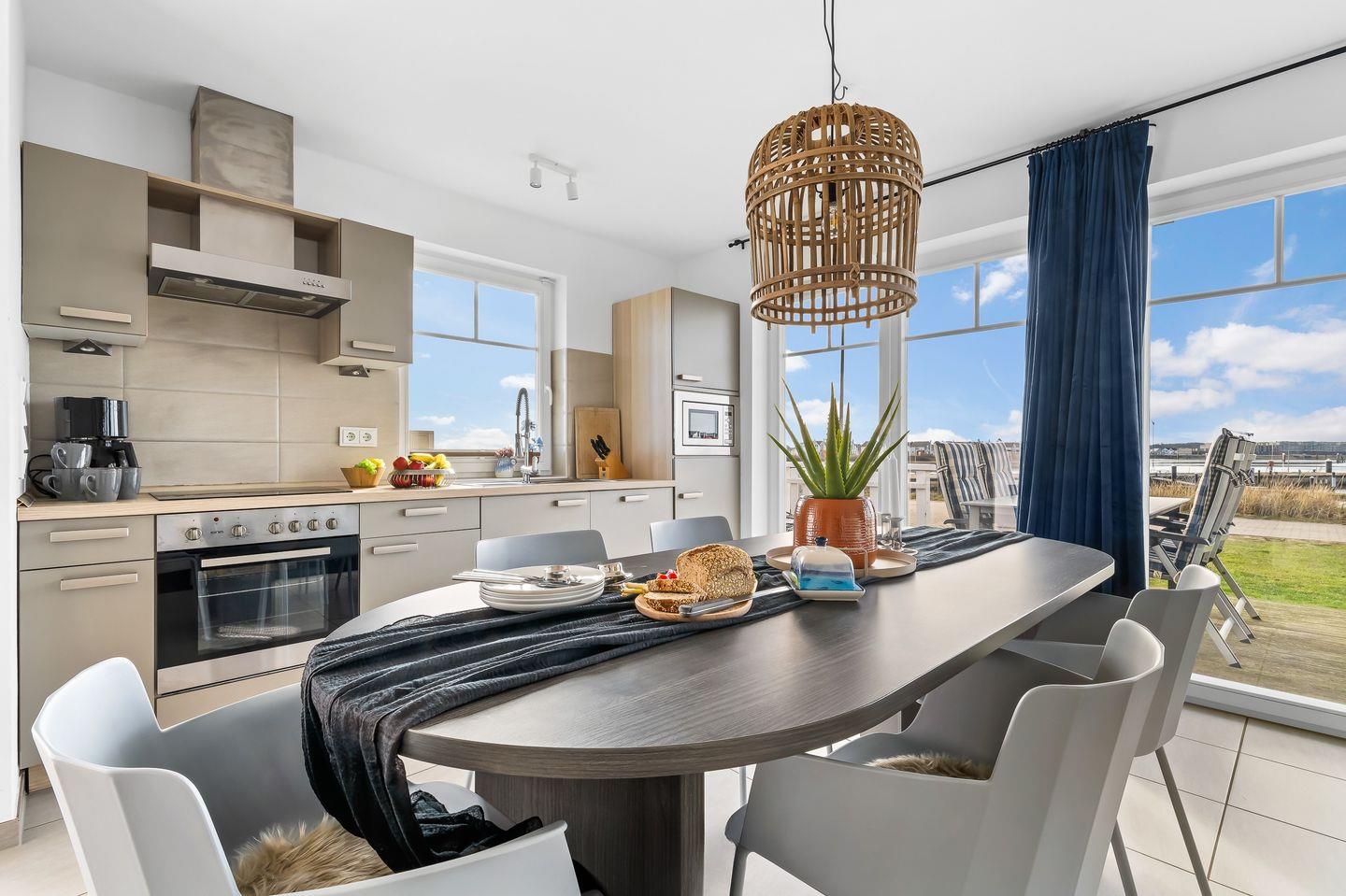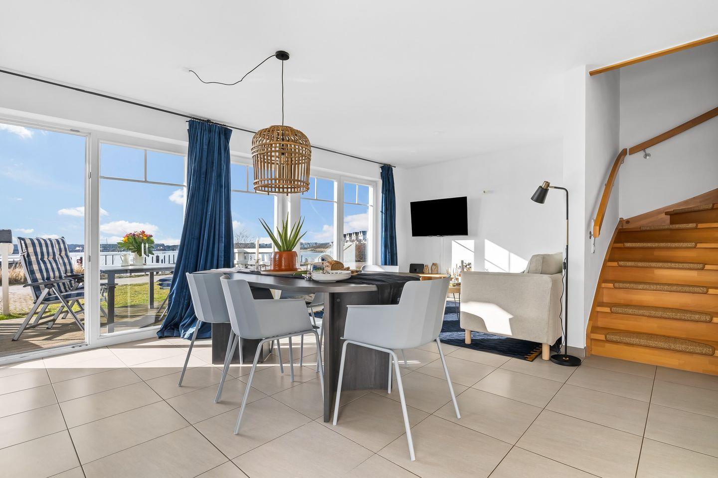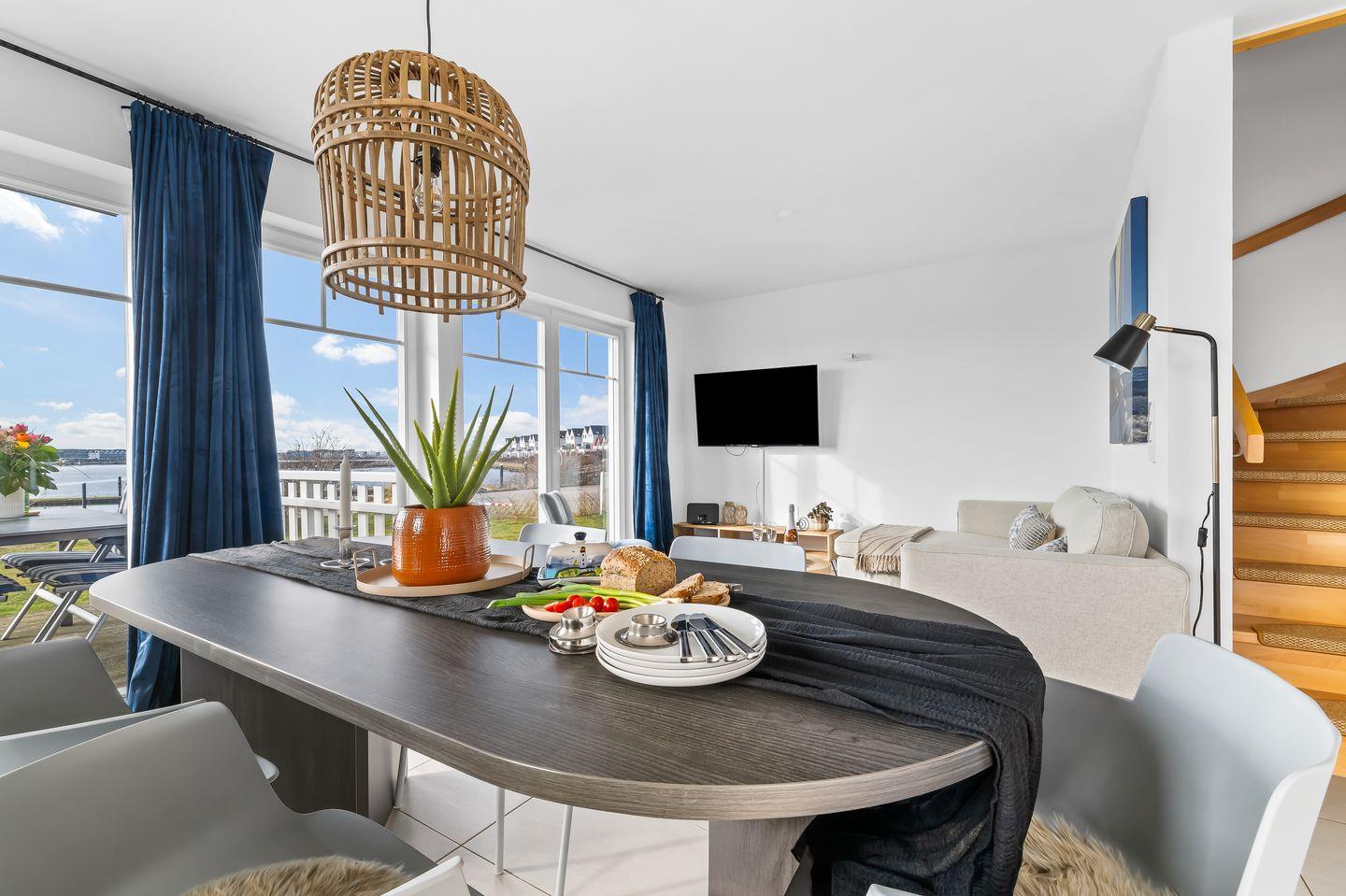 Im Erdgeschoss befindet sich ein heller, offener Wohn- und Essbereich. Der Wohnbereich hat ein gemütliches Sofa, einen Sessel und einen großen Fernseher. Die moderne, voll ausgestattete Küche bietet alles, was das Herz begehrt, und sorgt dafür, dass Sie beim Kochen nie allein sind. Von hier gelangen Sie auf die gemütliche Terrasse mit bequemen Gartenmöbeln, einem Tisch sowie einem Grill für entspannte Stunden im Freien. Perfekt für ein Frühstück oder gesellige Abende mit Blick aufs Wasser.