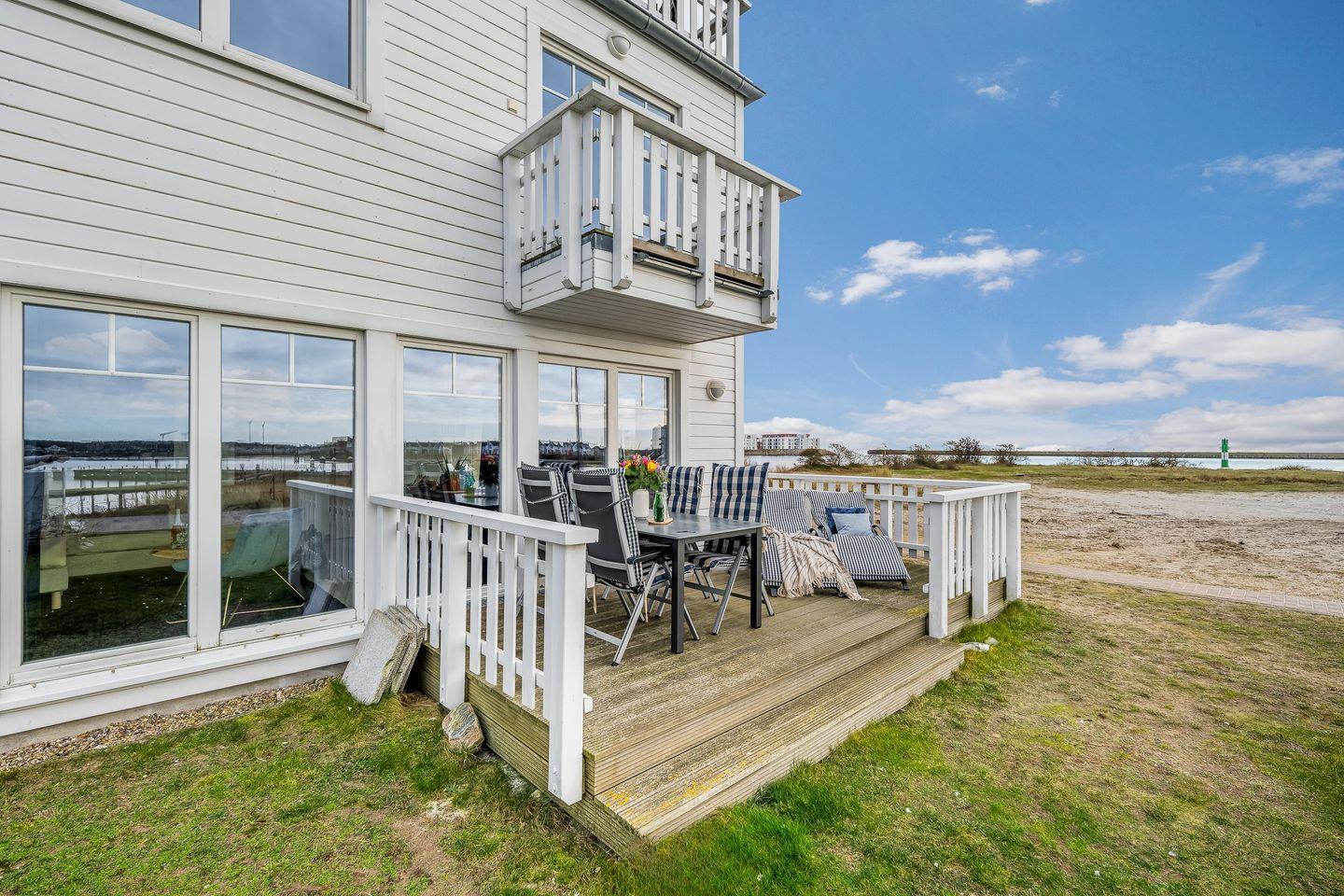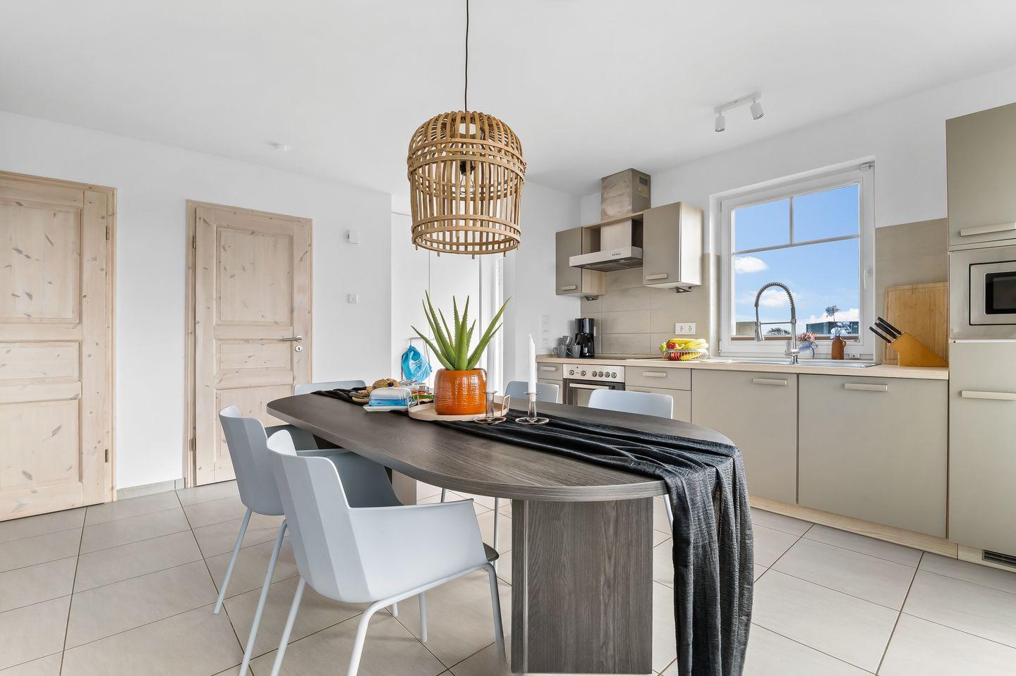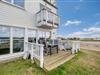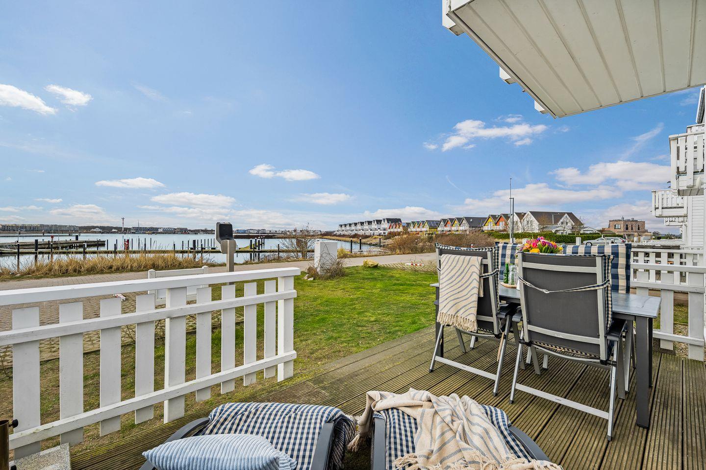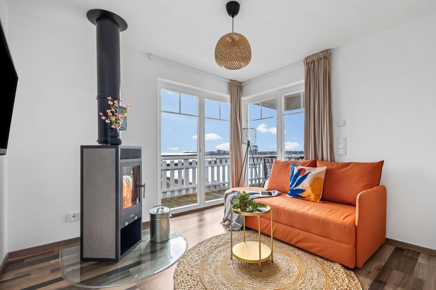Im Erdgeschoss befindet sich ein heller, offener Wohn- und Essbereich. Der Wohnbereich hat ein gemütliches Sofa, einen Sessel und einen großen Fernseher. Die moderne, voll ausgestattete Küche bietet alles, was das Herz begehrt, und sorgt dafür, dass Sie beim Kochen nie allein sind. Von hier gelangen Sie auf die gemütliche Terrasse mit bequemen Gartenmöbeln, einem Tisch sowie einem Grill für entspannte Stunden im Freien. Perfekt für ein Frühstück oder gesellige Abende mit Blick aufs Wasser.