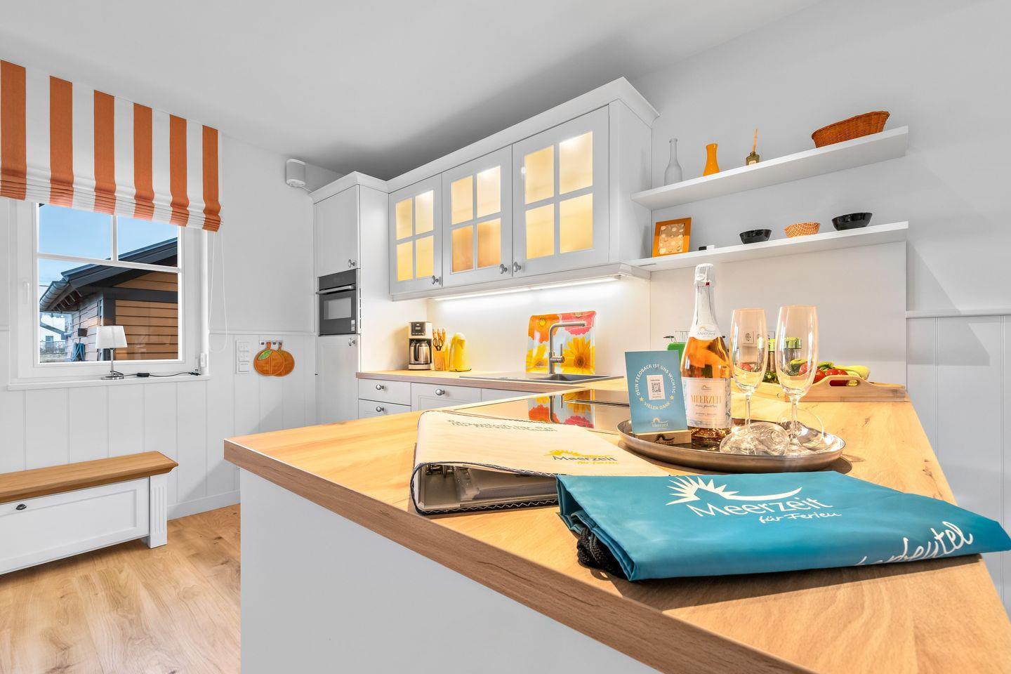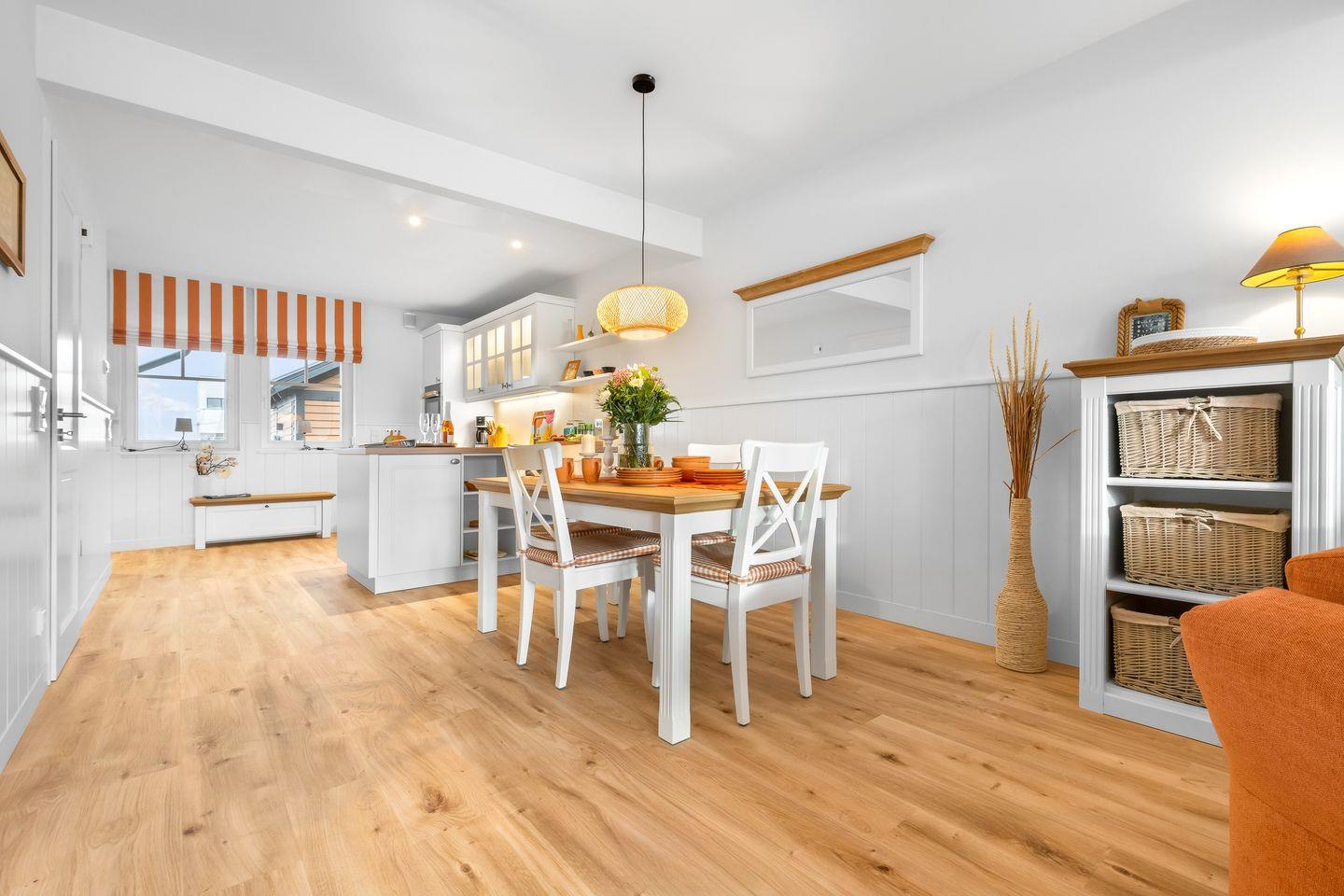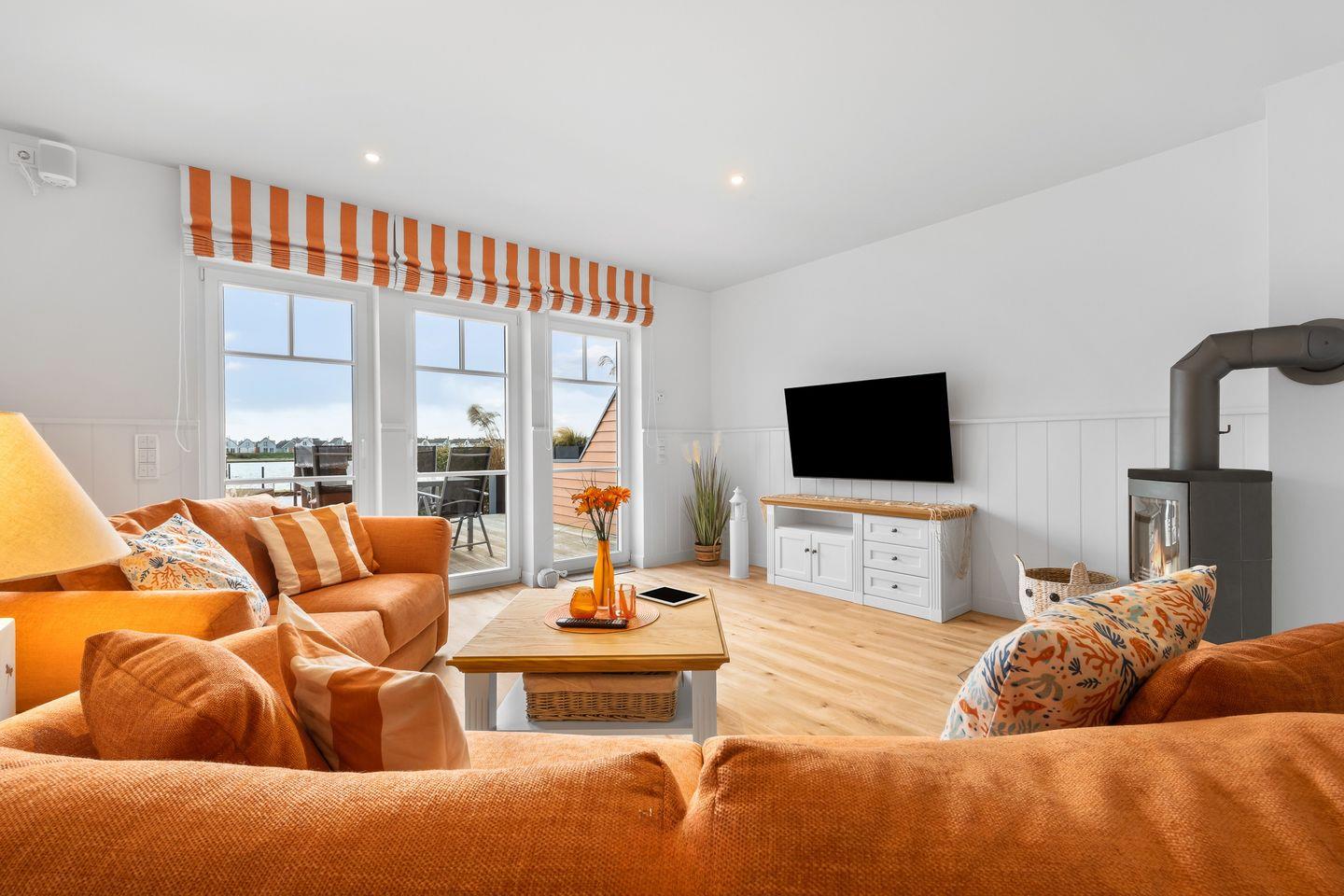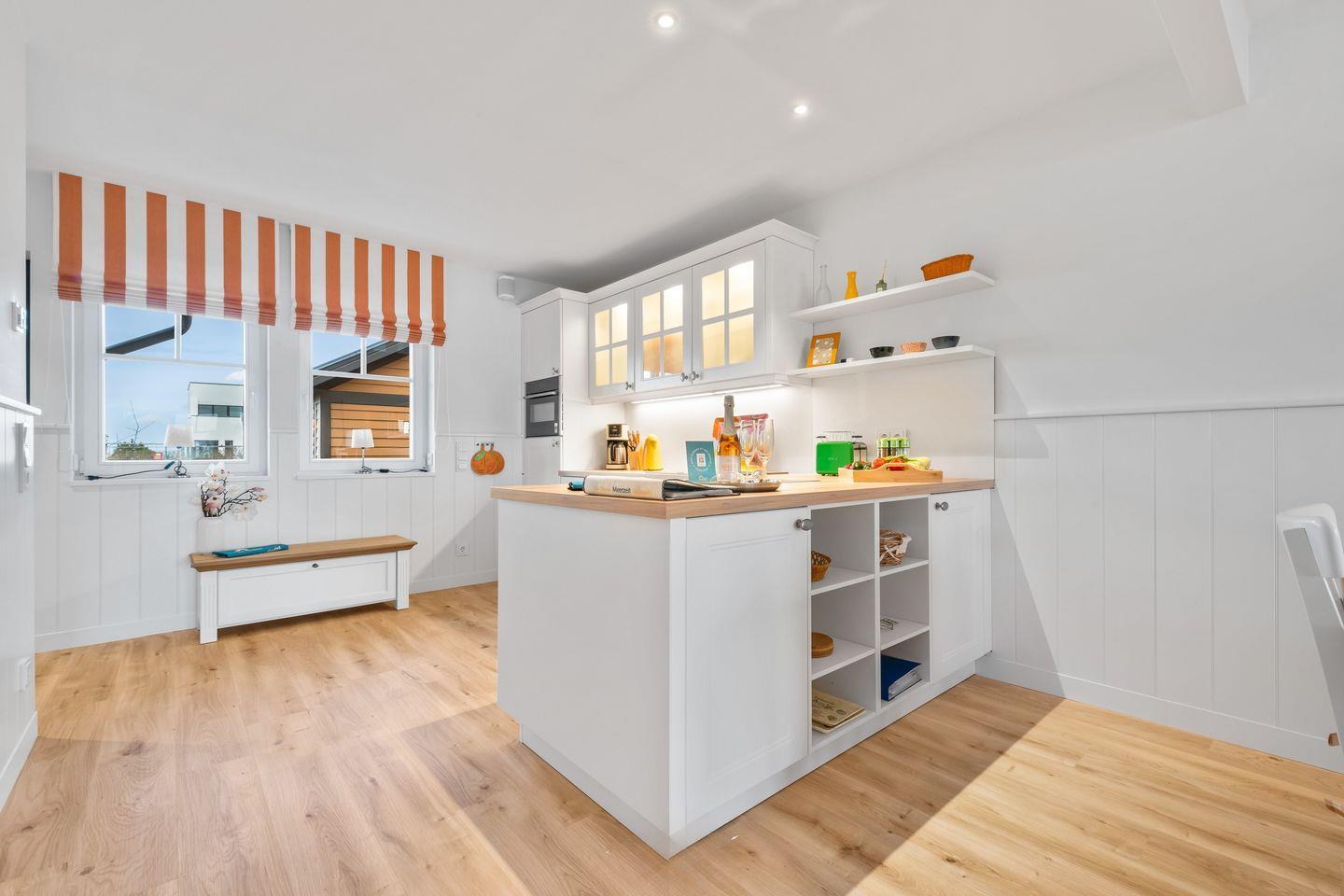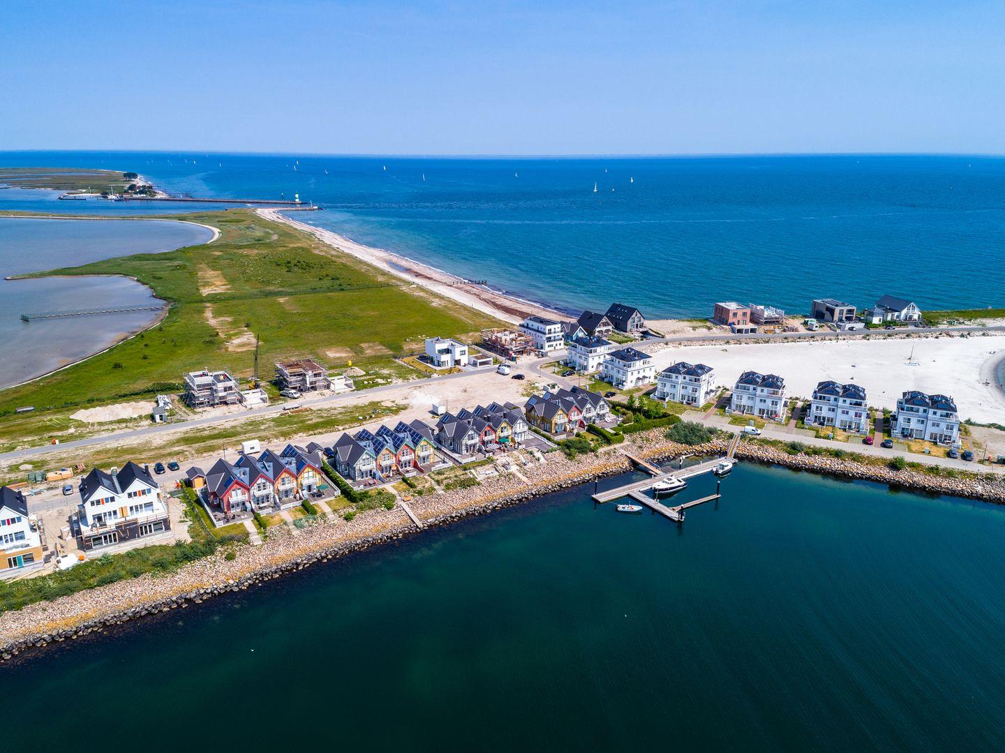 Der lichtdurchflutete Wohn- und Essbereich mit bodentiefen Panoramafenstern bietet einen herrlichen Blick auf den Segel- und Sportboothafen des Ostseeresorts Olpenitz. Entspannen Sie auf den bequemen Sofas oder genießen Sie den Abend vor dem knisternden Kaminfeuer. Die moderne Küche ist bestens ausgestattet und lässt keine Wünsche offen.