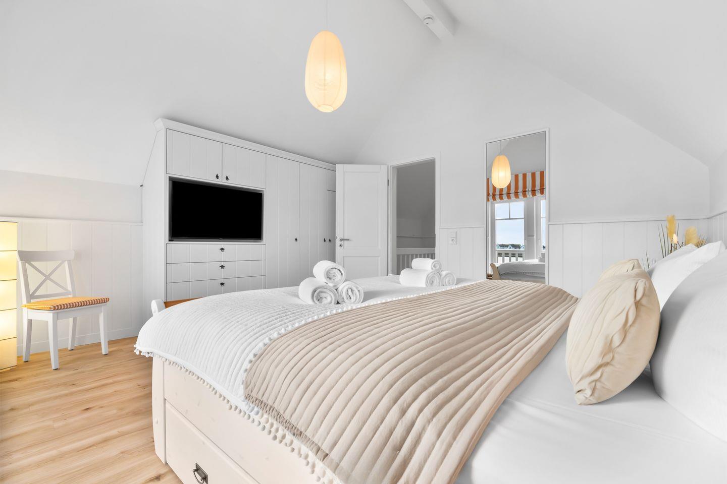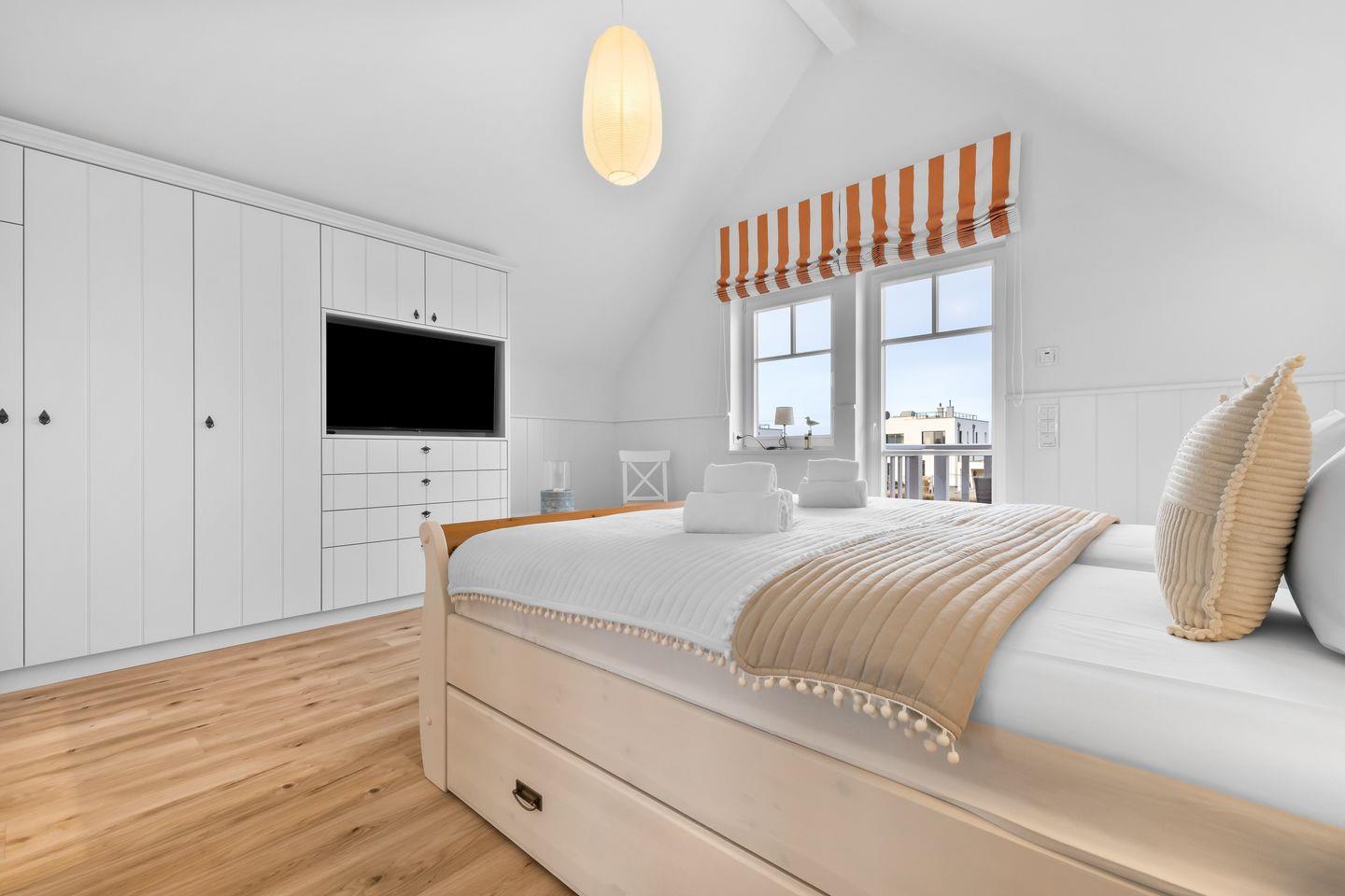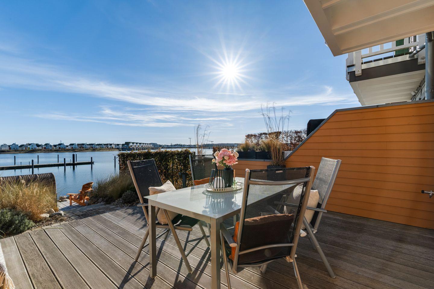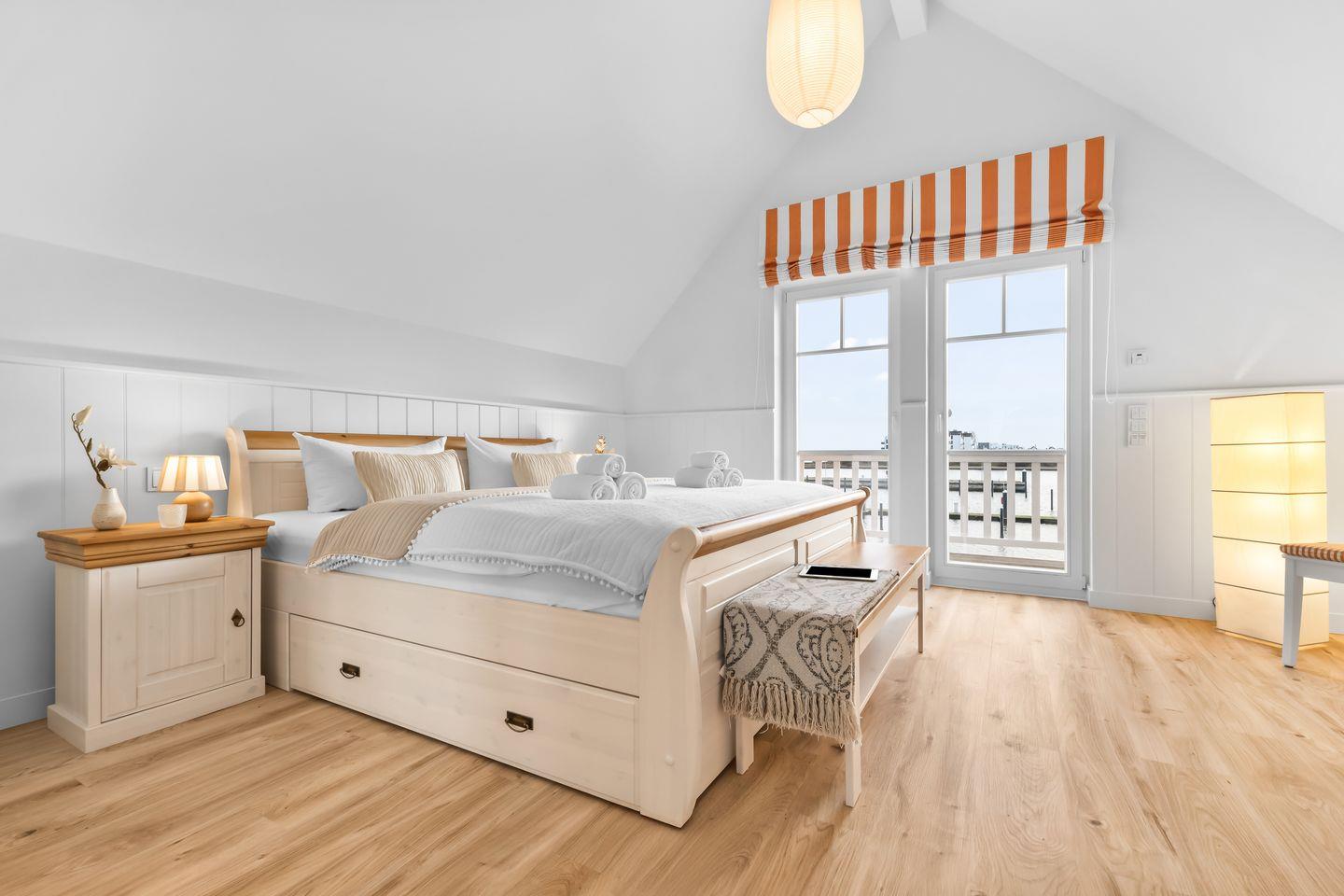 Im Obergeschoss erwarten Sie zwei Schlafzimmer mit komfortablen Doppelbetten, Flatscreen und geräumigen Kleiderschränken. Das Badezimmer bietet eine bodengleiche Dusche und eine finnische Sauna. Das Schlafzimmer mit Balkon lädt dazu ein, die ersten Sonnenstrahlen und den Panoramablick über den Hafen zu genießen.