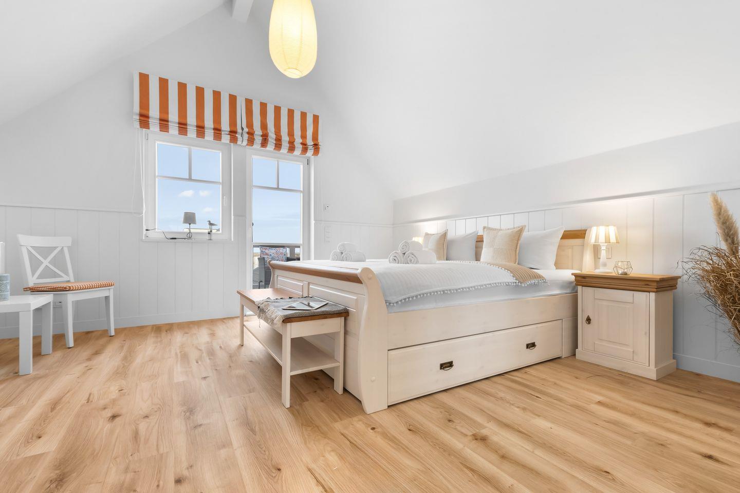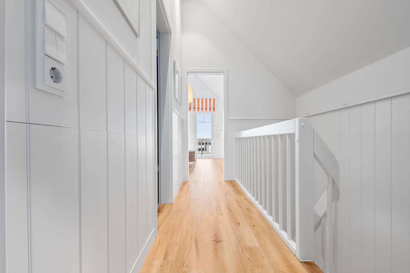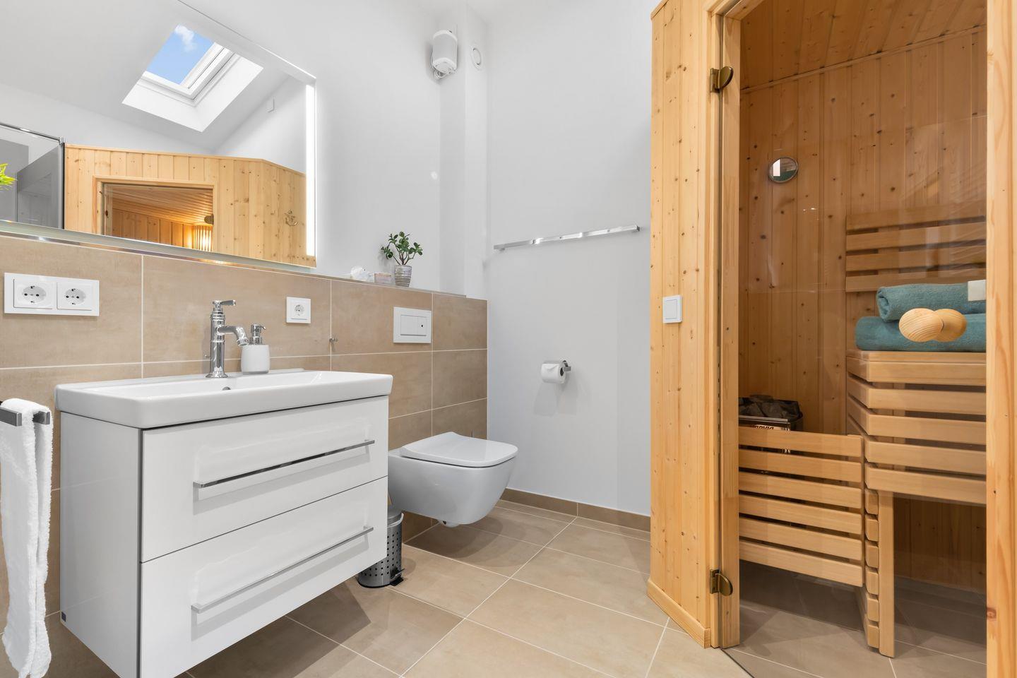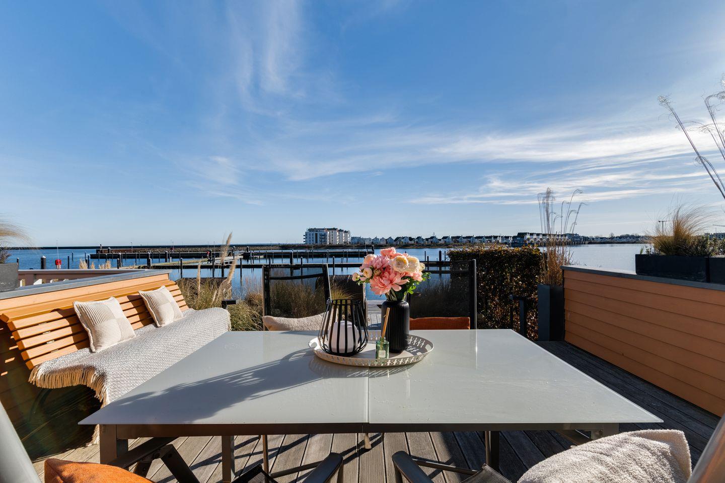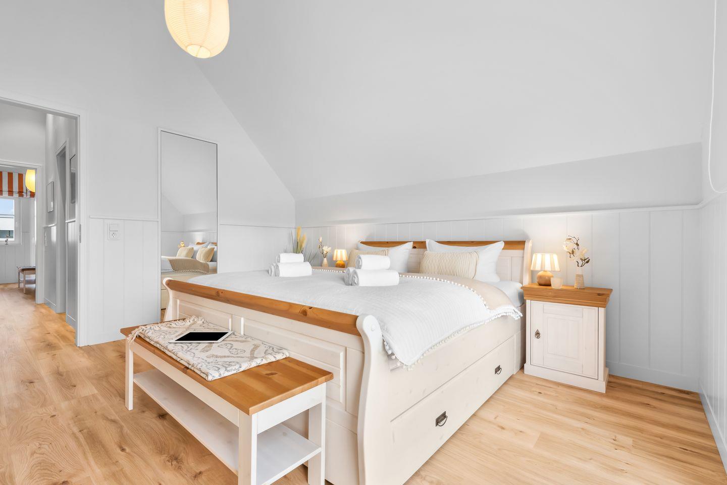 Im Obergeschoss erwarten Sie zwei Schlafzimmer mit komfortablen Doppelbetten, Flatscreen und geräumigen Kleiderschränken. Das Badezimmer bietet eine bodengleiche Dusche und eine finnische Sauna. Das Schlafzimmer mit Balkon lädt dazu ein, die ersten Sonnenstrahlen und den Panoramablick über den Hafen zu genießen.