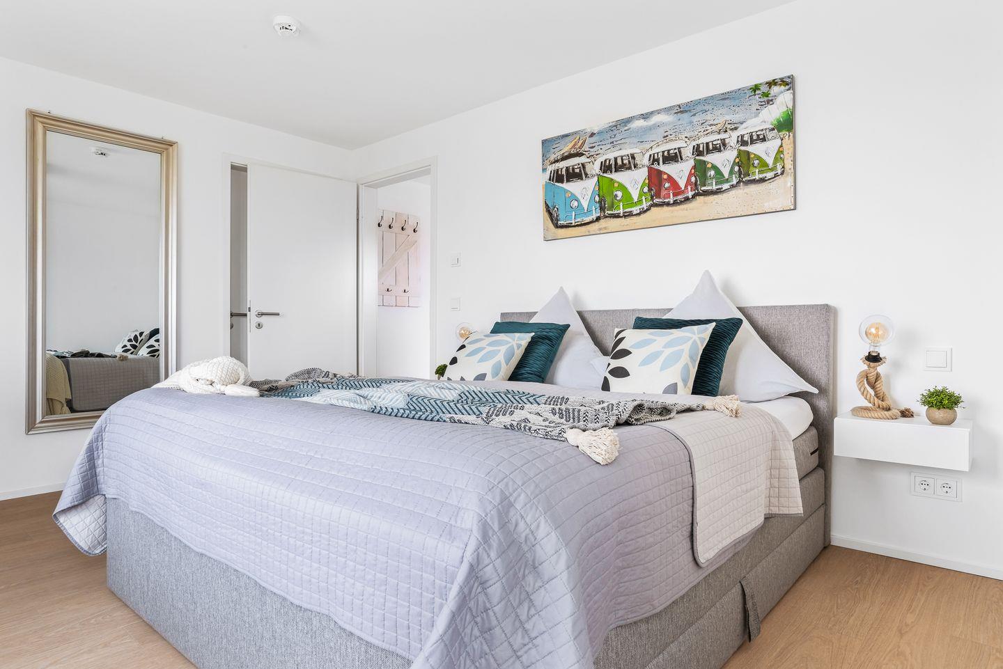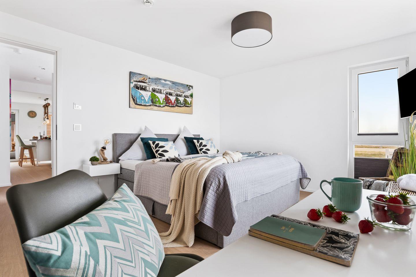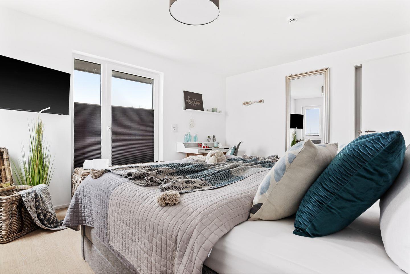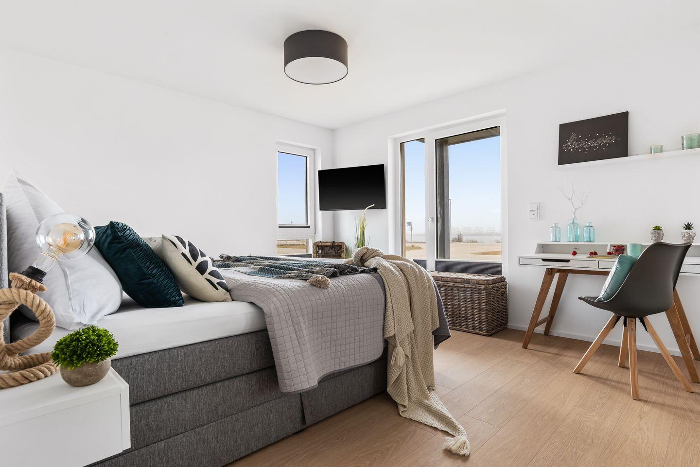 Im Schlafzimmer erwartet Dich ein großzügiges Boxspringbett (200 × 200 cm), und Verdunkelungsmöglichkeiten garantieren Dir erholsame Nächte. Ein weiterer Flachbild-Fernseher sorgt für Unterhaltung, zudem bietet Dir ein Schreibtisch die Möglichkeit, auch im Urlaub produktiv und kreativ zu sein.