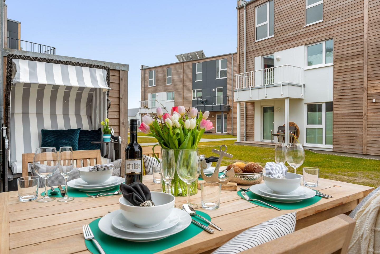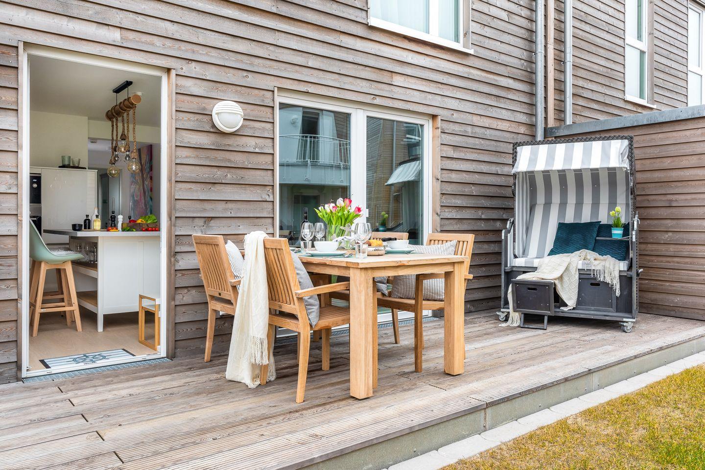 Die große Hauptterrasse ist ein wahres Highlight. Ausgestattet mit einem Weber-Elektrogrill, einem gemütlichen Strandkorb und komfortablen Terrassenmöbeln lädt sie Dich zu entspannten Stunden im Freien ein.