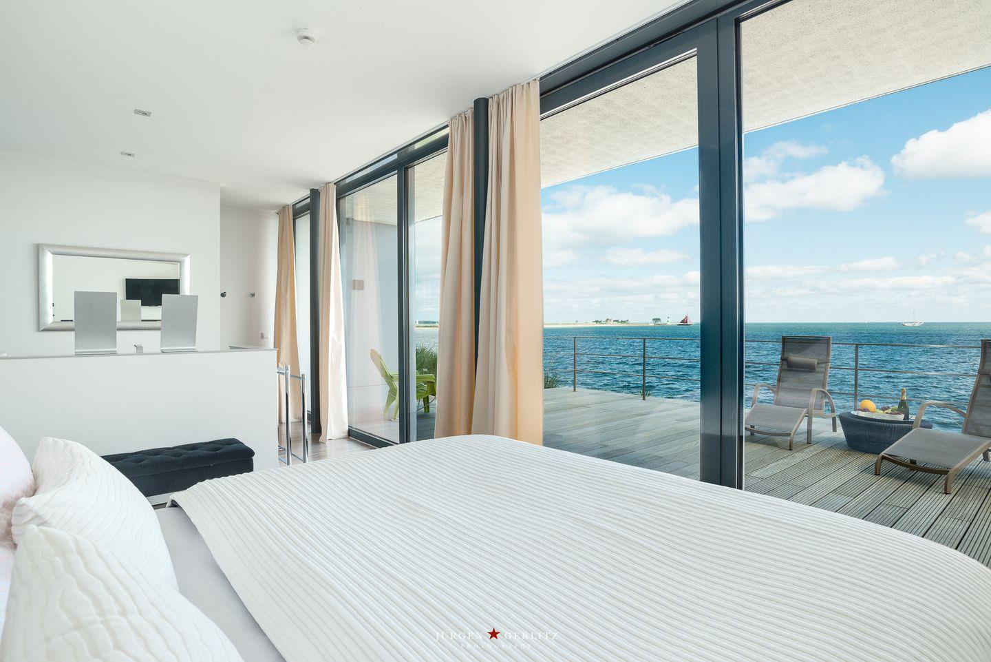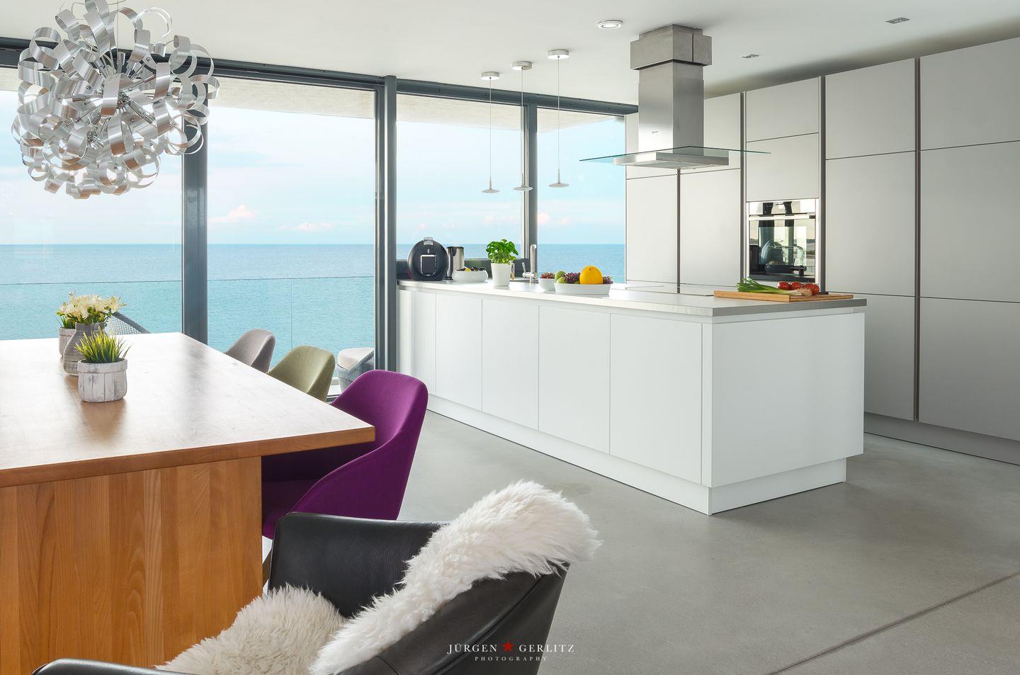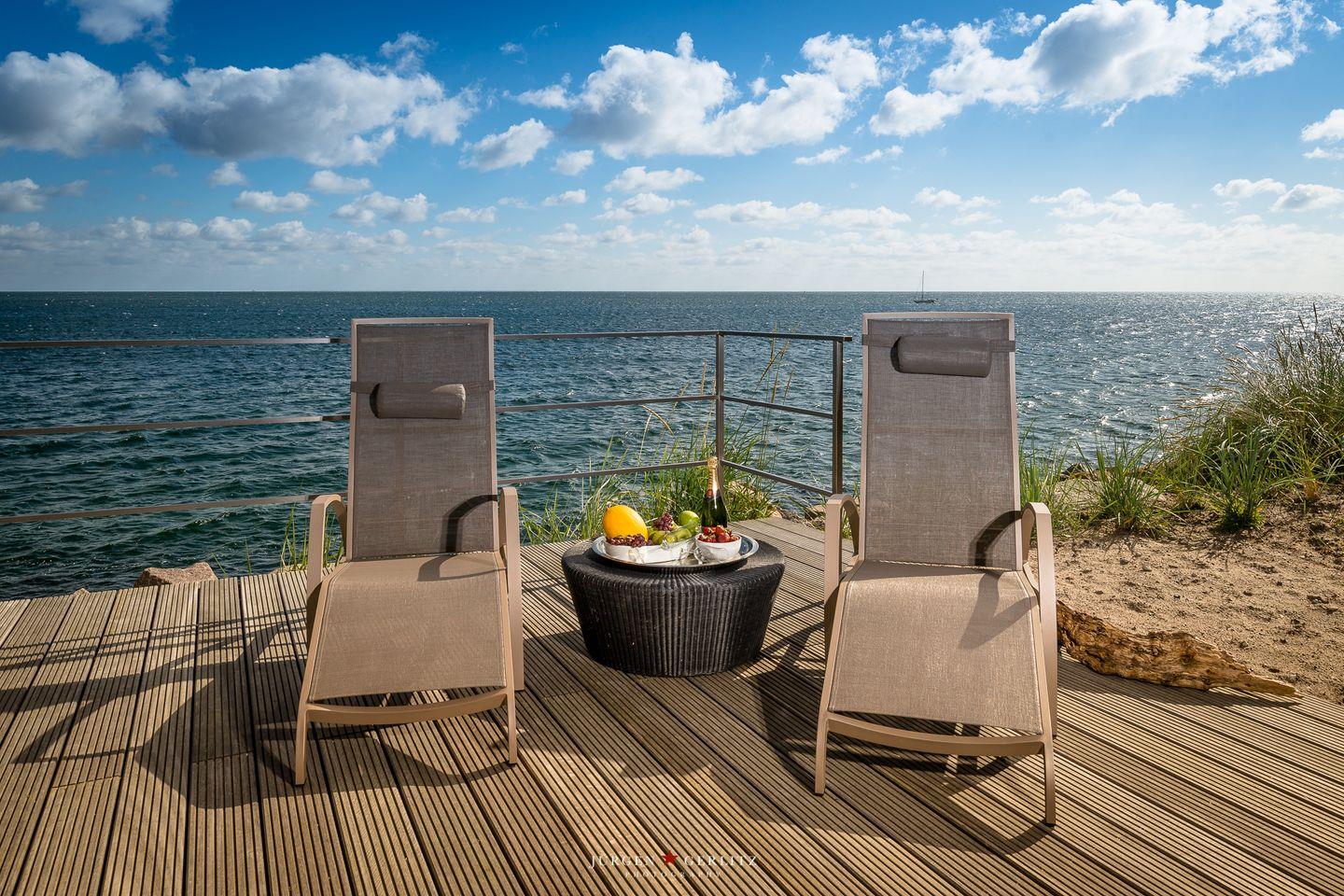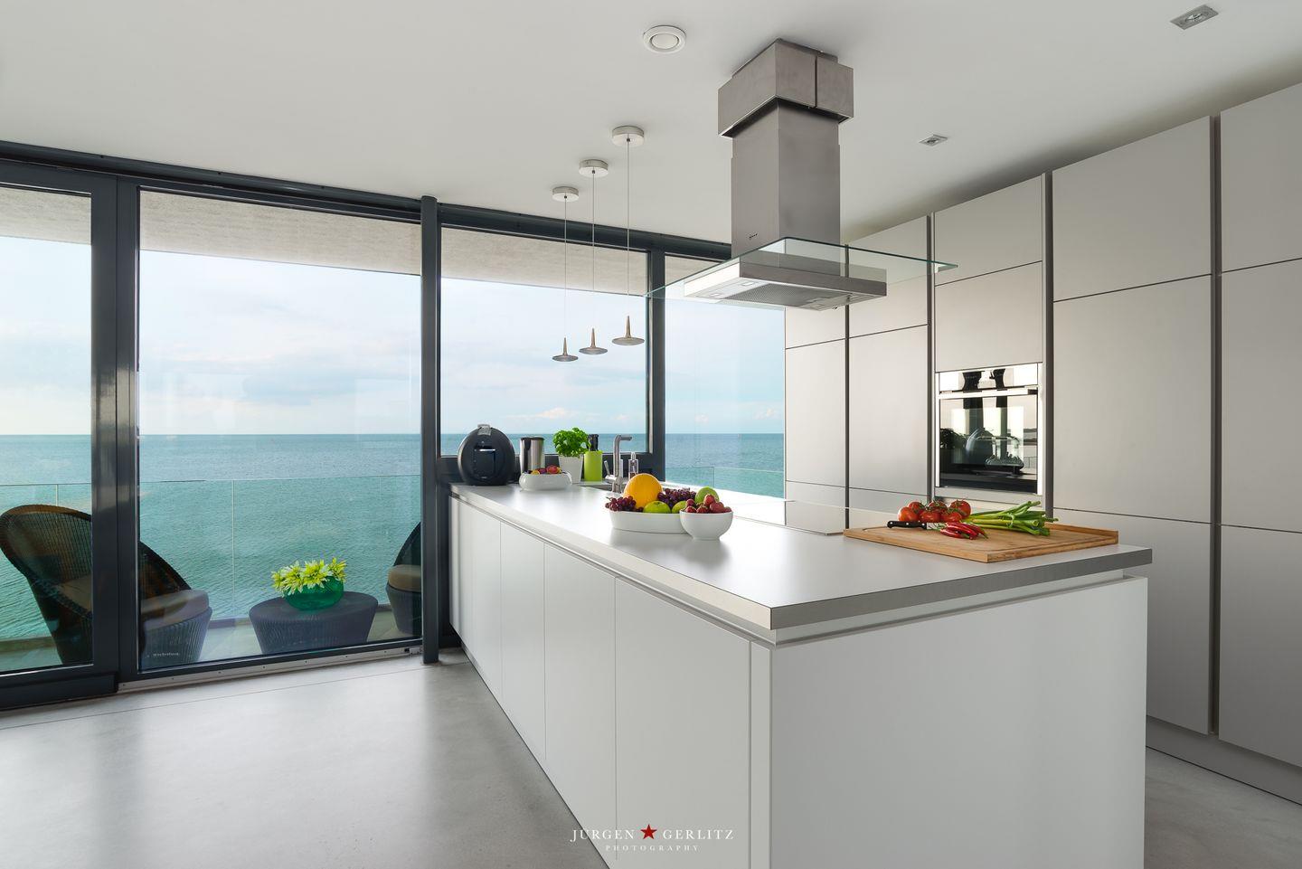 Die offene Küche ist mit modernen Kochutensilien und Geräten ausgestattet, darunter ein Induktionsherd, ein Backofen und eine Spülmaschine, sodass Kochen zum Vergnügen wird. Der stilvoll eingerichtete Essbereich verbindet Küche und Wohnzimmer und bietet Dir durch die großen Fensterfronten einen außergewöhnlichen Blick auf die Ostsee. Hier kannst Du gemeinsame Stunden bei einem köstlichen Essen oder einem unterhaltsamen Spieleabend genießen. Sowohl vom Essbereich als auch vom Wohnbereich aus gelangst Du auf einen Balkon – Exklusivität, die ihresgleichen sucht.
