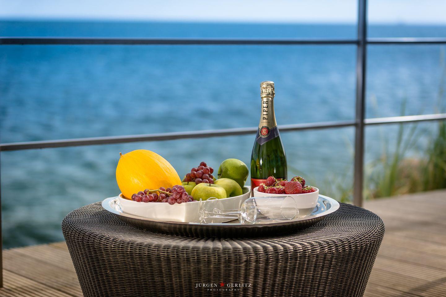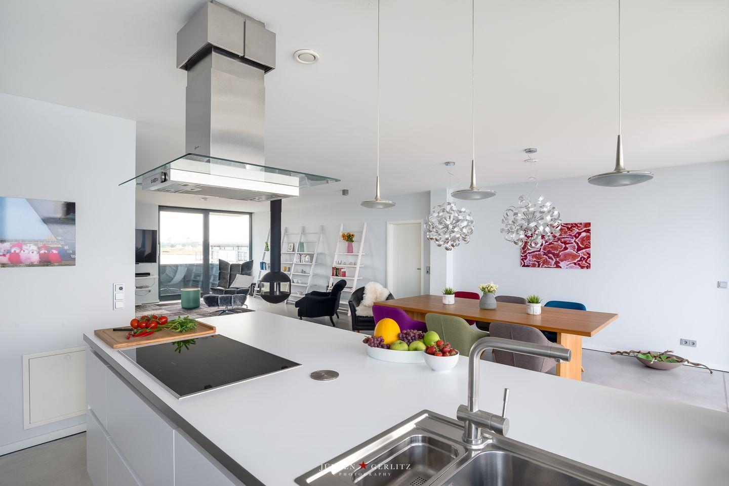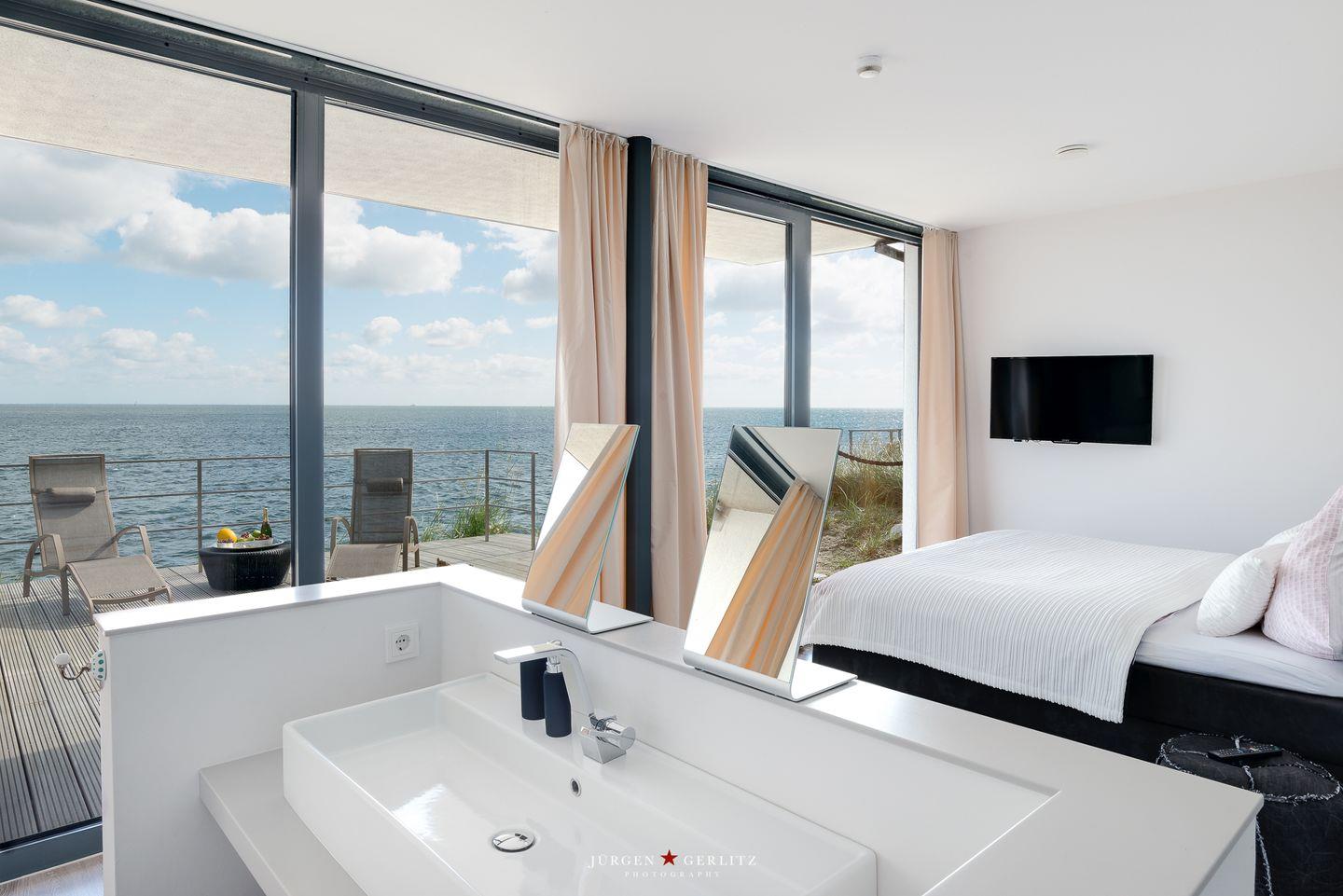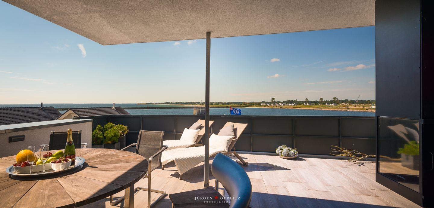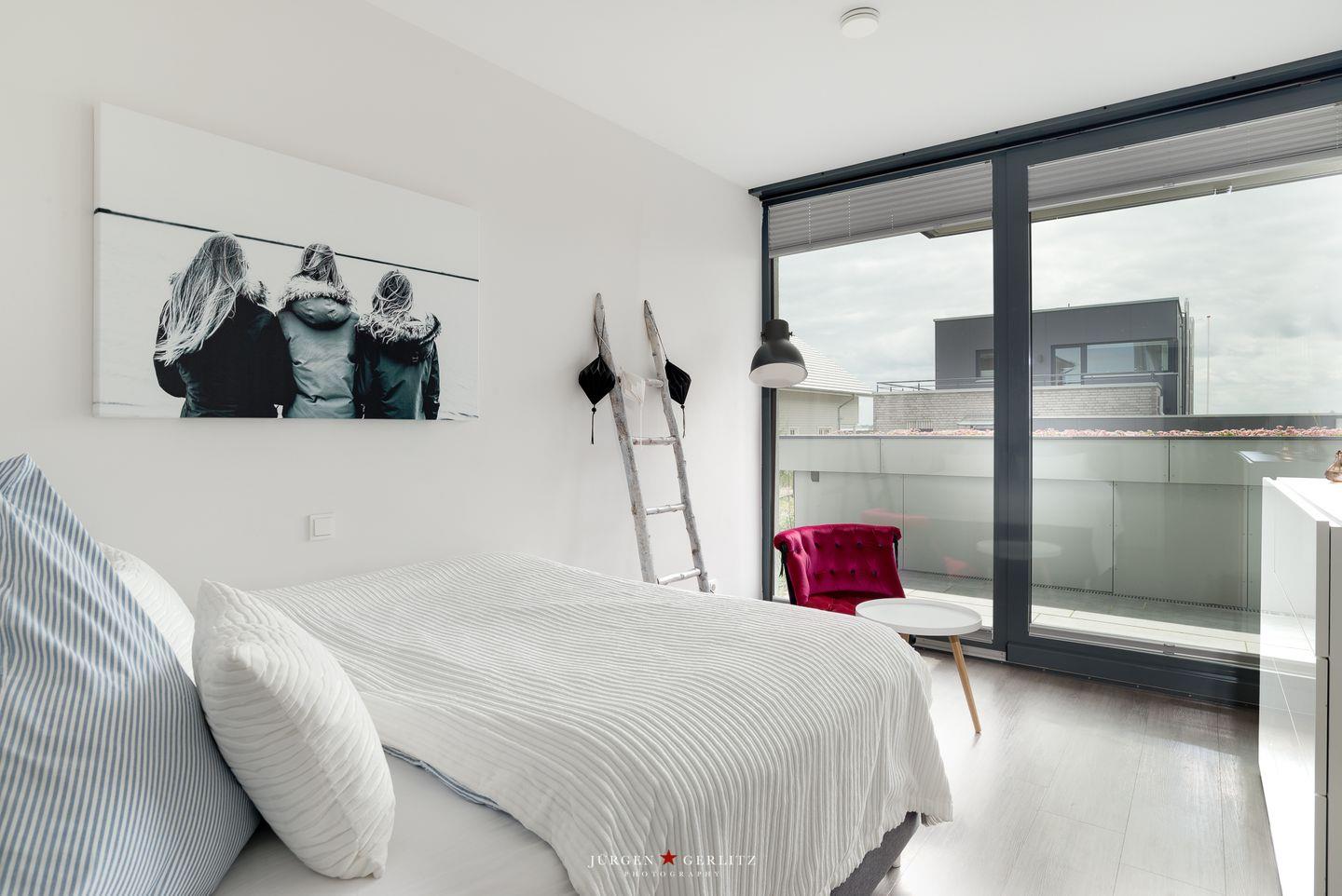 Die offene Küche ist mit modernen Kochutensilien und Geräten ausgestattet, darunter ein Induktionsherd, ein Backofen und eine Spülmaschine, sodass Kochen zum Vergnügen wird. Der stilvoll eingerichtete Essbereich verbindet Küche und Wohnzimmer und bietet Dir durch die großen Fensterfronten einen außergewöhnlichen Blick auf die Ostsee. Hier kannst Du gemeinsame Stunden bei einem köstlichen Essen oder einem unterhaltsamen Spieleabend genießen. Sowohl vom Essbereich als auch vom Wohnbereich aus gelangst Du auf einen Balkon – Exklusivität, die ihresgleichen sucht.