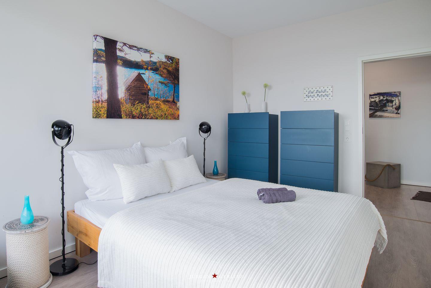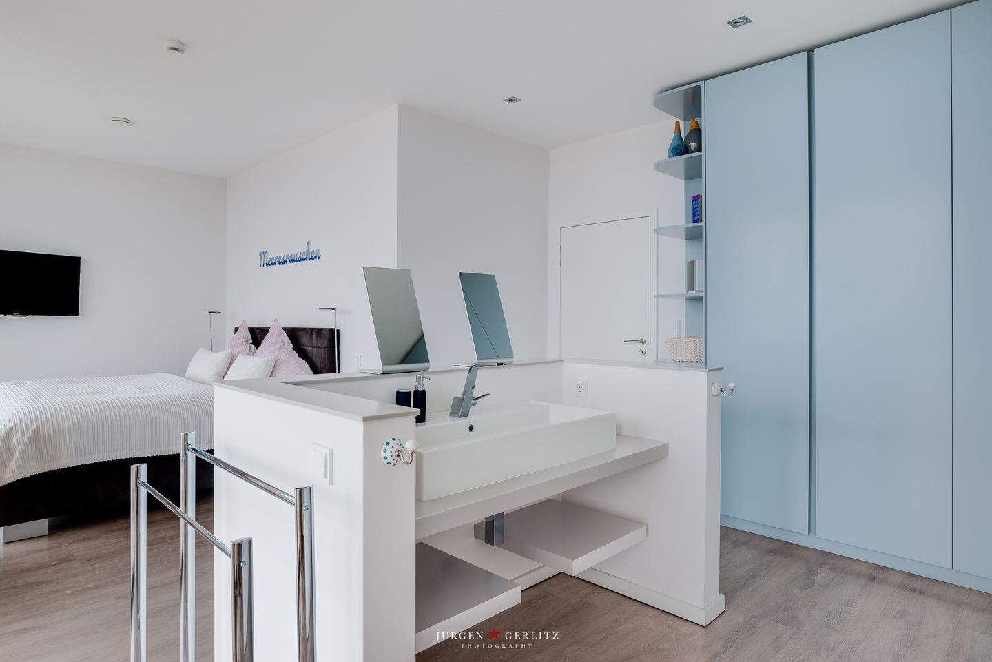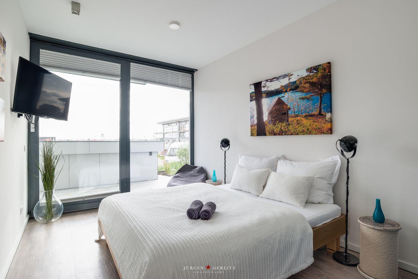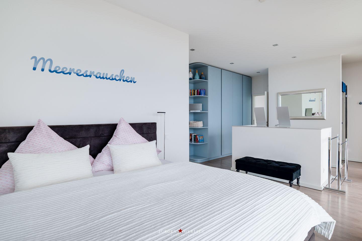 Die offene Küche ist mit modernen Kochutensilien und Geräten ausgestattet, darunter ein Induktionsherd, ein Backofen und eine Spülmaschine, sodass Kochen zum Vergnügen wird. Der stilvoll eingerichtete Essbereich verbindet Küche und Wohnzimmer und bietet Dir durch die großen Fensterfronten einen außergewöhnlichen Blick auf die Ostsee. Hier kannst Du gemeinsame Stunden bei einem köstlichen Essen oder einem unterhaltsamen Spieleabend genießen. Sowohl vom Essbereich als auch vom Wohnbereich aus gelangst Du auf einen Balkon – Exklusivität, die ihresgleichen sucht.
