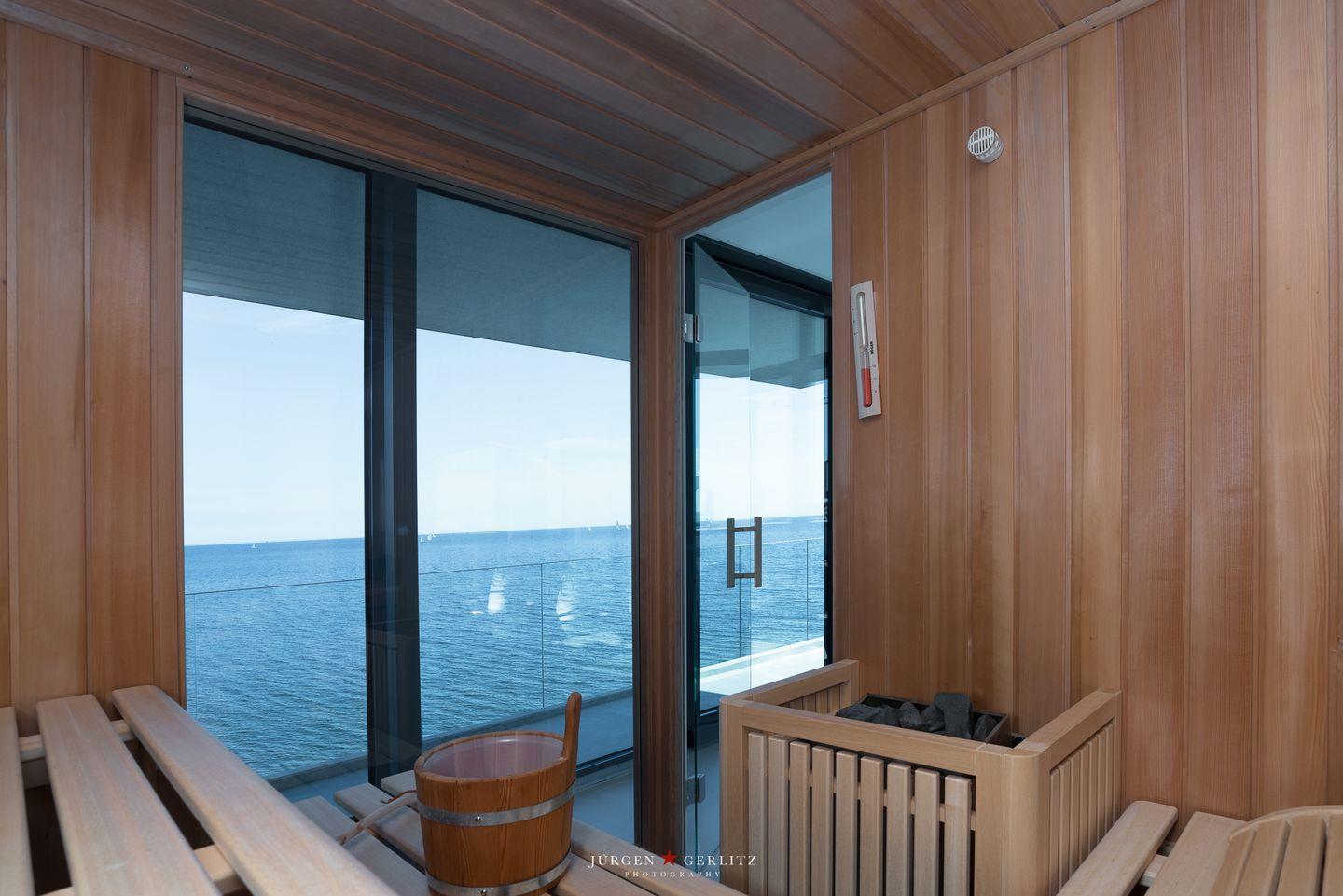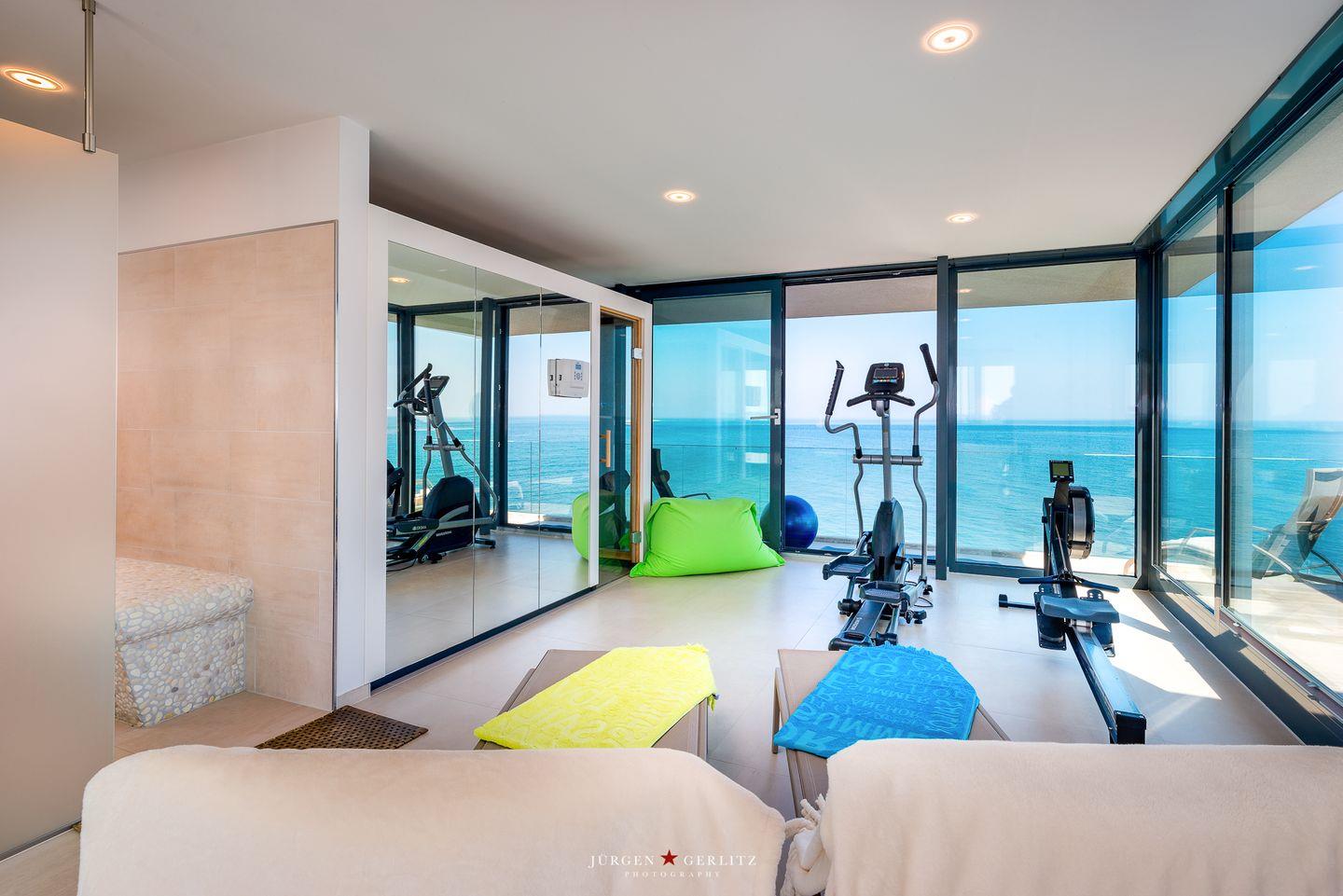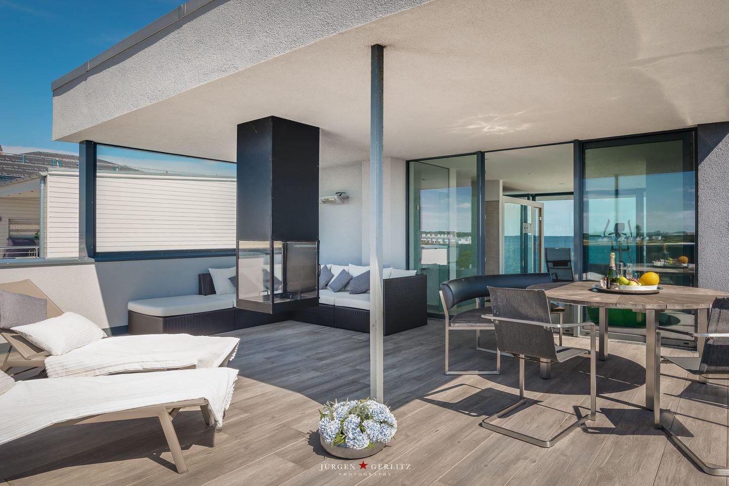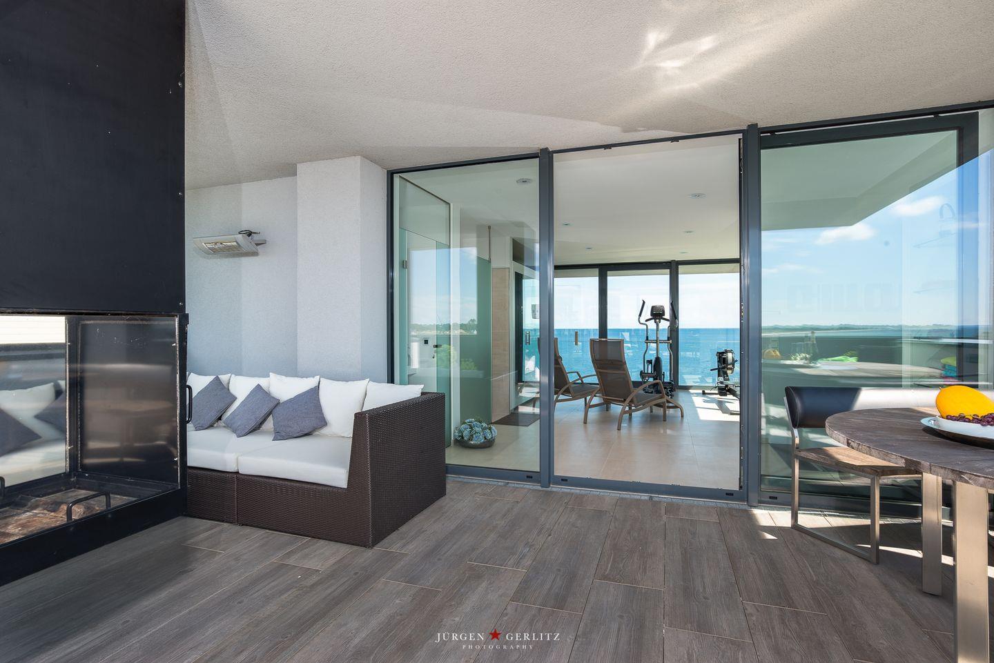 Im zweiten Obergeschoss erwartet Dich ein weiteres Highlight: ein eigener Fitnessraum mit Geräten sowie eine finnische Sauna, die Deinen Urlaub zu einem wundervollen Wellness-Erlebnis machen. Von hier aus gelangst Du auf die große Dachterrasse, die Dir einen atemberaubenden Blick auf die umliegende Natur und die Ostsee bietet. Nach einem erlebnisreichen Urlaubstag ist dies der perfekte Ort, um vollkommen zu entspannen. Eine Lounge, ein großzügiger Essbereich und Sonnenliegen runden das Angebot ab. Der Außenkamin ermöglicht Dir unvergessliche Abende, während Du die frische Ostseeluft genießt oder ein köstliches Barbecue auf dem Elektrogrill zubereitest.