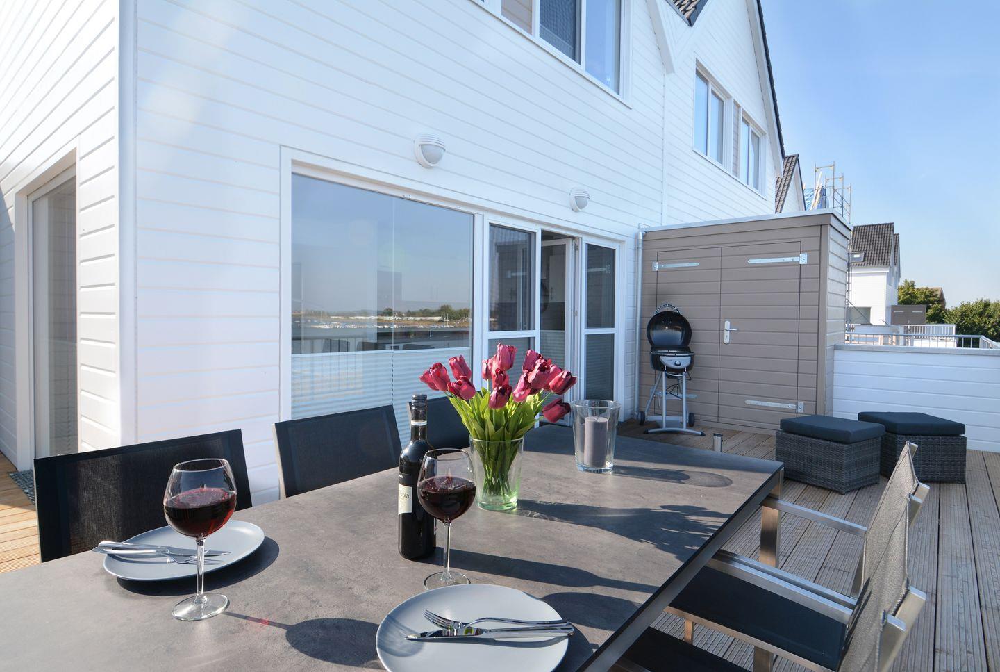 Besonders hervorzuheben sind die beiden Balkone, auf denen Du die Sonne den ganzen Tag genießen kannst. Vom Hauptbalkon aus hast Du einen fantastischen Blick auf das Wasser. Genieße die frische Meeresbrise und entspanne auf den Gartenmöbeln, während Du die Aussicht bewundern kannst.