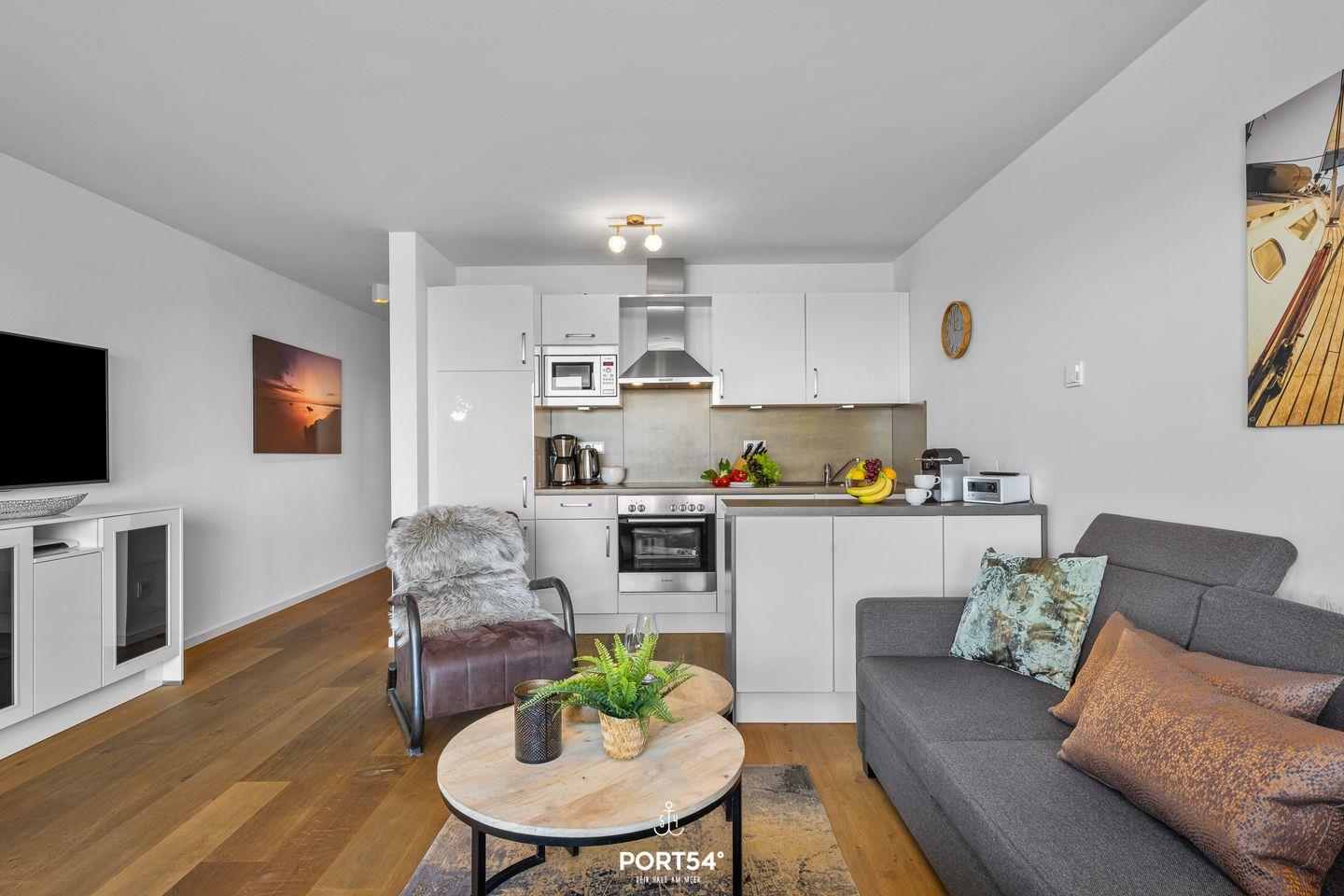 In der freundlichen, offenen Wohnküche mit Essbereich genießt Du nicht nur die hochwertige Küchenzeile, sondern kannst Deinen Blick über das Wasser schweifen lassen. Der Essplatz bietet Dir einen ruhigen Rahmen für gemeinsame Mahlzeiten, während Du auf dem gemütlichen Sofa entspannst oder am TV das Unterhaltungsprogramm wählst – insgesamt stehen Dir zwei Fernseher zur Verfügung. Die Fußbodenheizung sorgt zu jeder Jahreszeit für angenehme Temperaturen.