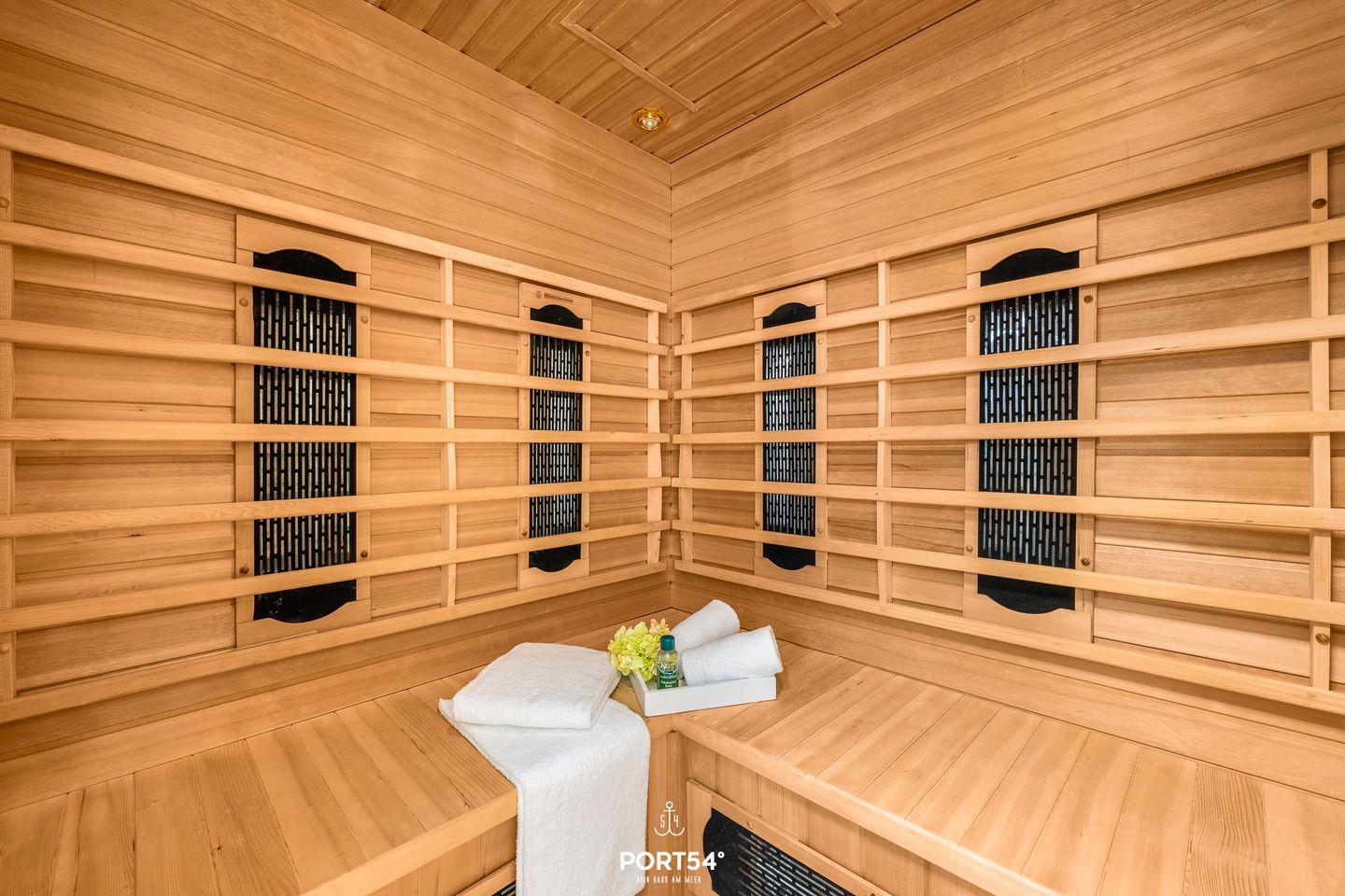 Mit zwei Schlafzimmern, jeweils mit einem Doppelbett ausgestattet, bietet sie Dir Platz für bis zu 4 Personen. In der kalten Jahreszeit kannst Du Dich nach einem Spaziergang in der Infrarot-Sauna sowie in der Badewanne erholen. Eine bodengleiche Dusche ist ebenfalls vorhanden. Auf der Terrasse mit direktem Meerblick kannst Du schöne Stunden verbringen.