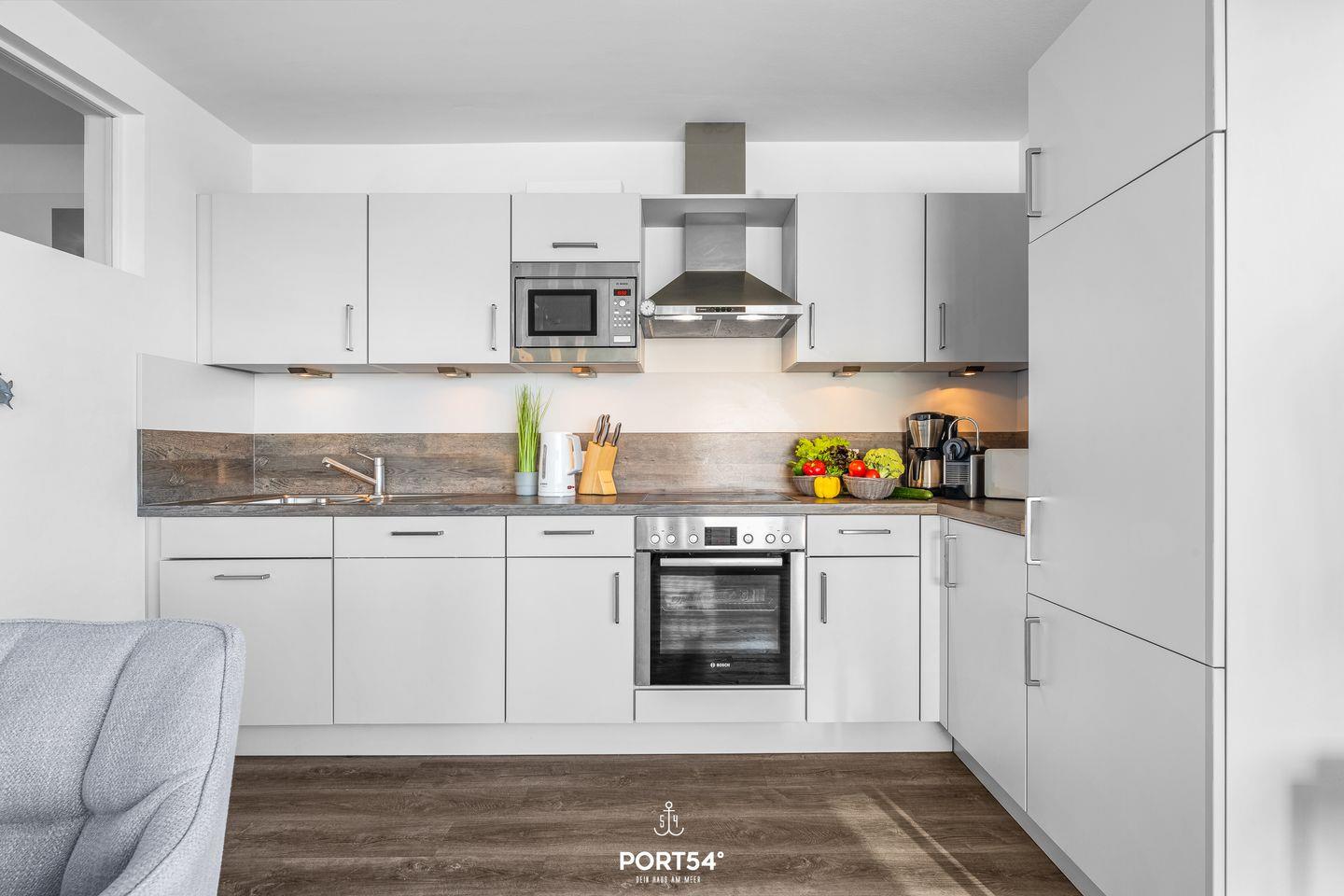 Die offene Küche ist mit modernen Geräten umfassend ausgestattet. Dir stehen unter anderem eine Mikrowelle, eine Spülmaschine, eine Kaffeemaschine, ein Toaster sowie eine Espressomaschine zur Verfügung. Zudem sind ein Bügelbrett, ein Bügeleisen und ein Staubsauger vorhanden, und die Waschmaschine kannst Du zur Eigennutzung verwenden.