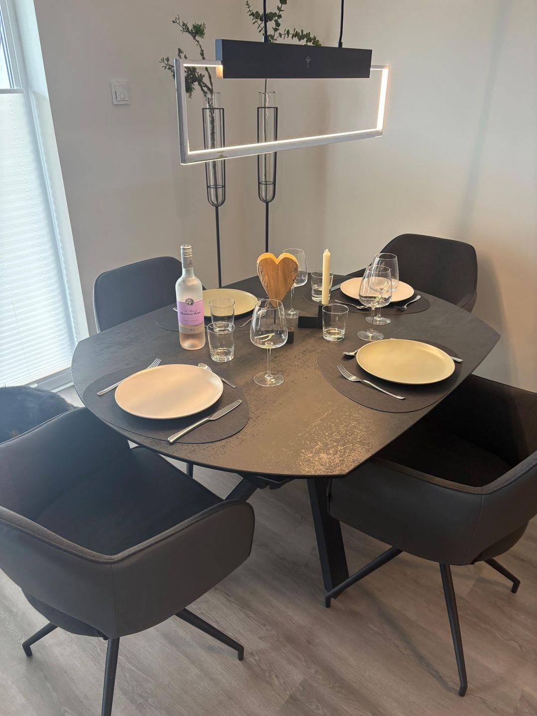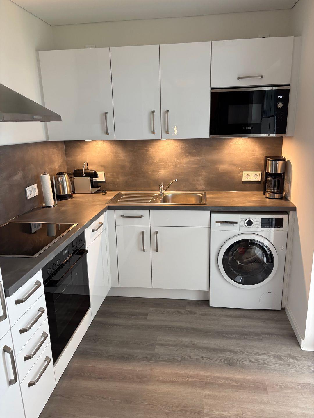 Die moderne, offene Küche mit Induktionsherd, großem Kühlschrank, leiser Geschirrspülmaschine, Espresso- und Kaffeemaschine sowie Mikrowelle und kompletter Küchenausstattung macht das Kochen zum Erlebnis. Ein ausziehbarer Esstisch bietet Dir Platz für gemeinsame Mahlzeiten – perfekt für Genussurlaub oder kulinarische Abende.
